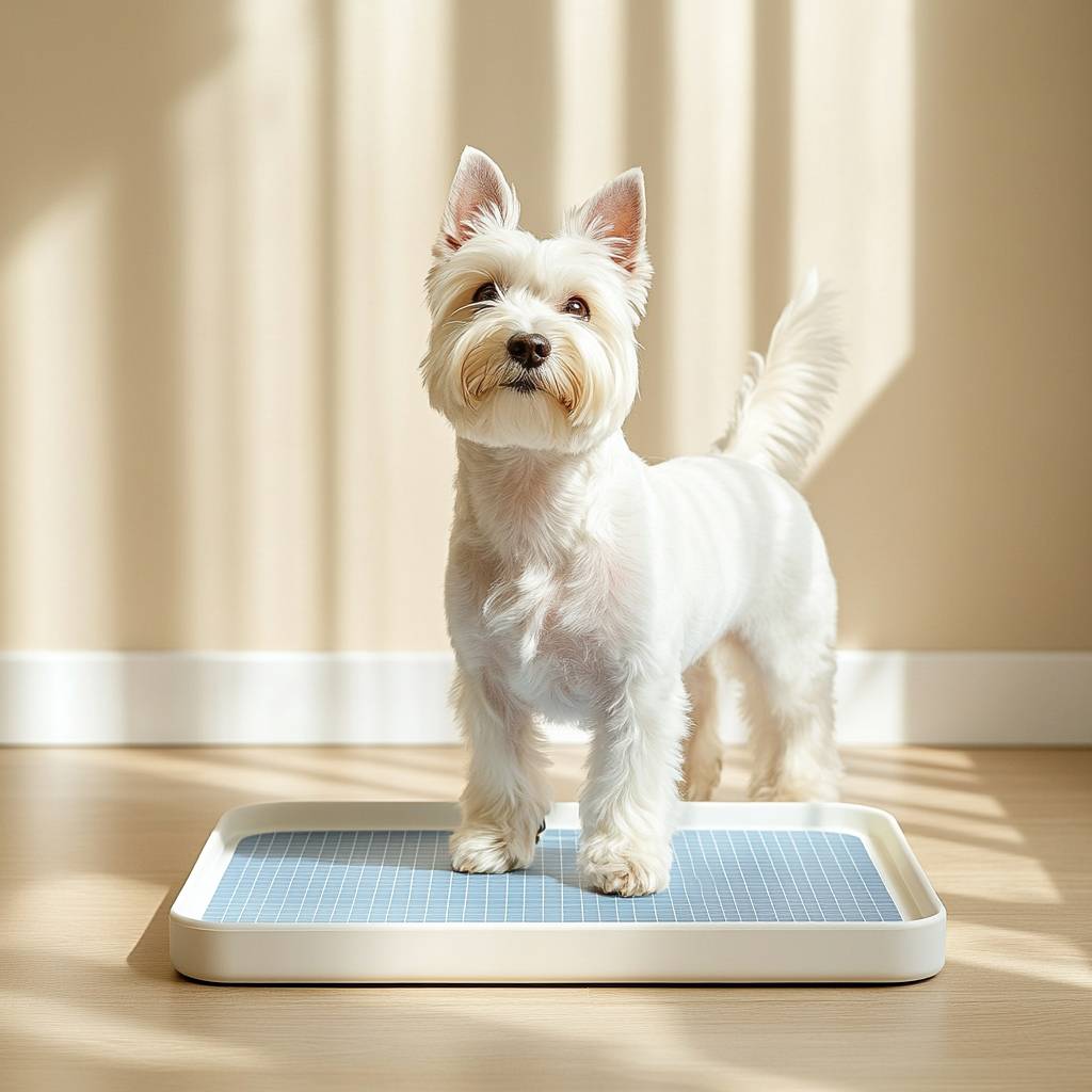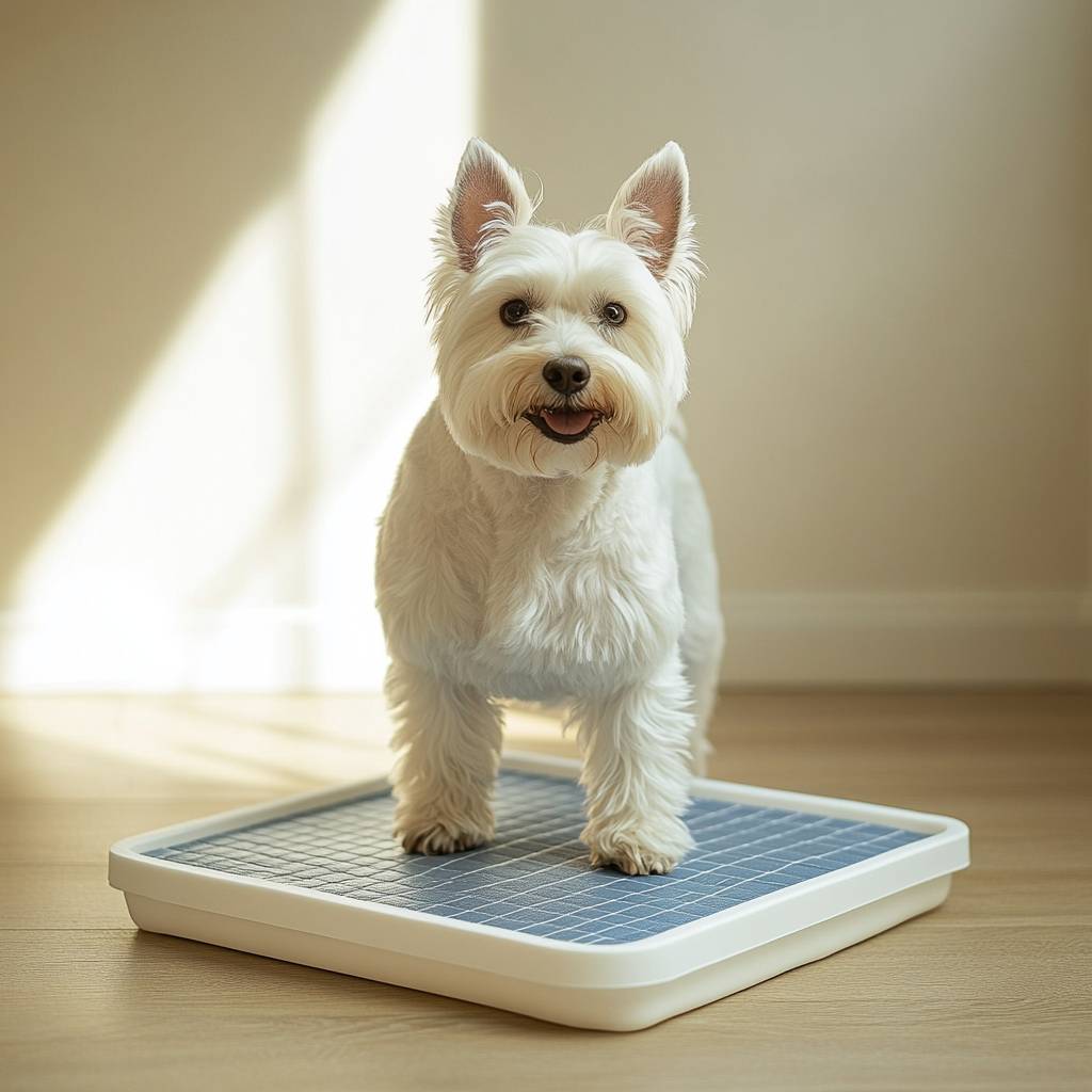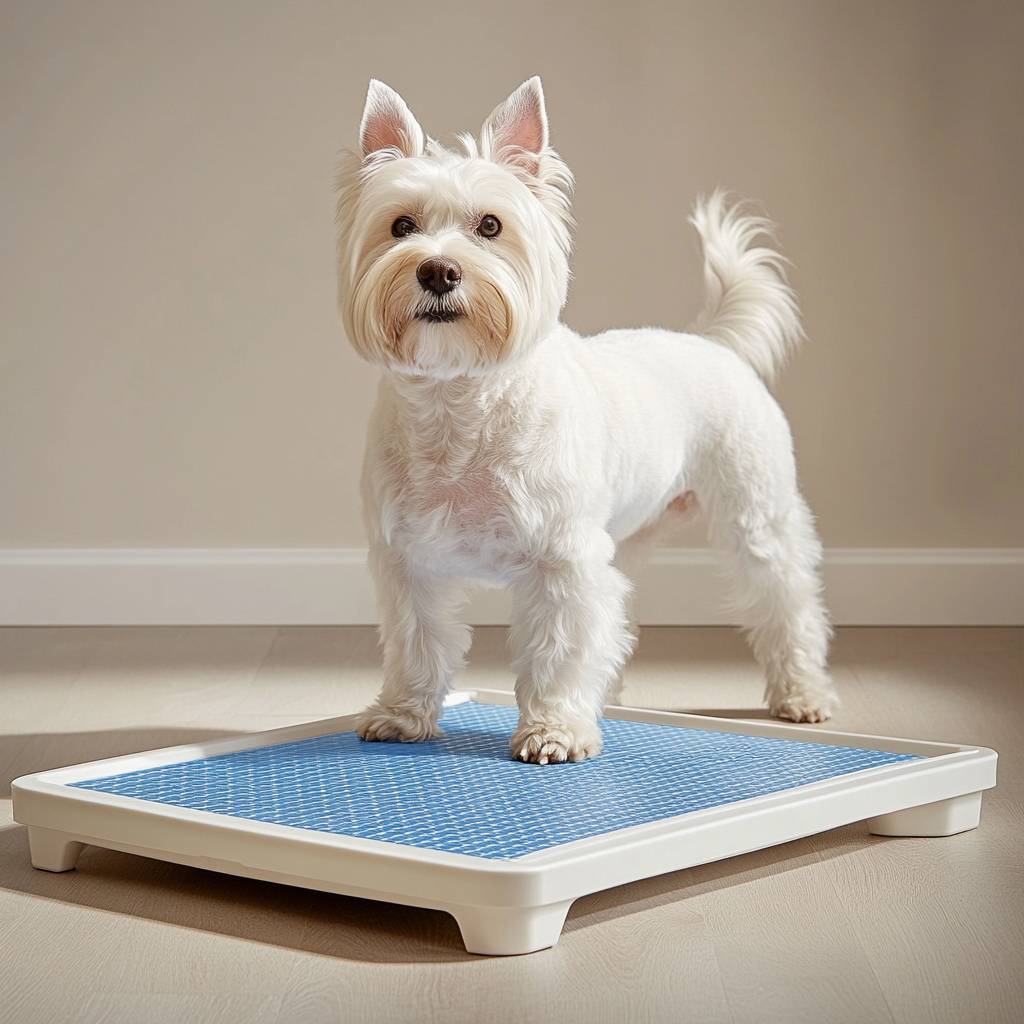 A white west highland white terrier standing on a pet training pad tray in a bright indoor studio setting. The background is clean and minimalist in light beige tones. The tray has a white frame with a blue grid surface,designed for indoor use on wooden flooring. Natural light casts soft shadows on the floor,highlighting the simple structure and functional design of the tray. The composition is clean and straightforward,with a focus on product details. Shot from a 30-degree top-down angle,mid-range perspective,using a 50mm lens with shallow depth of field. The background is slightly blurred,with realistic lighting and texture to emphasize the product's clarity and simplicity, --v 6.1