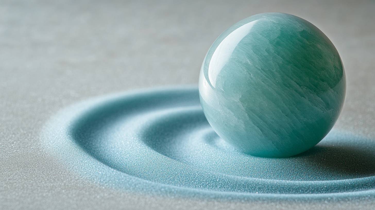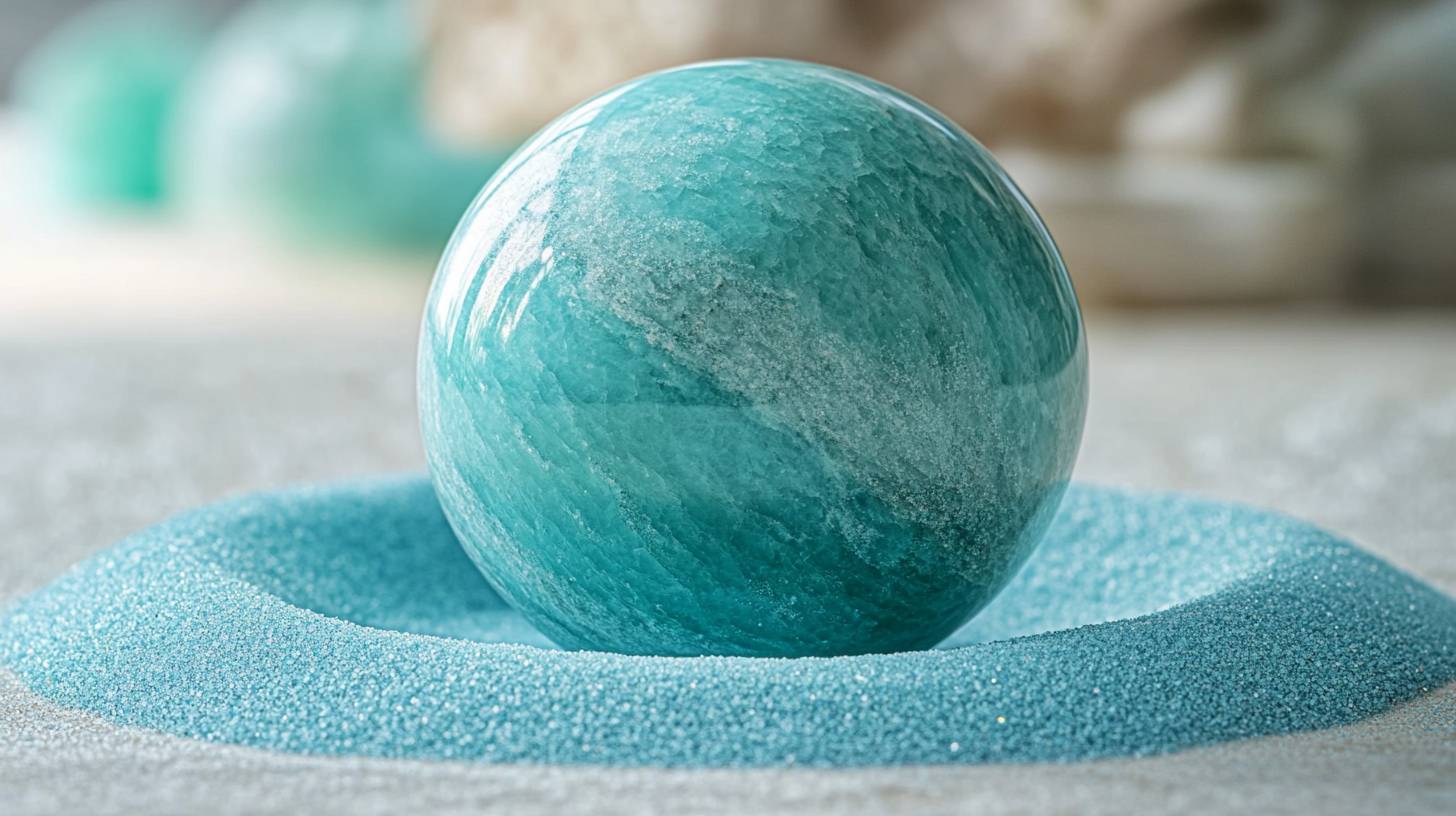 A perfectly round, smooth, hard aqua-blue ball, close-up, pale blue sand continuing in a circle around the stone --no human --ar 16:9 --style raw --stylize 250 --v 6.1