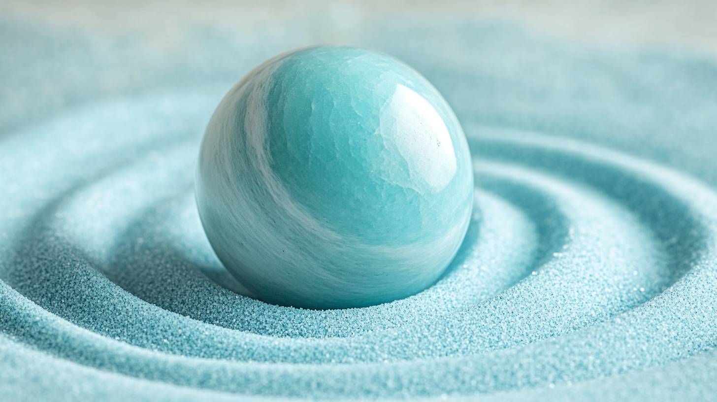 كرة زرقاء مائية متكاملة، ناعمة وصلبة، في لقطة مقربة، مع رمال زرقاء باهتة تستمر في دائرة حول الحجر.