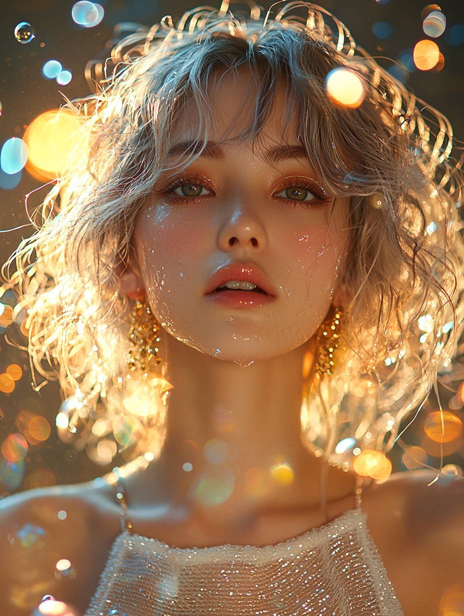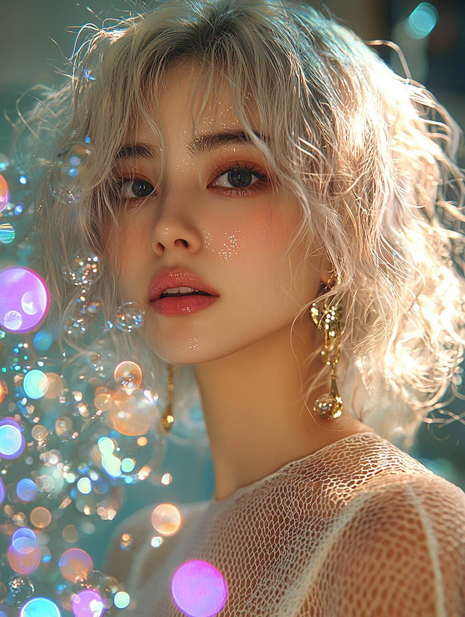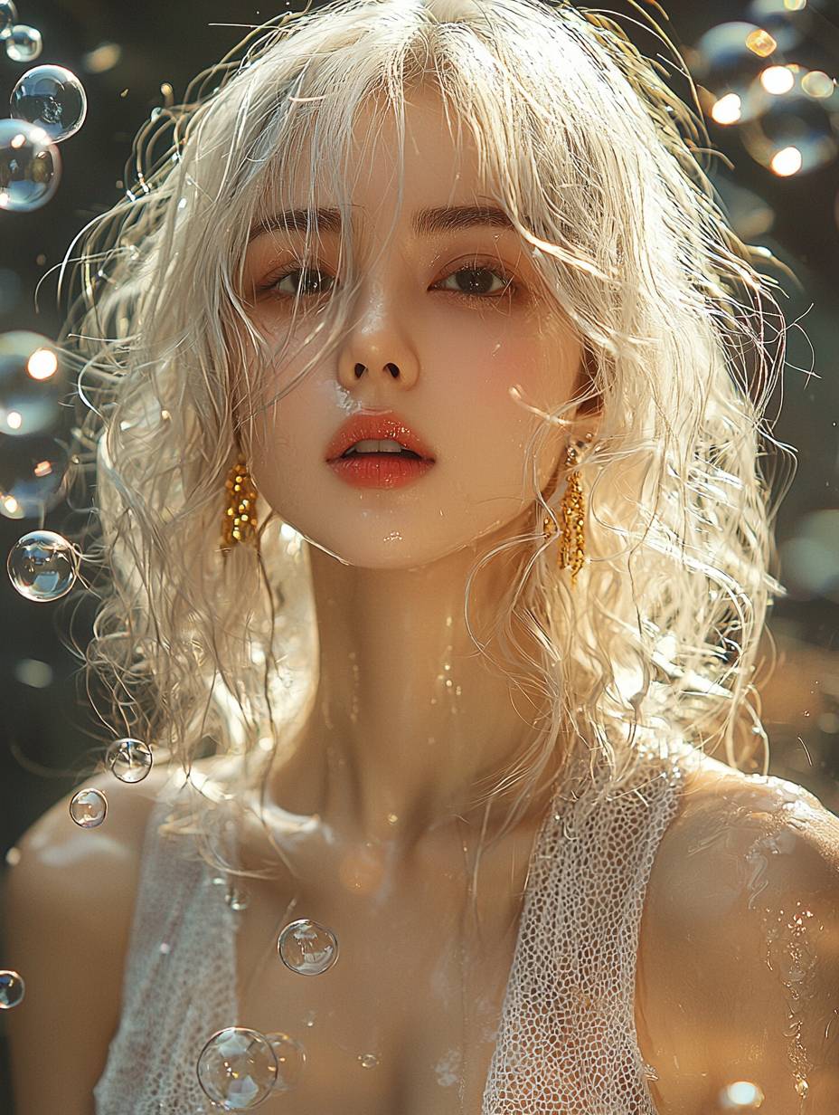 freshideas cinematographic, documentary, film, cinematography ,polaroid style,a lovely chinese girl, with curly shoulder length silver white hair, light cyan eyes, golden eye shadow, pink lips and powder blusher, lively and youthful makeup, many color bubbles in the background. wearing elegant gold earrings, a white mesh dress, sparkling bubbles, and shimmering rainbow water reflections adds an overall sense of mystery and beauty. polaroid film photography,,in clothes --ar 3:4 --quality 2 --stylize 800 --v 6.1