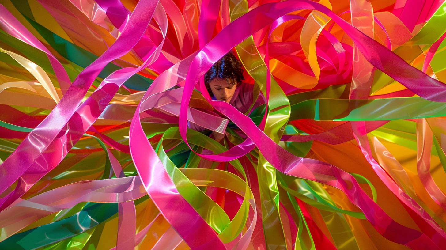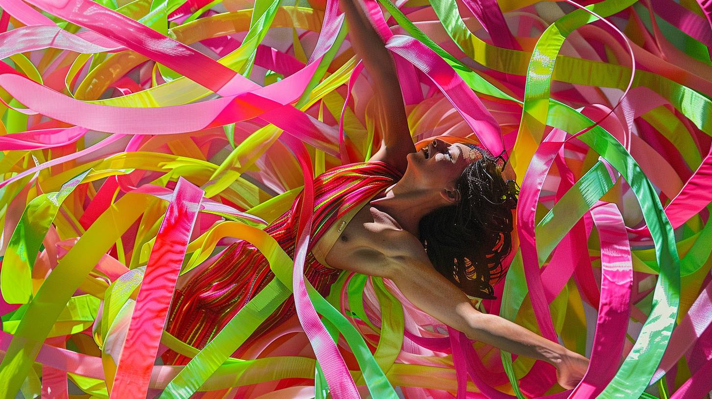 The artist in 'Vibrant Vortex', immersed in a swirling, lively, kaleidoscope of vibrant, colorful ribbons - a playful, whimsically chaotic dance of energetic movement, immersed in a sea of electrifying pink and neon green. --ar 16:9 --v 6.0