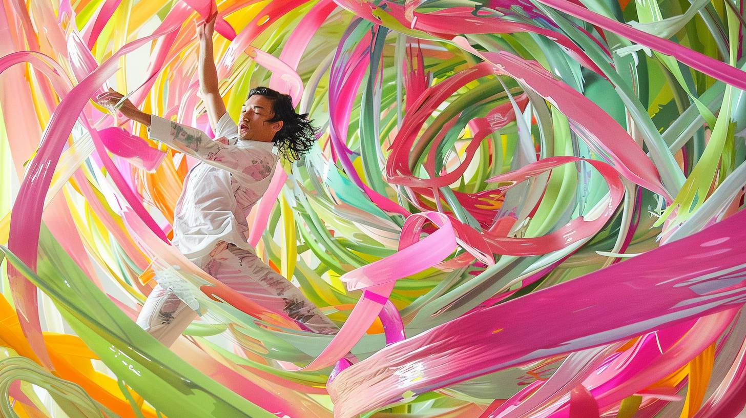 الفنان في 'دوامة نابضة' مغمور في رقصة ملونة تدور من الحركة النشيطة في بحر من الشرائط الوردية المتوهجة والأخضر النيون.