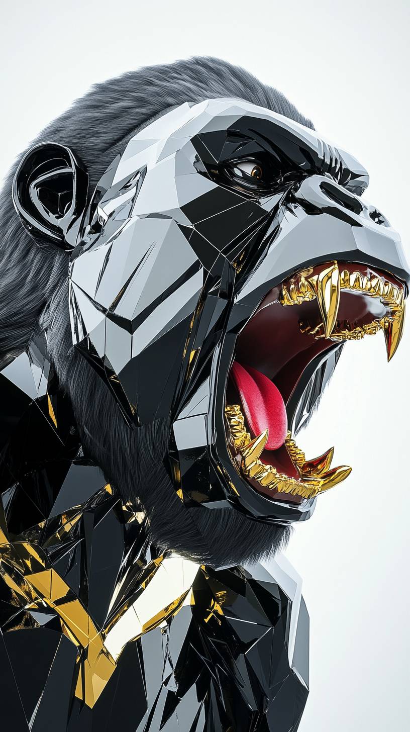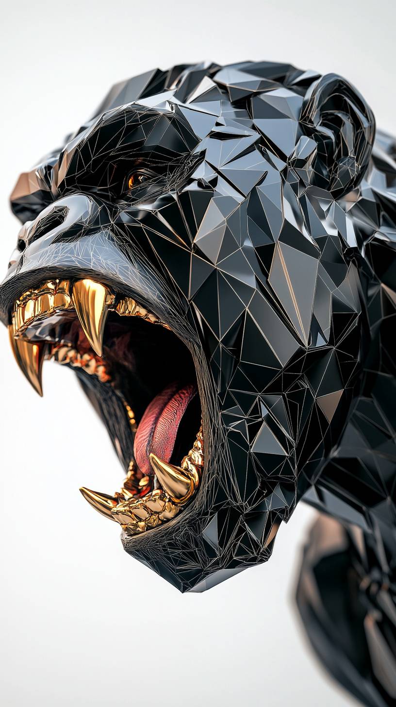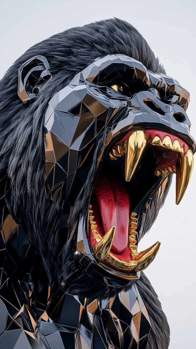 A black and gold gorilla head made of geometric shapes, with sharp teeth and a red tongue, is roaring against a white background in a close-up shot. It is a 3D rendering digital art with high resolution, hyper-realistic and sharp details. The artwork has a dark theme with a gray color tone and a black monochrome color scheme in a futuristic style. It has sharp focus on a full body portrait in the style of octane render with bright light and a symmetrical composition. The artwork was taken with an ultra wide angle lens and has depth of field from a side view. --ar 9:16 --v 6.1