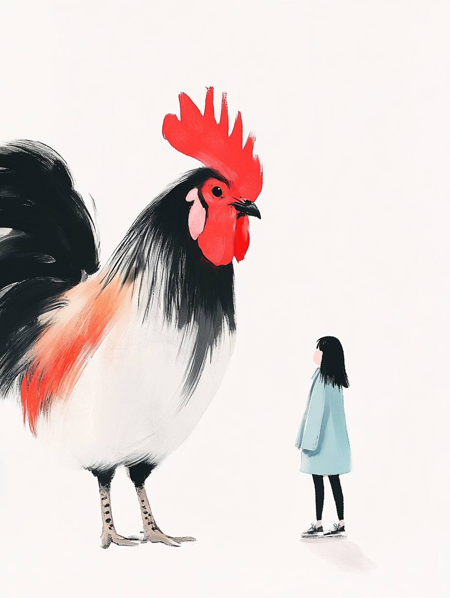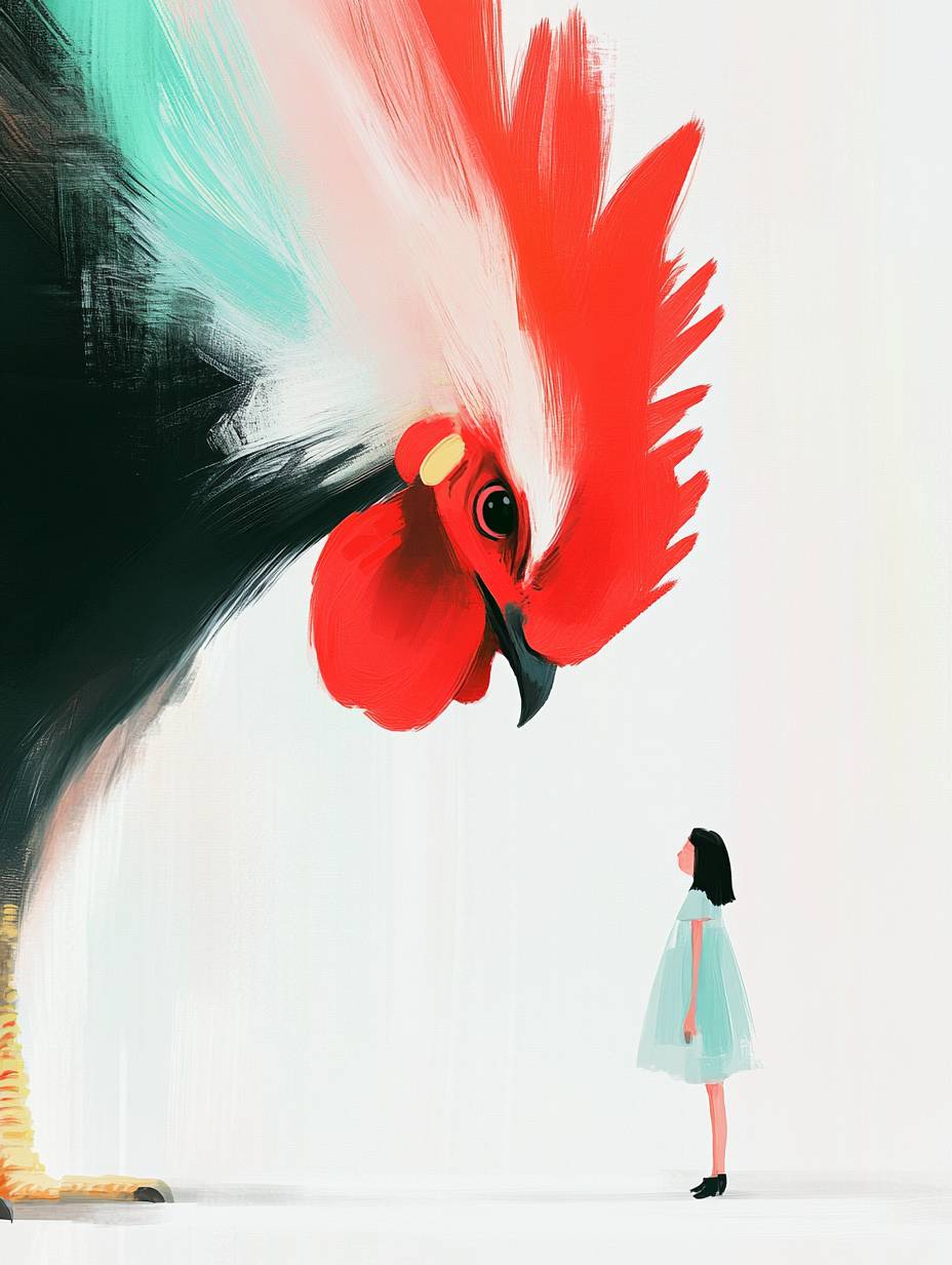 A large rooster with red and black feathers stands next to the young girl, featuring exaggerated brushstrokes, a colorful ink painting style, exaggerated contrast between light and dark, a white background, and pure colors. This is an illustration with high resolution and high detail, in an ultra-high definition style. --ar 3:4 --personalize fshgid6 --v 6.1