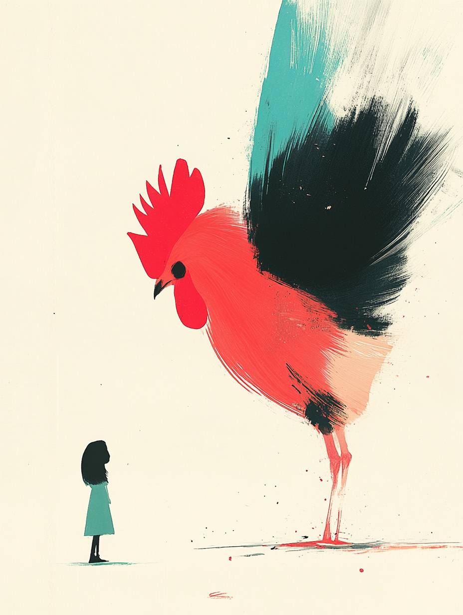 ديك كبير ذو ريش أحمر وأسود يقف بجوار الفتاة الصغيرة، مع ضربات فرشاة مبالغ فيها وأسلوب رسم ملون، على خلفية بيضاء بدقة ووضوح عالٍ.