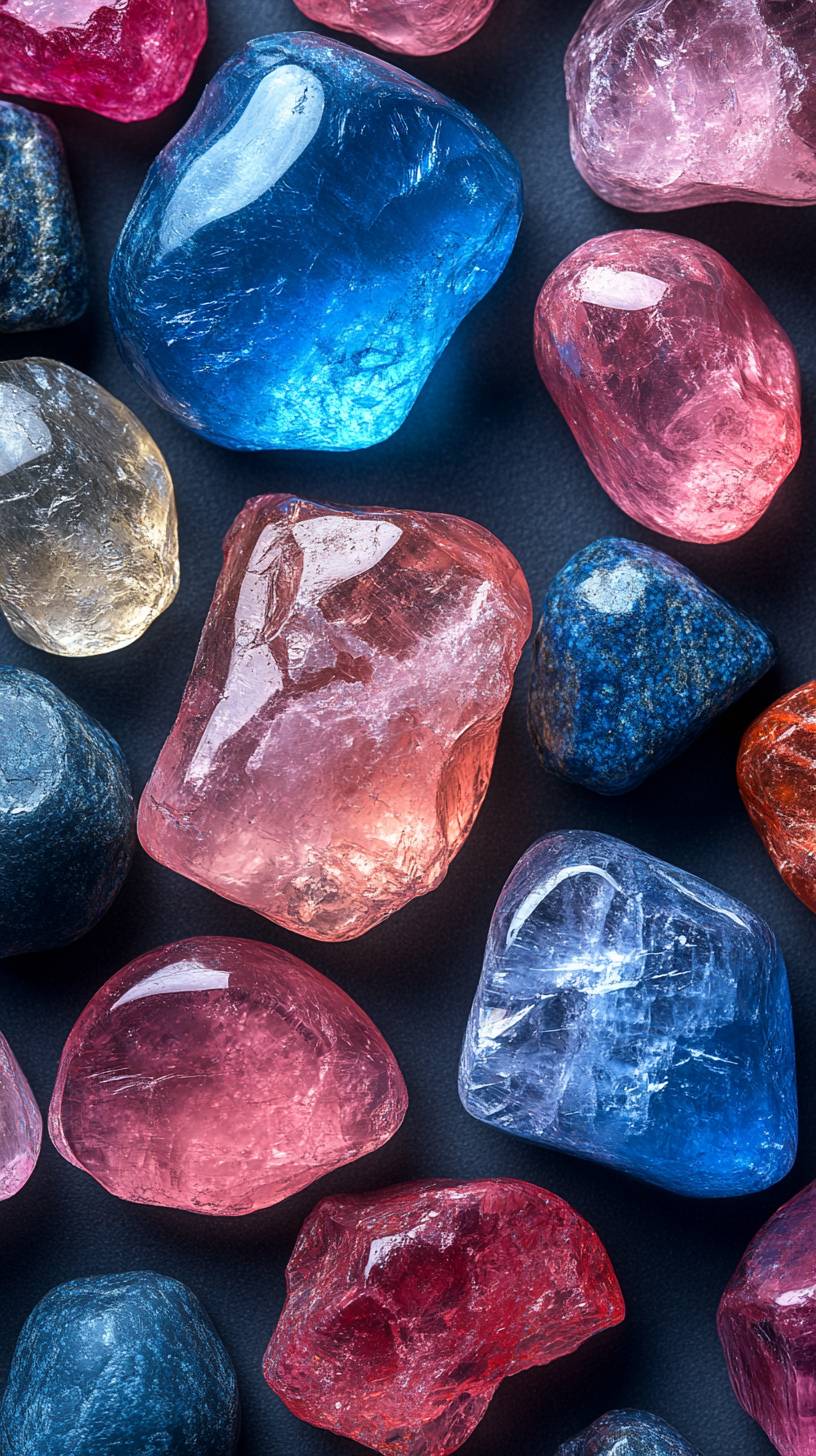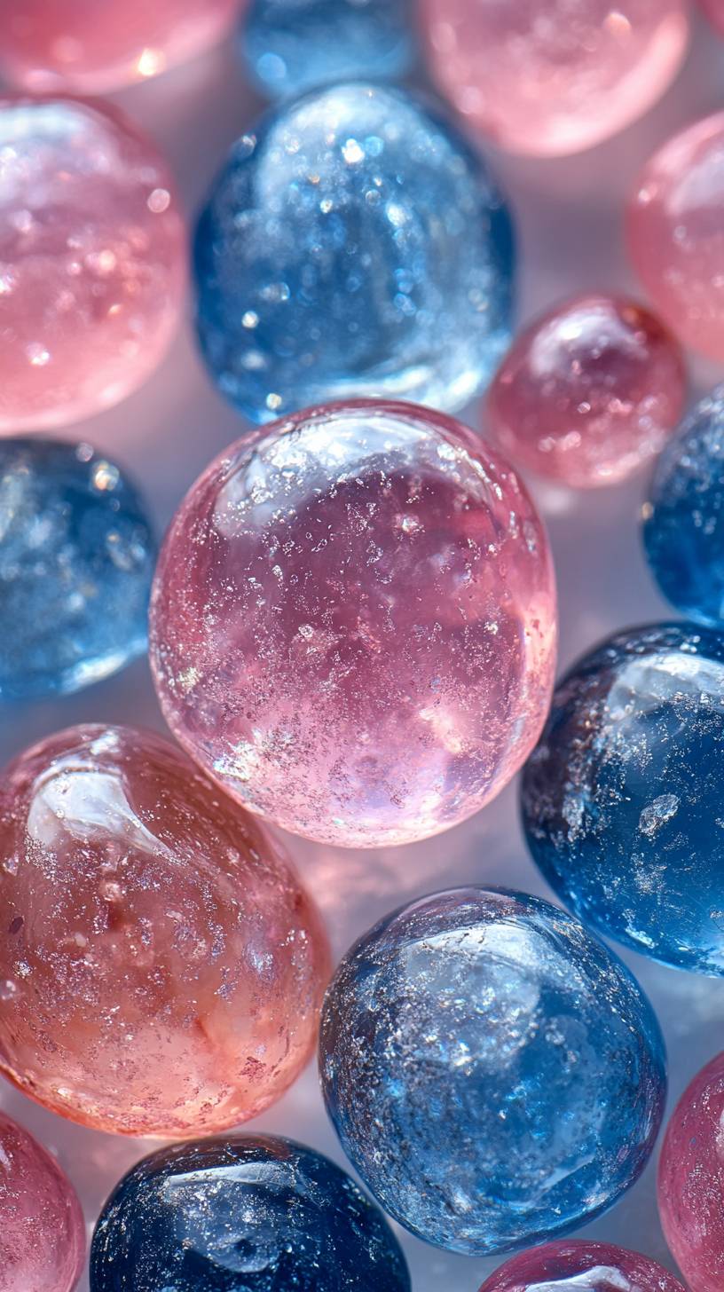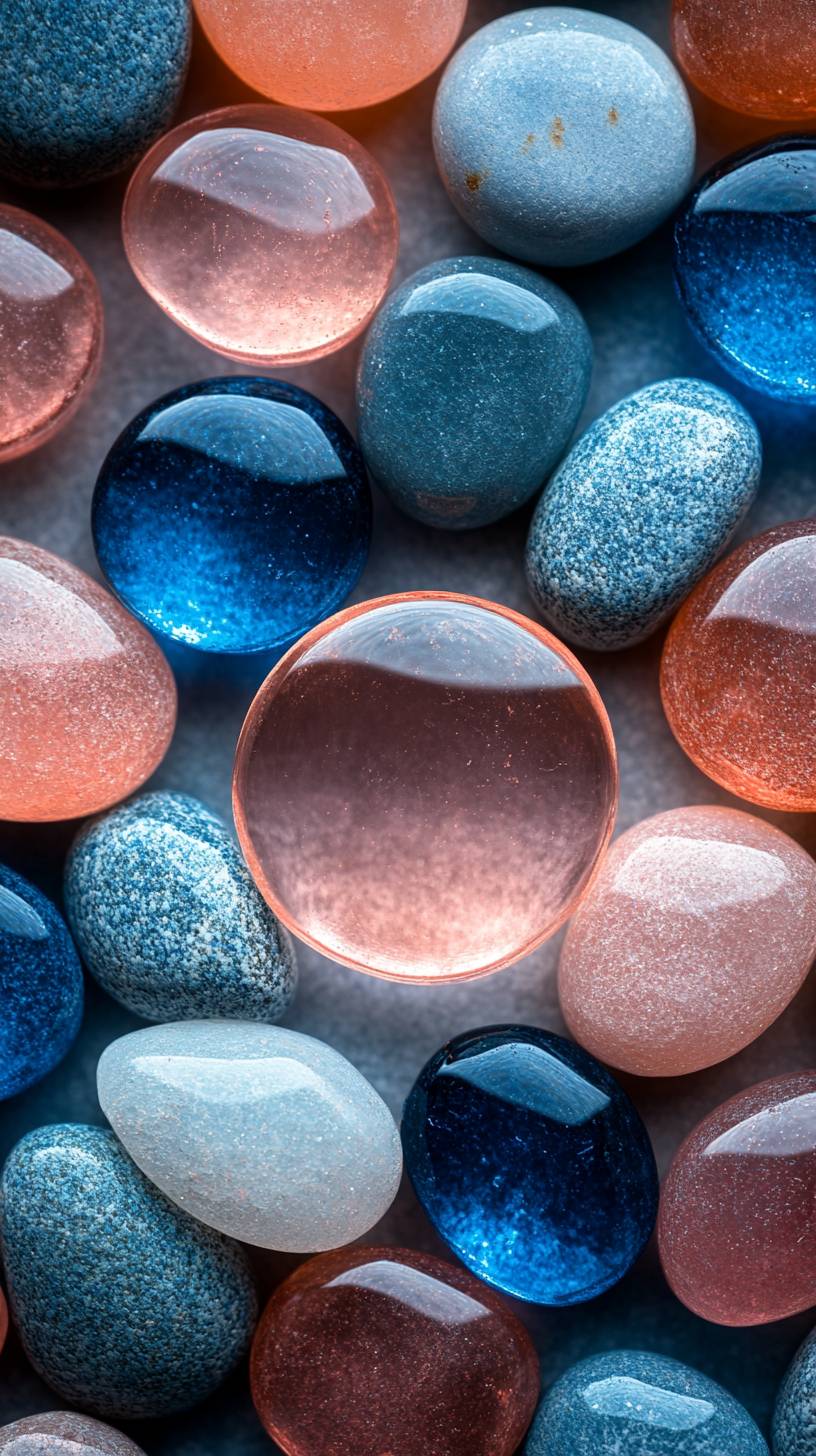 حصى شفافة ملونة بأسلوب النقاط، مع أنماط فسيفسائية زرقاء ووردية، تُعرض بجودة عالية الوضوح 8K.