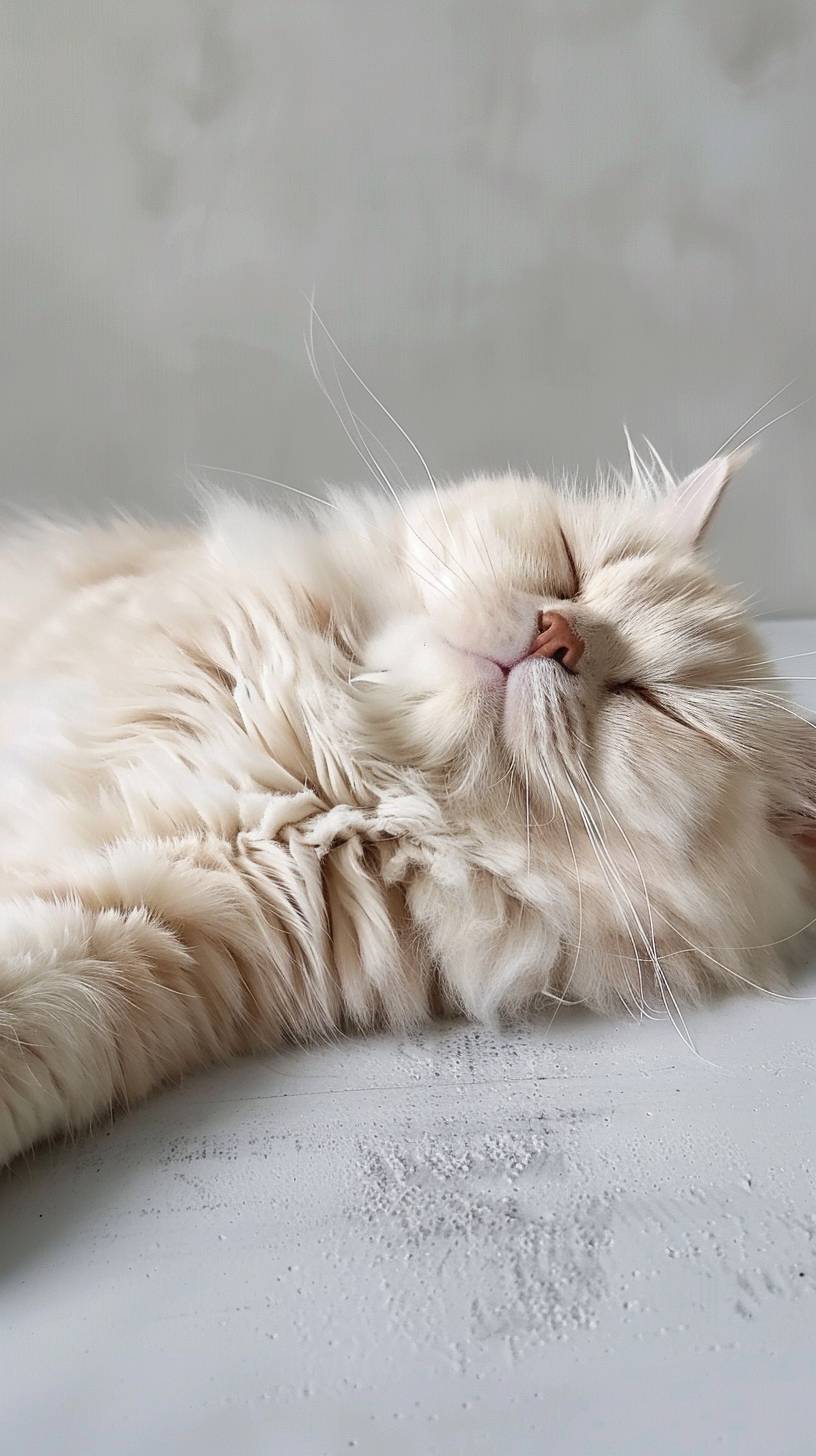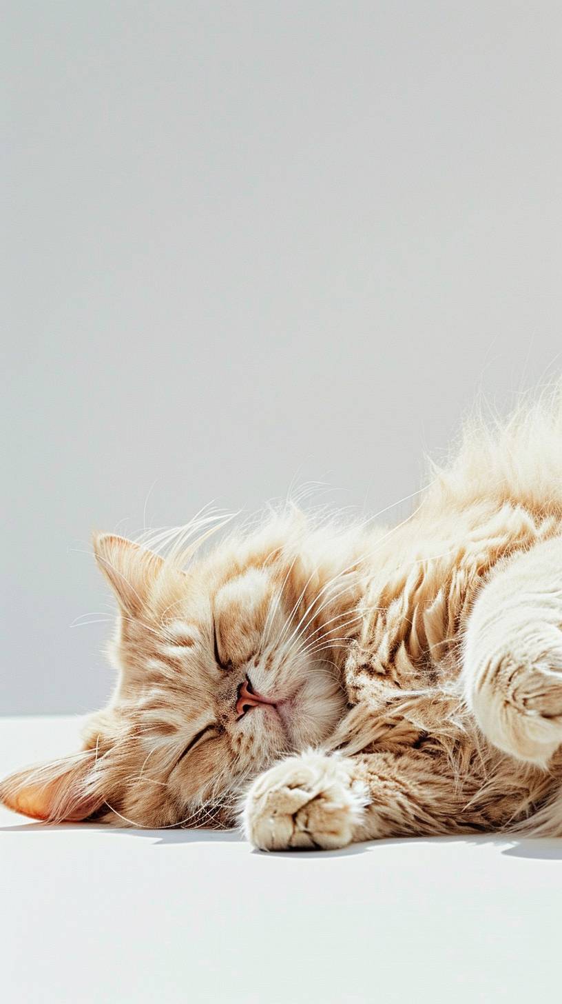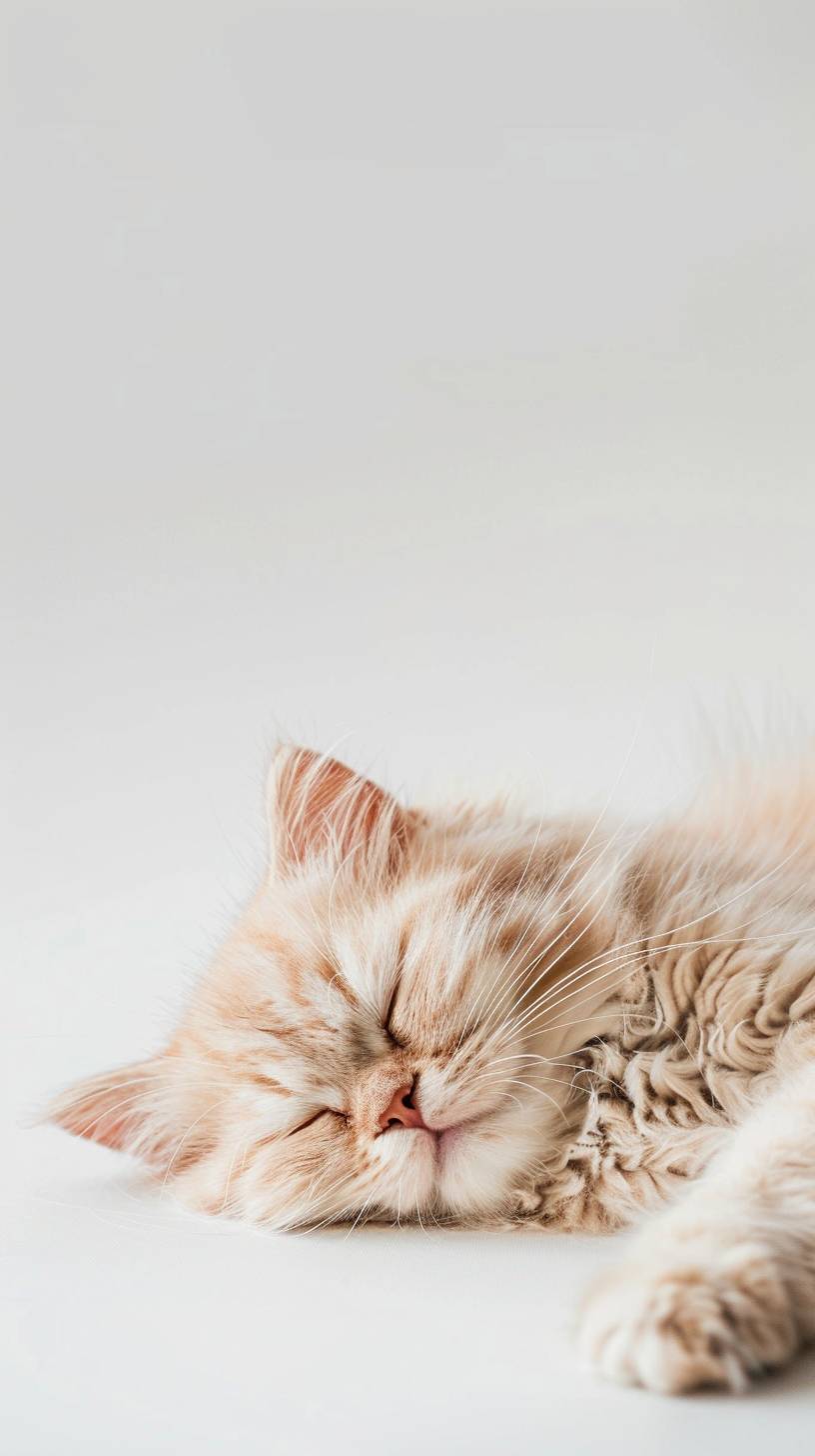 Half-body portrait, a light yellow Persian cat, medium shot, dynamic pose, lying on the ground sleeping, happy, real photo, white background, solid color background, pet photography, real shooting. --ar 9:16 --v 6.0