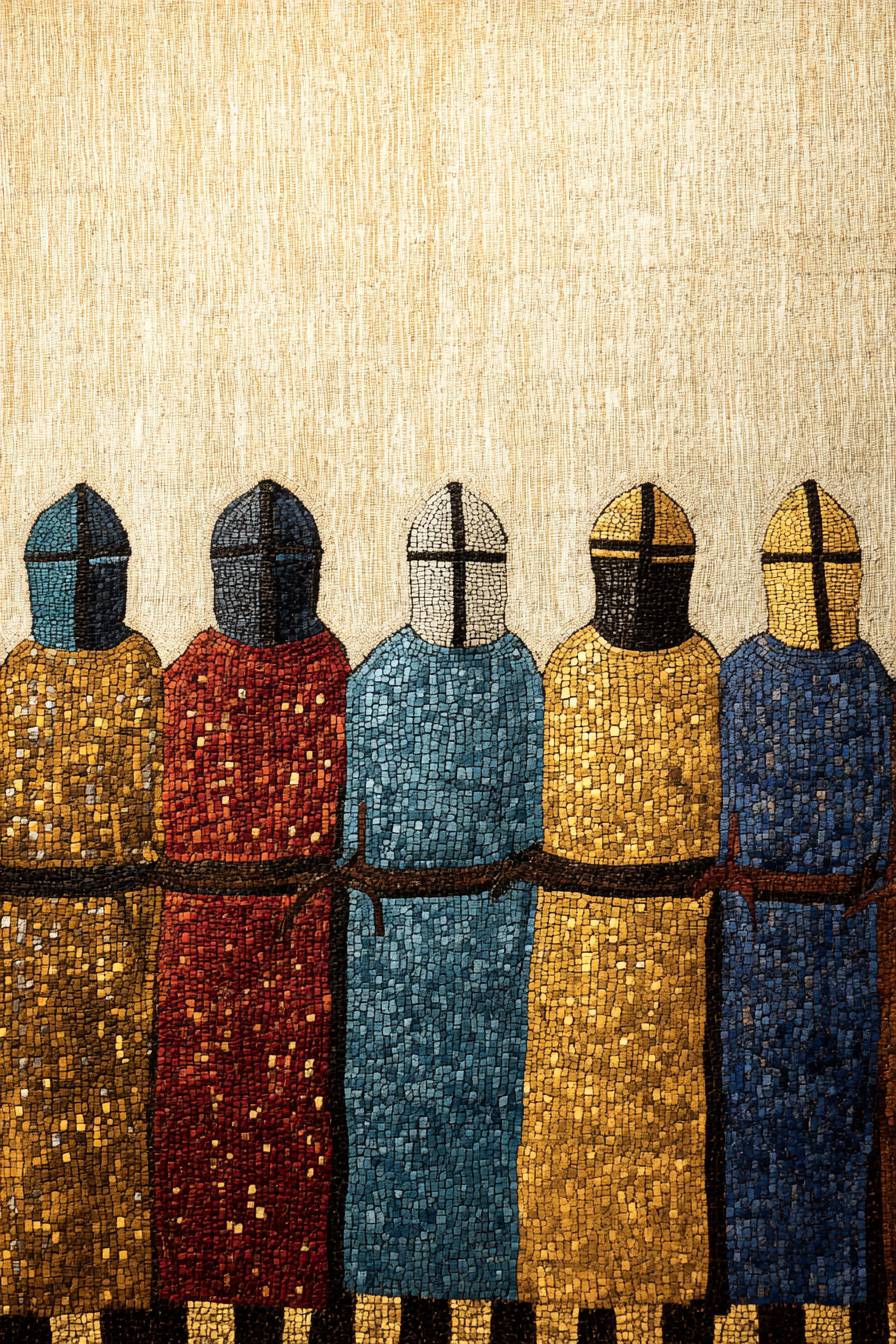bayeux tapestry - bygone era of heroes and beasts, anime aesthetics, high contrast, intriguing and endeering, iridescent, gold and silver --ar 2:3 --style raw --personalize h6yp1lp --stylize 200 --v 6.1