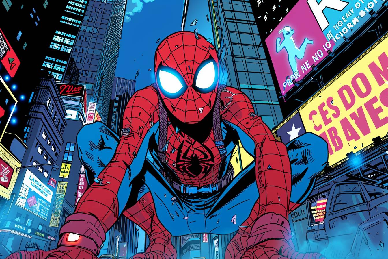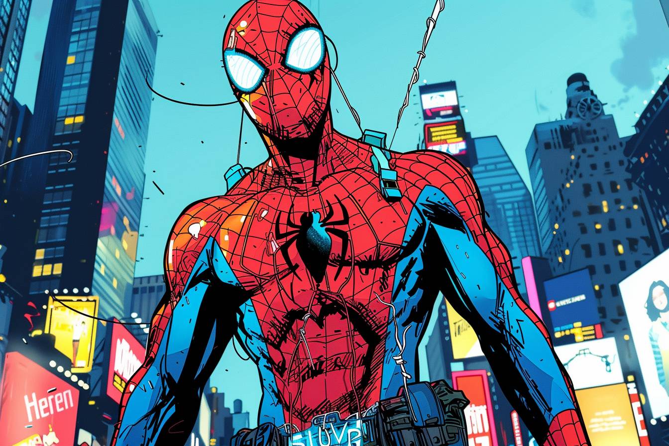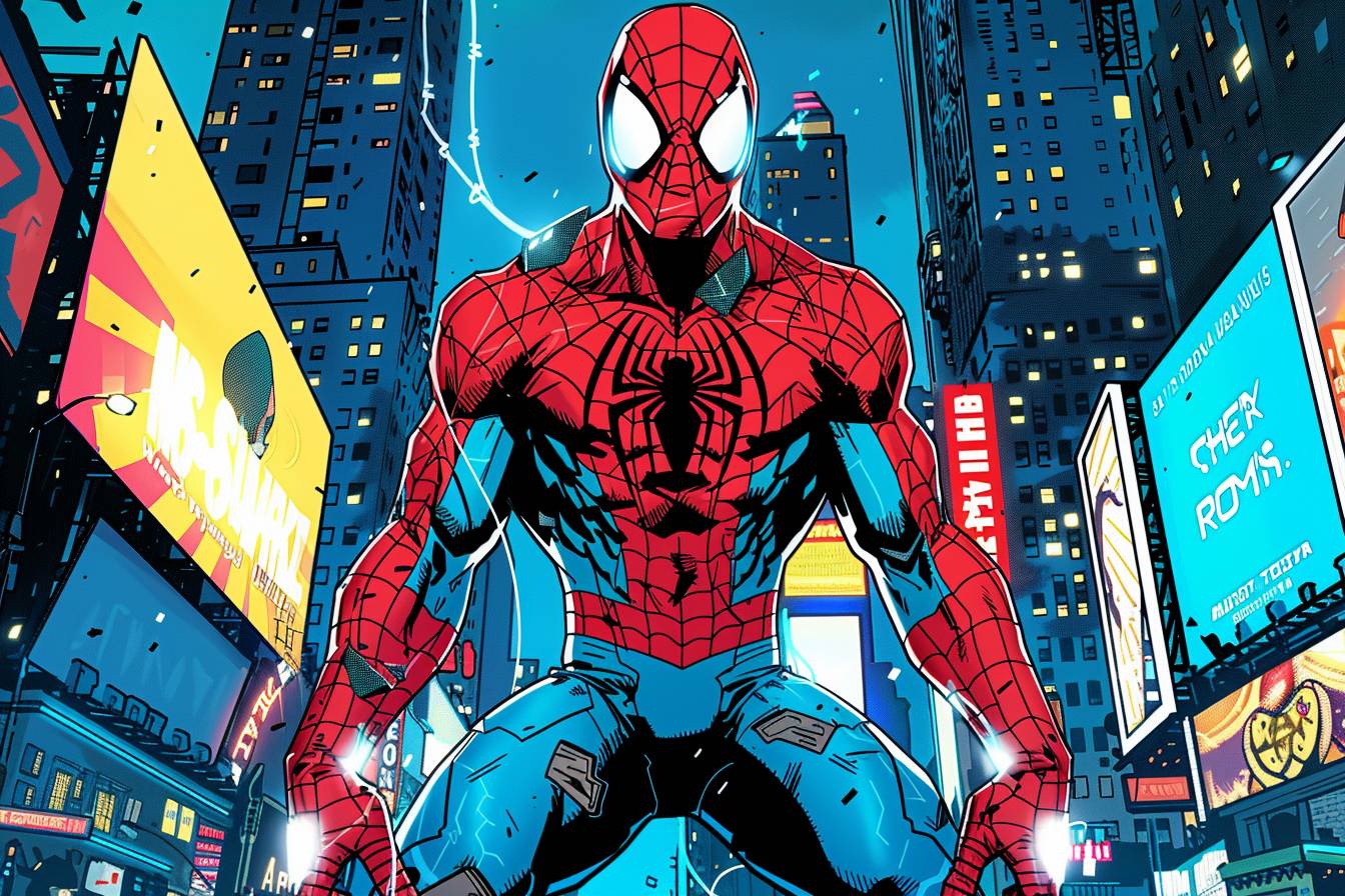 بطل خارق قوي ومصمم بحزم يتمتع ببنية عضلية، يرتدي بدلة ضيقة حمراء وزرقاء مع شعار عنكبوت بارز على صدره. لديه قناع يغطي وجهه، مع عيون بيضاء وأنماط تشبه الشبكة. الخلفية عبارة عن منظر حضري مزدحم مع ناطحات سحاب شاهقة ولوحات إعلانات مضاءة. وقفته بطولية، مع رفع إحدى قدميه كما لو كان مستعدًا للقفز إلى العمل. الأسلوب ديناميكي ومليء بالحركة، يشبه رسم الكوميك بخطوط جريئة وألوان زاهية.