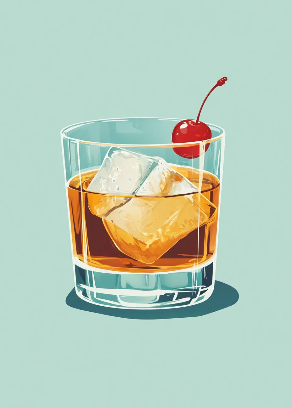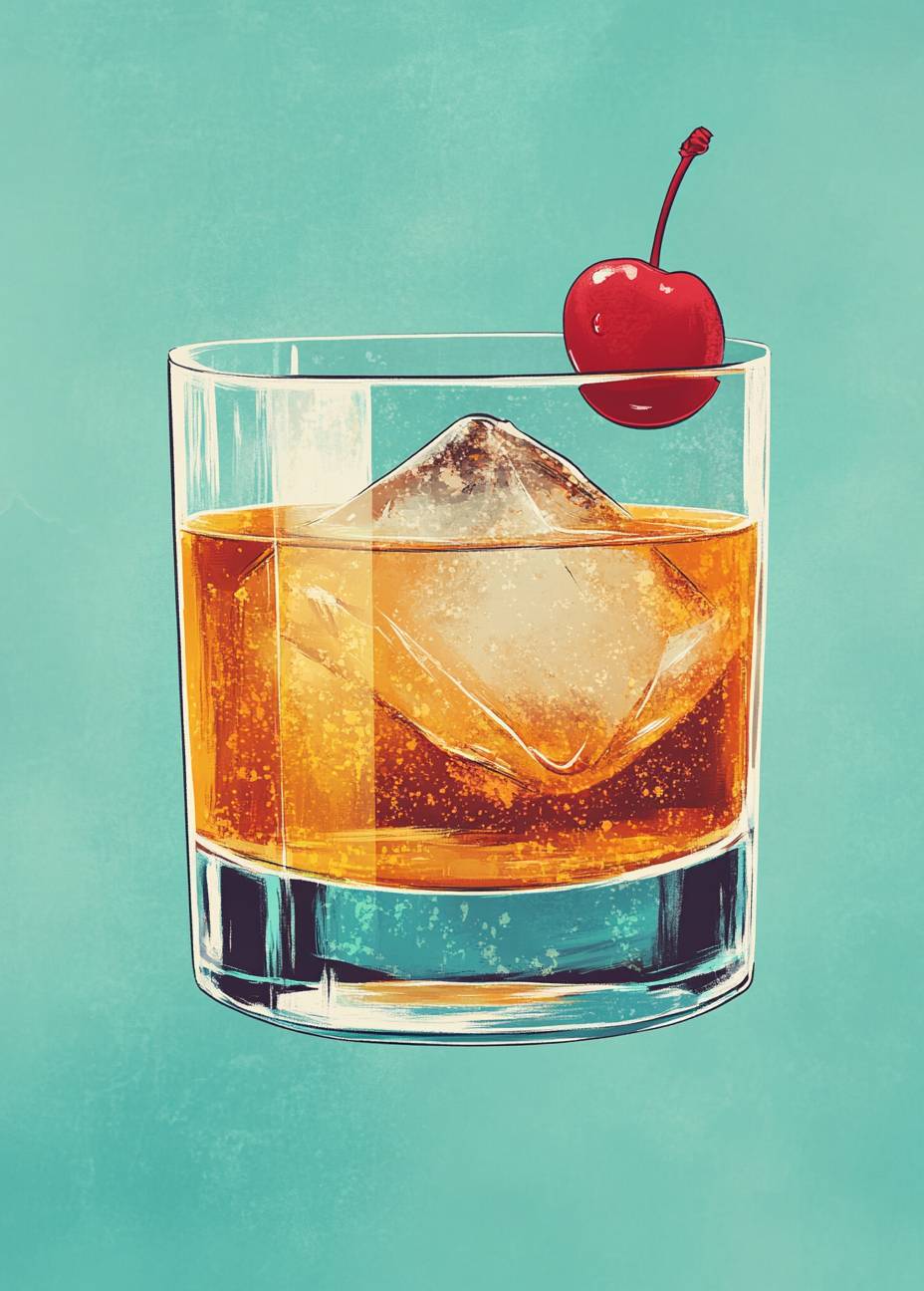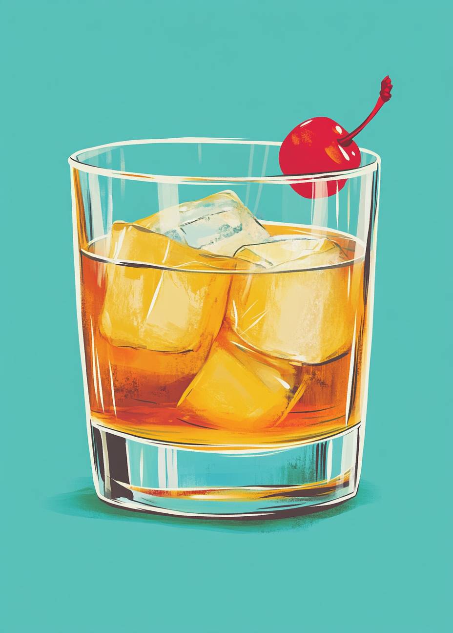 An illustration of the Old Fashioned cocktail, featuring whiskey and orange juice with ice cubes in its glass. The drink is garnished with a single cherry in the top right corner, presented against a teal background. Emphasize clean lines and bold colors to highlight each element clearly for easy iconography or branding purposes. Ensure that all elements fit within a square frame, creating a visually appealing composition suitable as a clipart on a flat color backdrop. --ar 13:18 --v 6.1