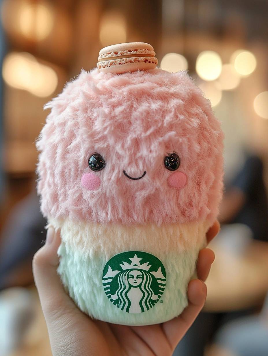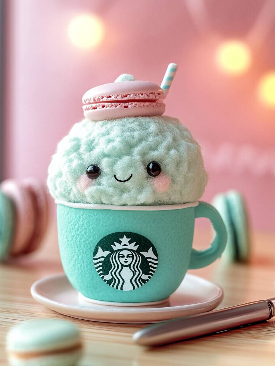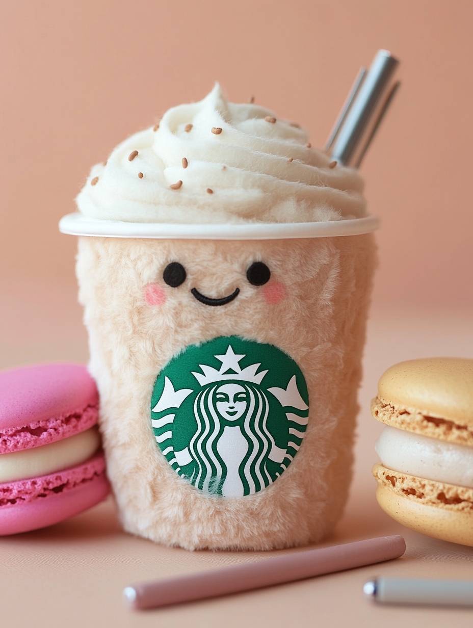 كوب قهوة لاتيه ستاربكس الفروي اللطيف مع عيون وفم بلون الماكرون.