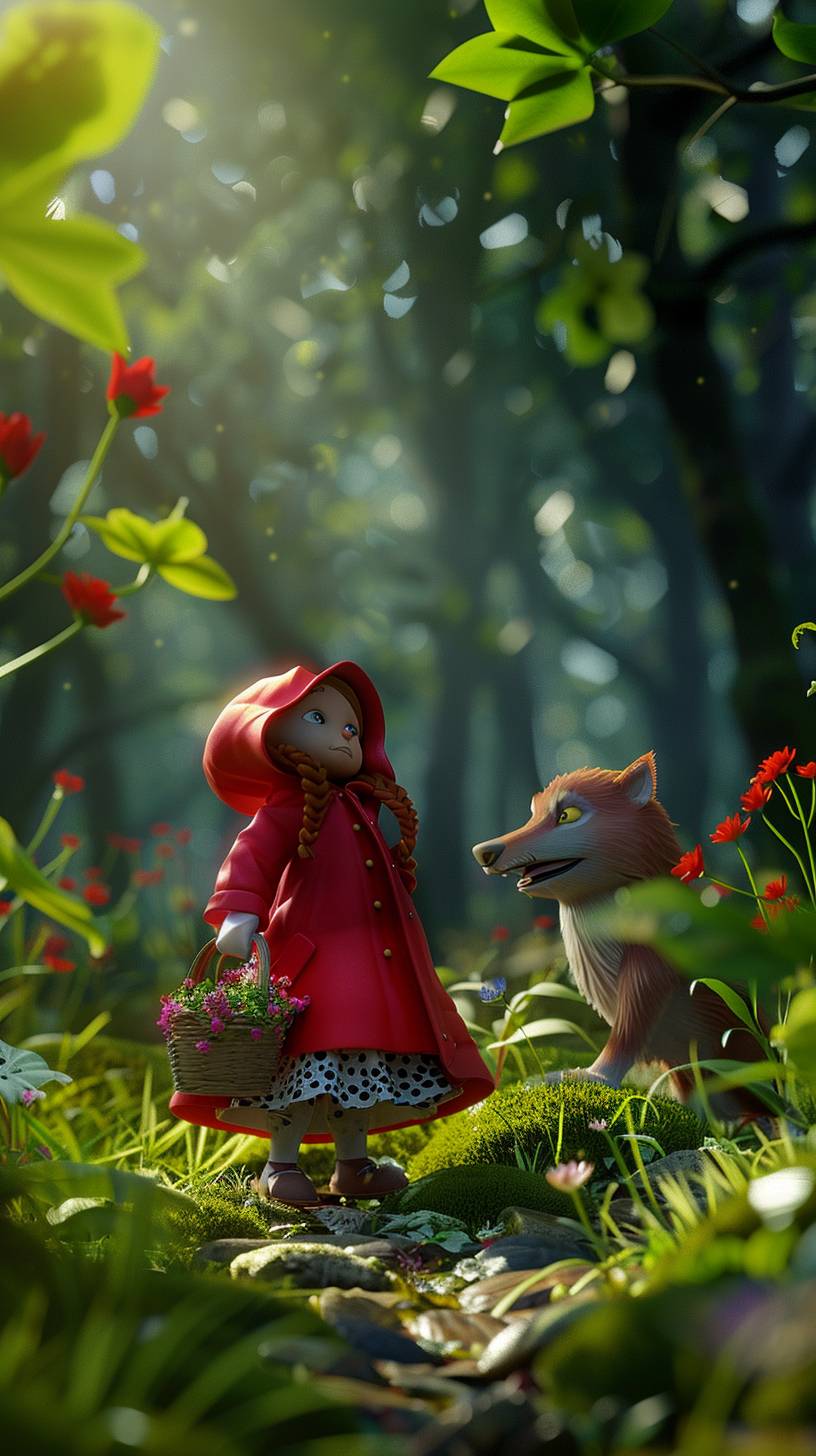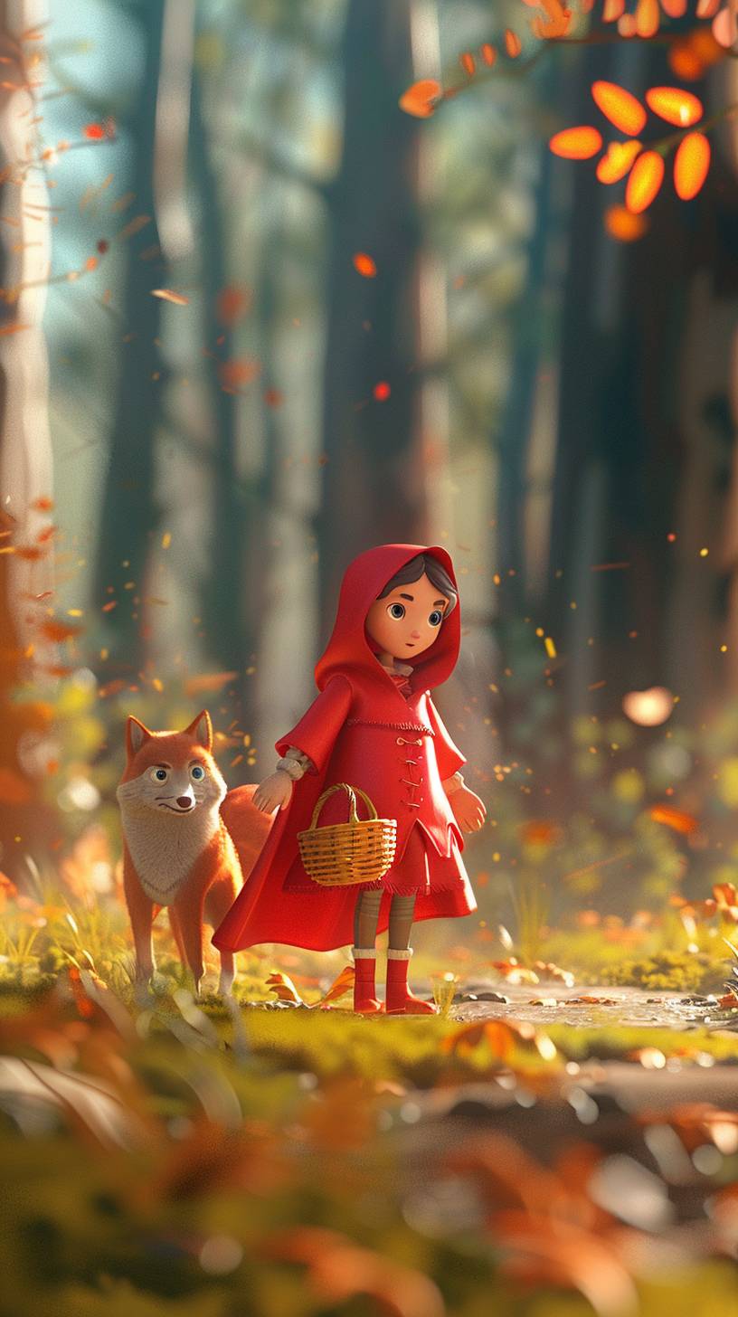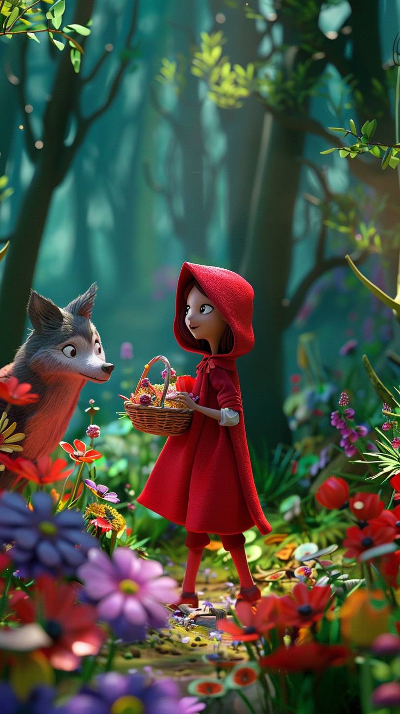 3D render of Little Red Riding Hood in an enchanted forest, Disney character style. The scene is cheerful and whimsical, with vibrant colors and playful elements. Little Red Riding Hood wears her iconic red cloak and carries a basket, while the Wolf is depicted in a friendly, mischievous manner. The forest is magical and lively, full of bright, inviting details, empty space for advertising text, 4k, --ar 9:16 --v 6.0