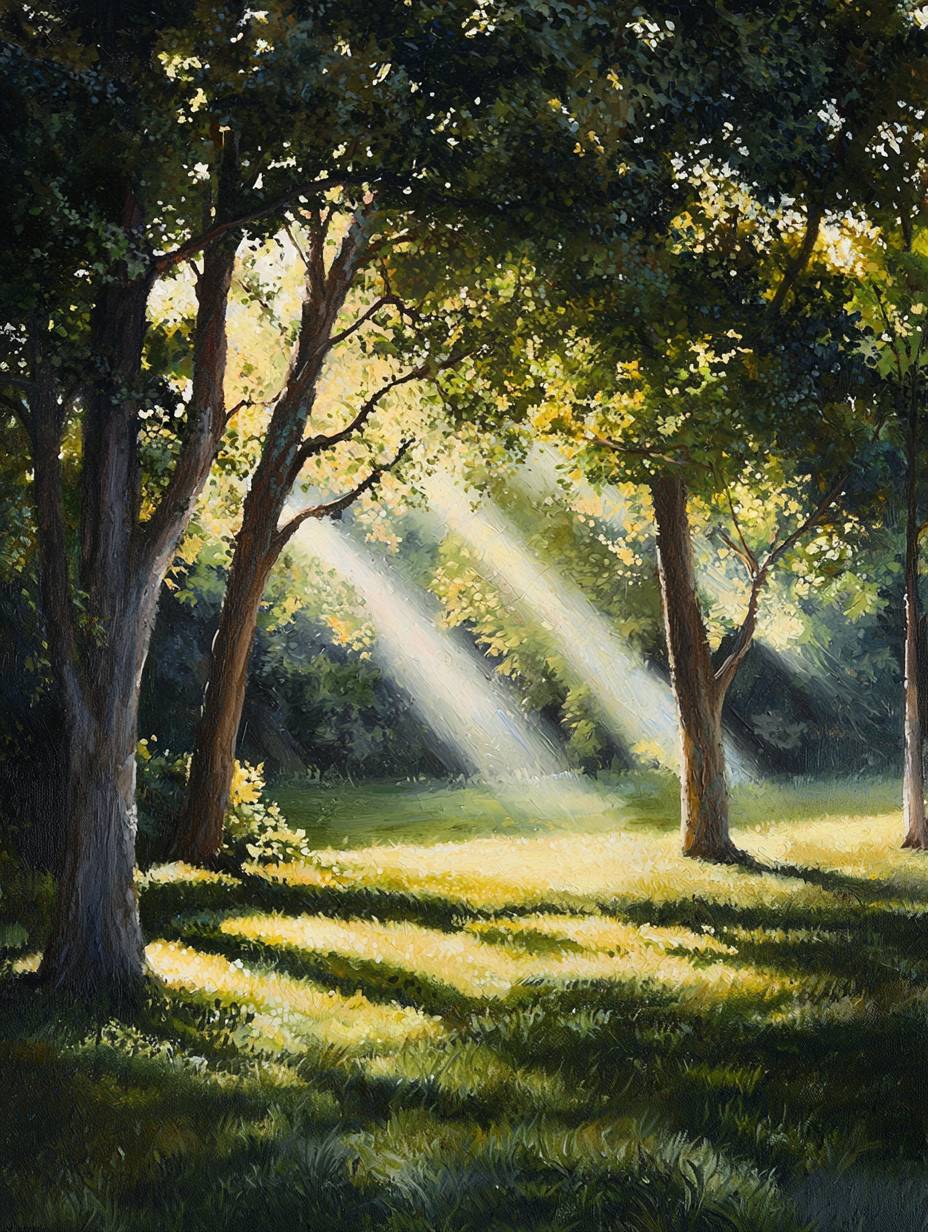 يظهر تأثير تيندال أشعة الشمس المتسللة من خلال الأشجار، مما يخلق مشهدًا هادئًا ومنسجمًا.