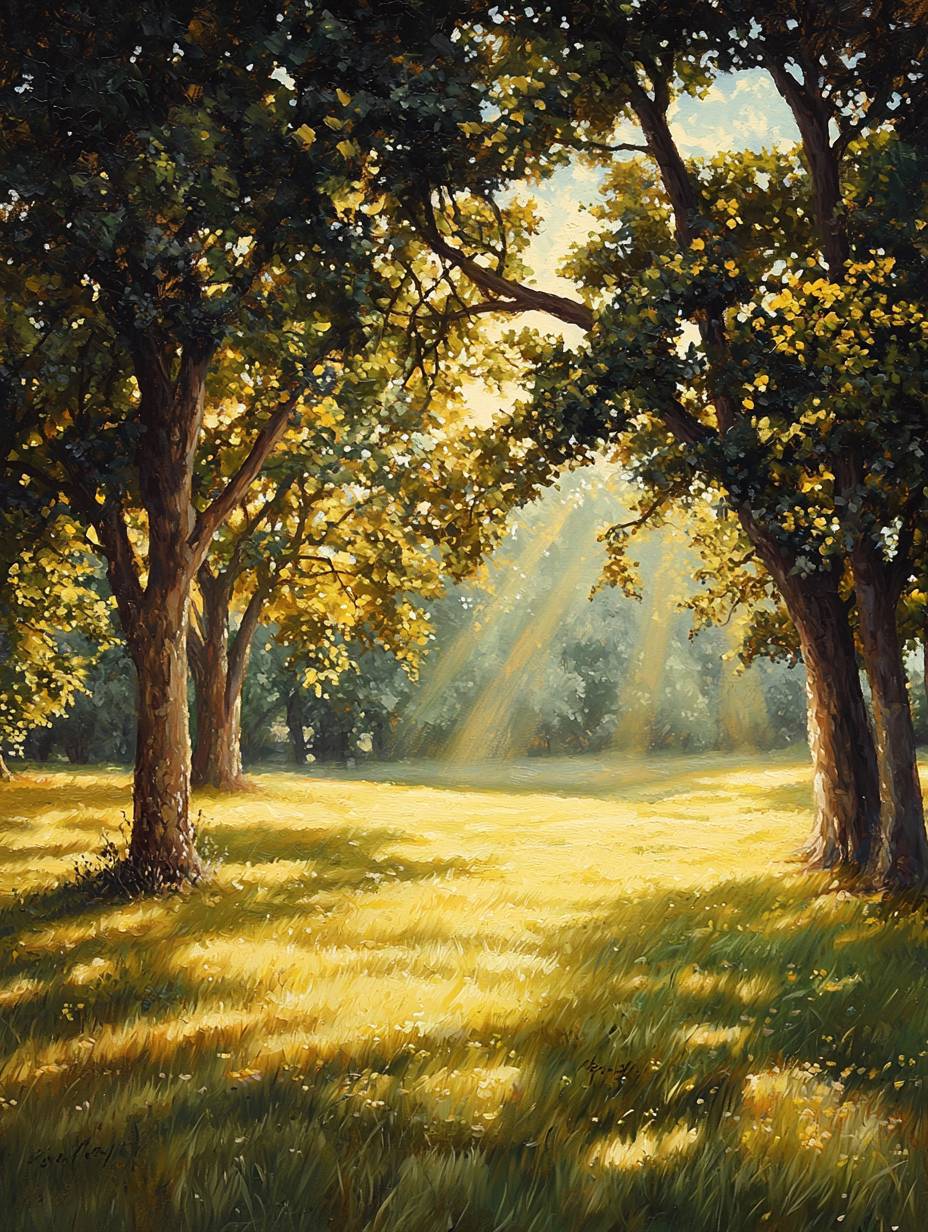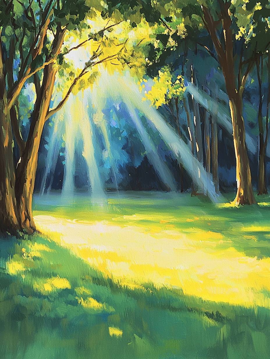 تأثير تيندال، الأشجار، المراعي، ضوء الشمس، الإحساس الجوي. مشهد هادئ مع ظهور تأثير تيندال حيث يتسلل ضوء الشمس عبر الأشجار، مكونًا أشعة ناعمة على العشب. الجو يبعث على الدفء والترحاب، مما يسلط الضوء على التفاعل بين الضوء والظل لخلق بيئة ساحرة وهادئة.