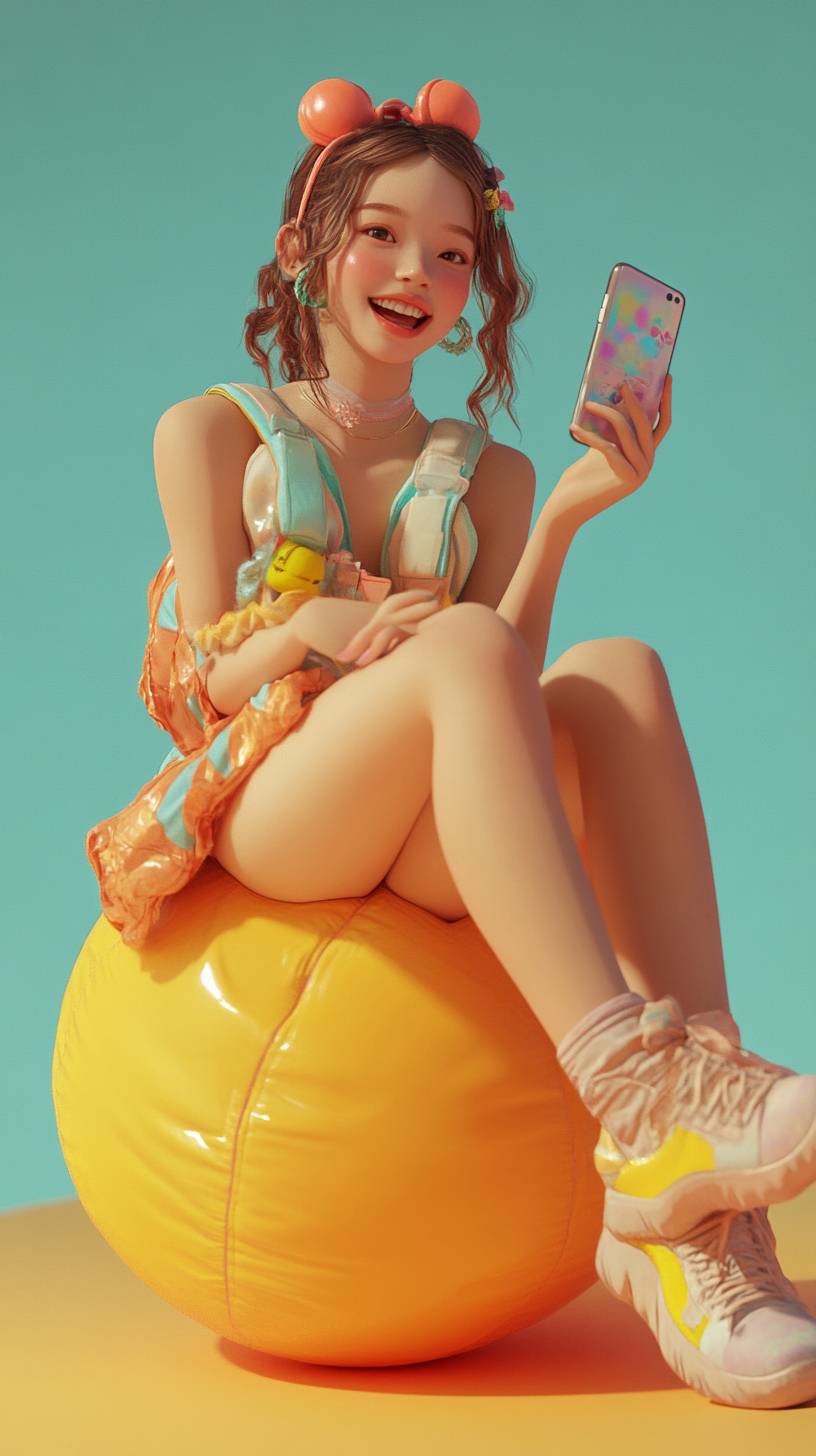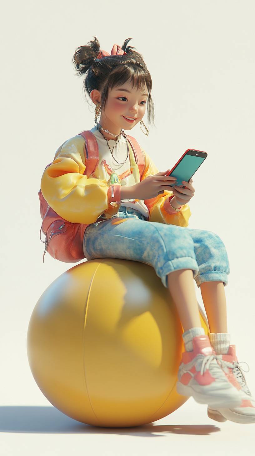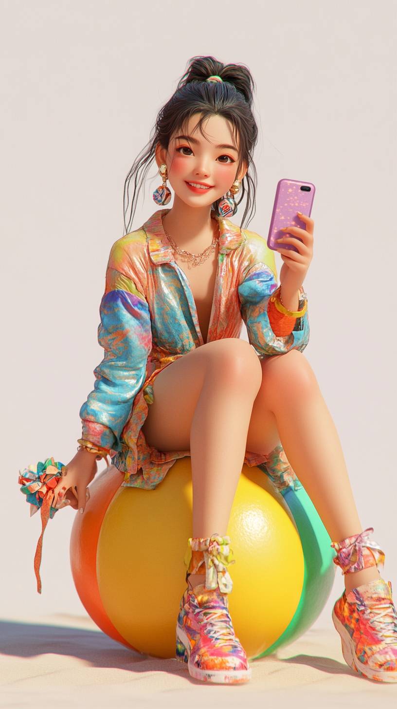 A young girl wearing a cool costume, holding a mobile phone to show us, sitting on a round ball, smiling, holding a gift in hand, realistic 3d cartoon style rendering [girl], side view, whole body, in daz3d style, cute and colorful, detailed character design, sun-soaked colors, Korean wave, MD clothing, summer trend fashion clothing, Candy colored costumes, new fashion portraits, stylish illustrations,candy color clothing, New fashion portraits, fashionable illustrations,vibrant colors, glossy and delicate. clean background, blender,octane rendering,OCrender, 8k,best quality,Best picture quality 32K, super detail,original rendering. --ar 9:16 --v 6.1