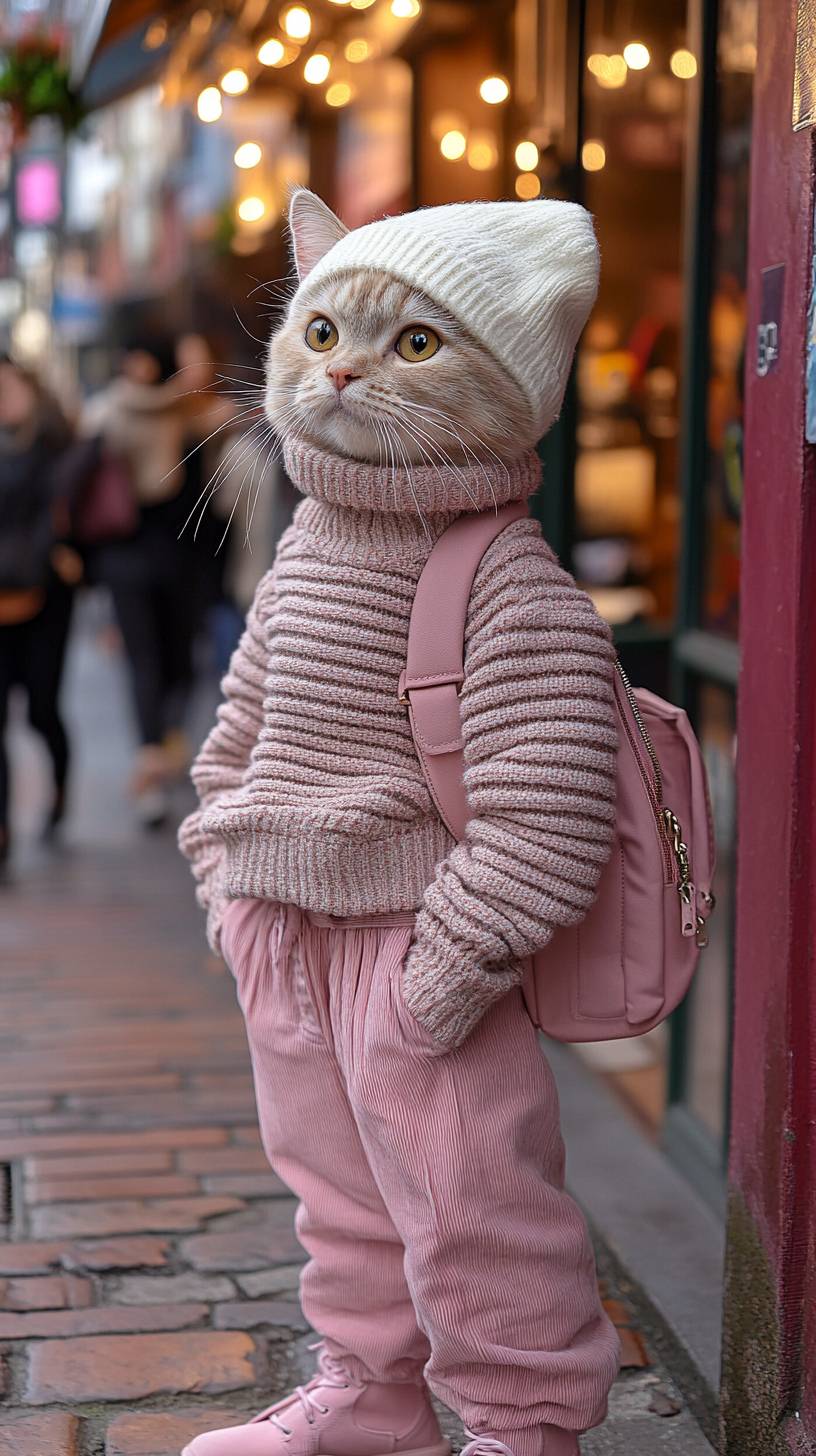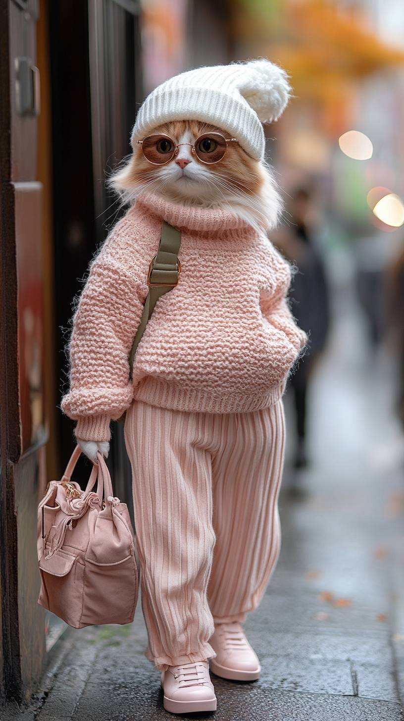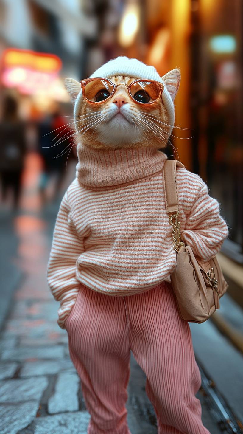 A cute cat standing on the street, a cute cat dressed fashionably, a white hat, a striped T-shirt, a striped turtleneck sweater, a pink shirt, a bag. , A small bag on a shoulder strap hangs around its waist. It also wears a hat and sunglasses that cover its face. This is a full-body photo of a real person. , and a striped turtleneck sweater. It is shopping on the street wearing sunglasses and a hat, and pants with a hat on its head. The pink pants make it look very fashionable. It wears pink shoes on its feet, creating an elegant atmosphere. The photo shows the cat's fashionable outfit and fashion accessories in a full-body composition. , Wearing high-end casual clothes with stripes and pleats. The background is a street full of fashionable women, and it looks very cool in a fashionable outfit. , Including pants and shoes, standing outside the entrance of Z_OUTPUT during Instagram Fashion Week, pink wide-leg pants --ar 9:16 --style raw --stylize 500 --v 6.1