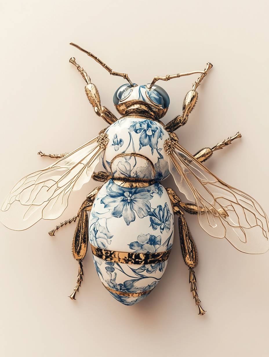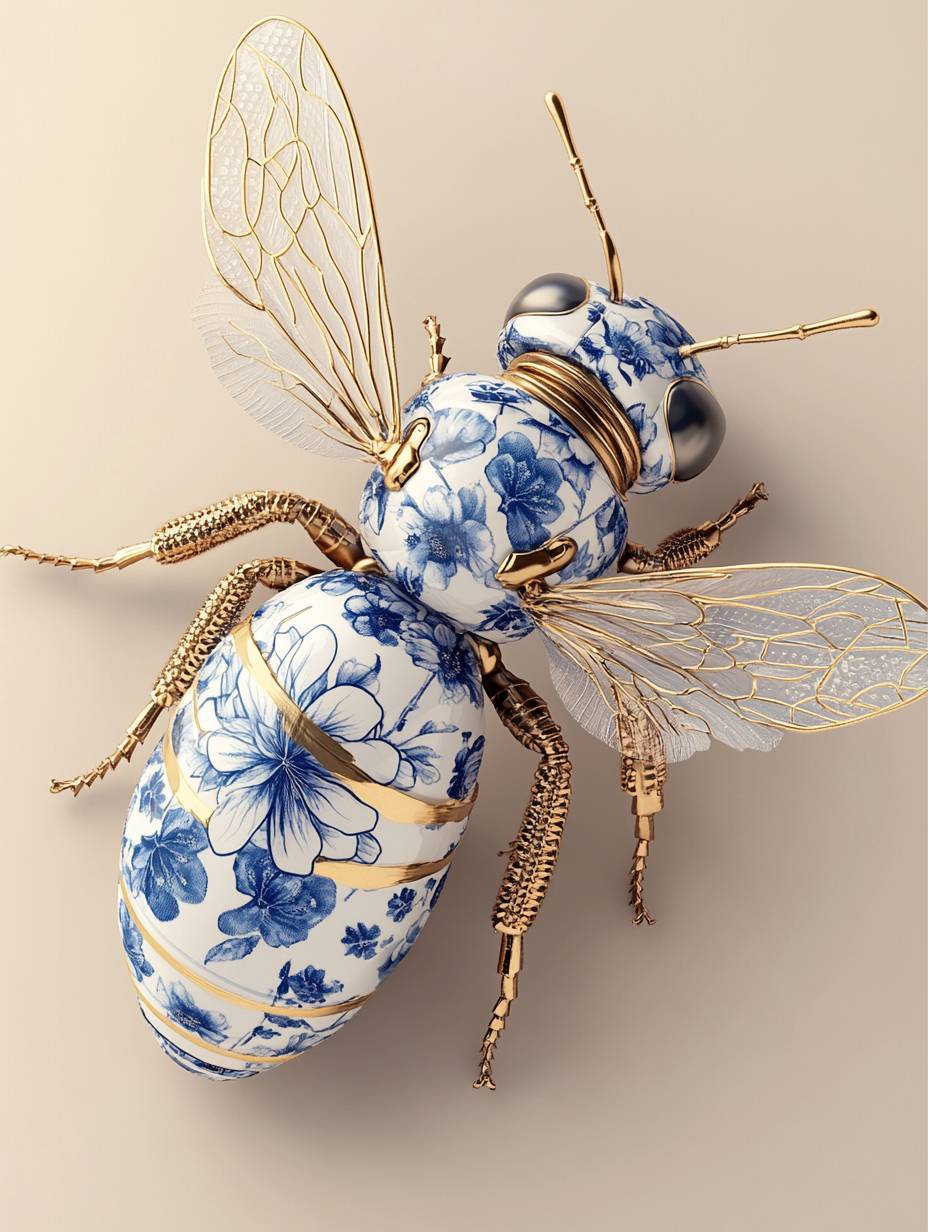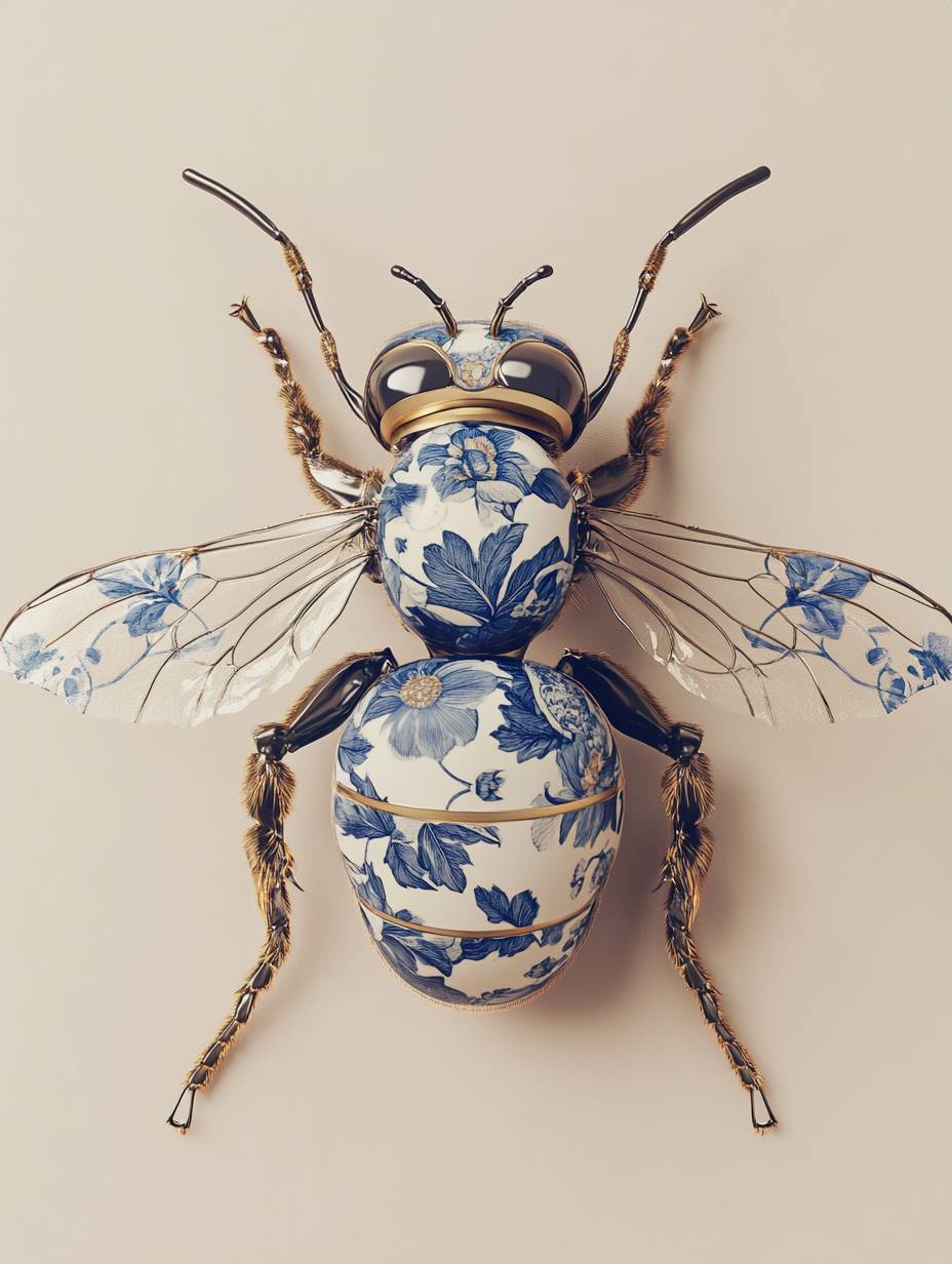 On a beige solid color background, a mechanical bee, covered in a Blue and white porcelain-patterned floral skin print,rendered in cinema4d style, dreamy and Romantic, Ray Tracing, Brandon Werfel, delicate materials, ethereal and dreamy, luminous, Translucent colors, Lavender and Pale Gold,mechanical parts anatomical, carbon made, with cable, octane render, unreal engine 5, volumetric lighting, diffuse lighting, 8k, hyper-detailed, HDR --ar 3:4 --v 6.1