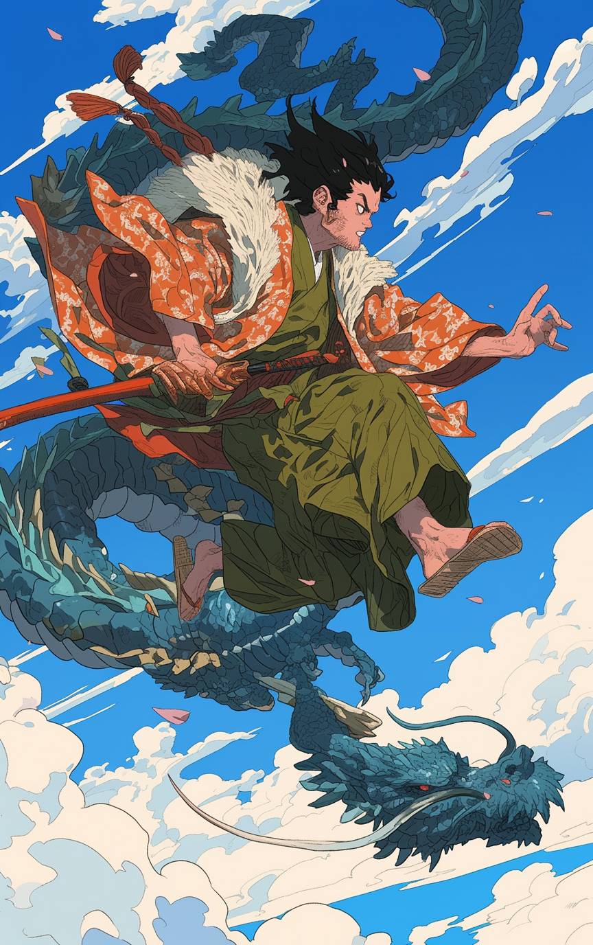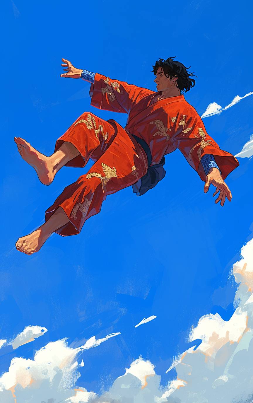 بطل ياباني في وضعية الطيران، يرتدي كيمونو التنين، مع إشارات ثقافية، أبعاد عائمة، رسوم متحركة توضيحية