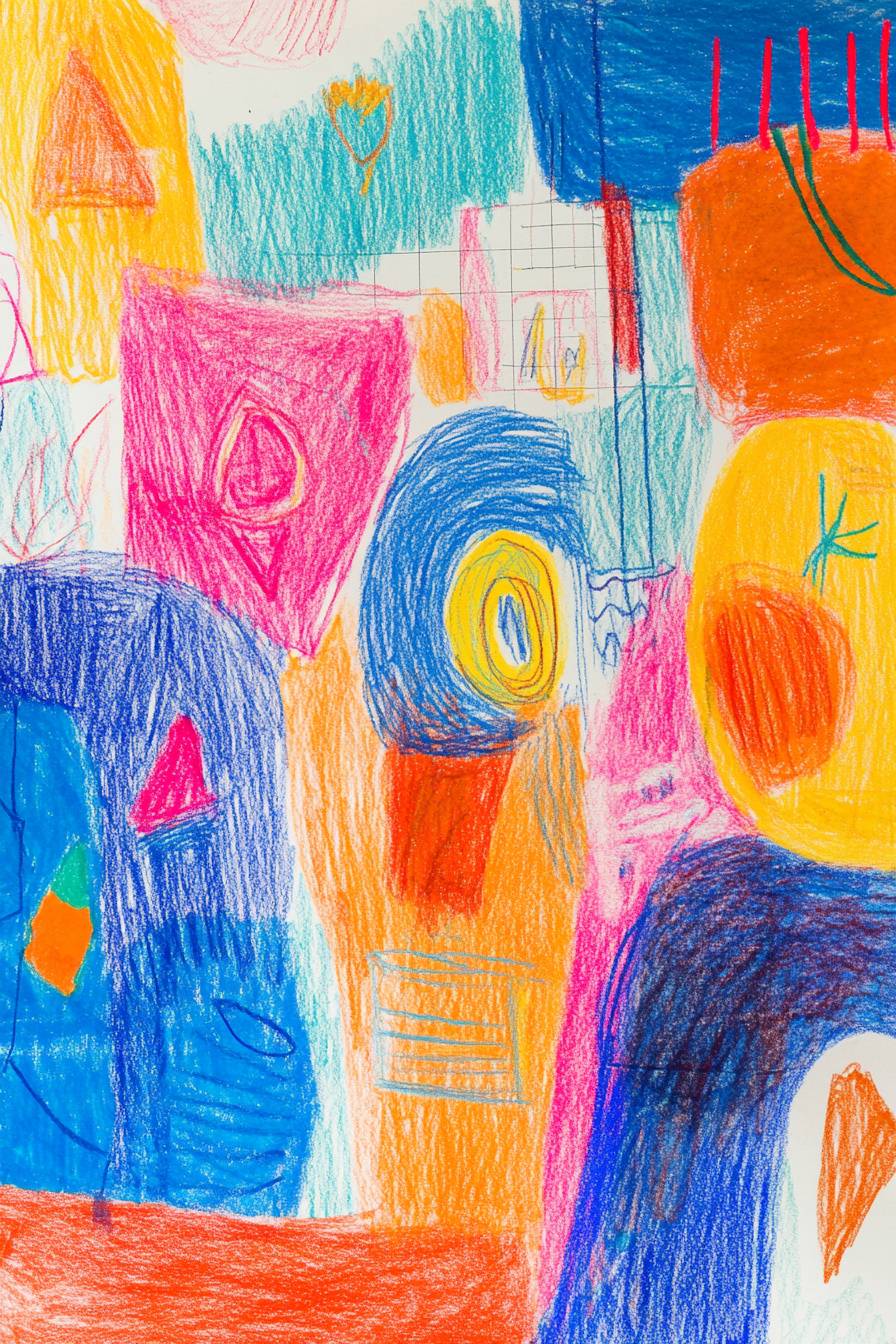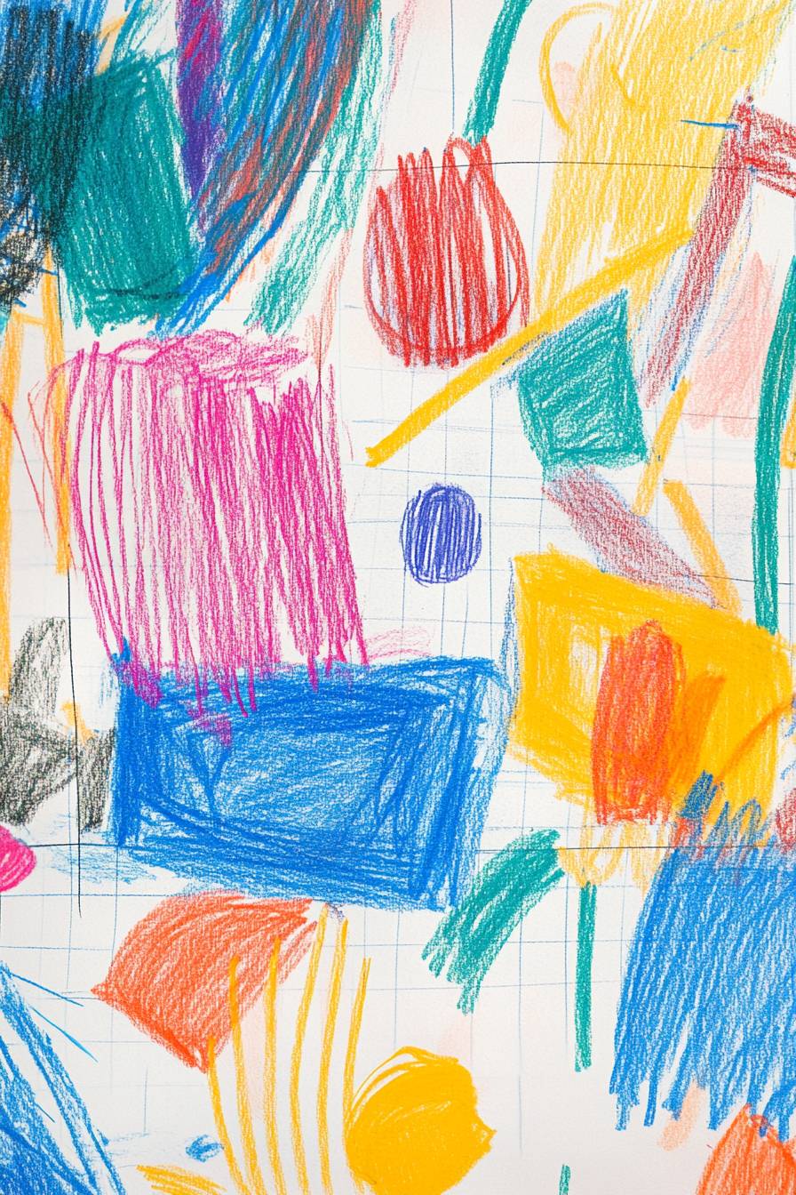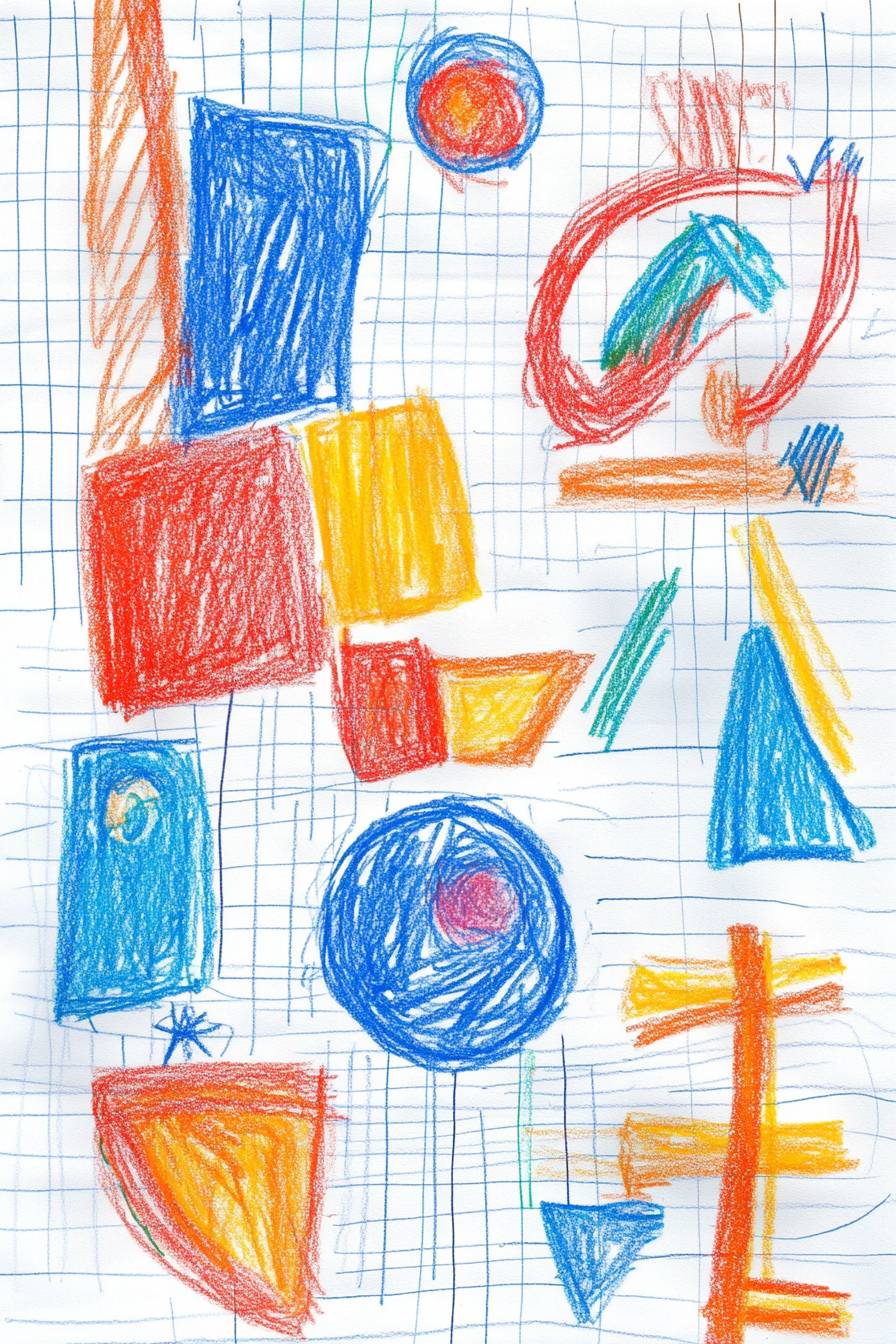 رسم باستخدام الألوان الشمعية قام به طفل يبلغ من العمر 5 سنوات، مستوحى من سبارتاكوس من LazyTown. يظهر الرسم طفلاً يقفز فوق العقبات، مع خطوط بسيطة وغير متساوية وضربات ملونة زاهية. العمل مليء بالفرح والمرح، مع ألوان زاهية مثل الأزرق والأحمر والبرتقالي والأصفر. يتضمن الخلفية أشكالاً وخطوطاً غريبة تشير إلى الحركة والمرح. تم رسم الصورة على ورقة دفتر المدرسة مع وجود خطوط شبكة مرئية، مما يضيف لمسة من الحنين والأصالة.