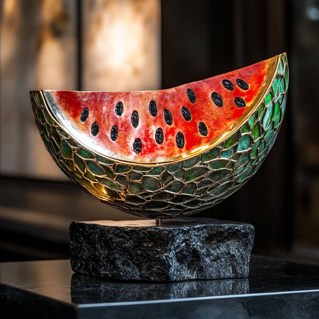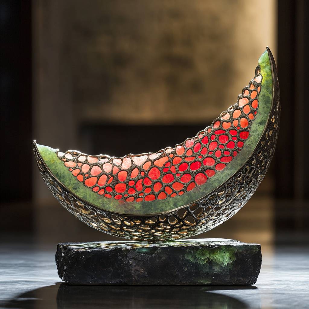 تمثيل مجسم ثلاثي الأبعاد لشريحة بطيخ مصنوعة من زخرفة متشابكة من النحاس الأصفر والفضة، resting على قاعدة مصنوعة من الأوبسيديان المنحوت.