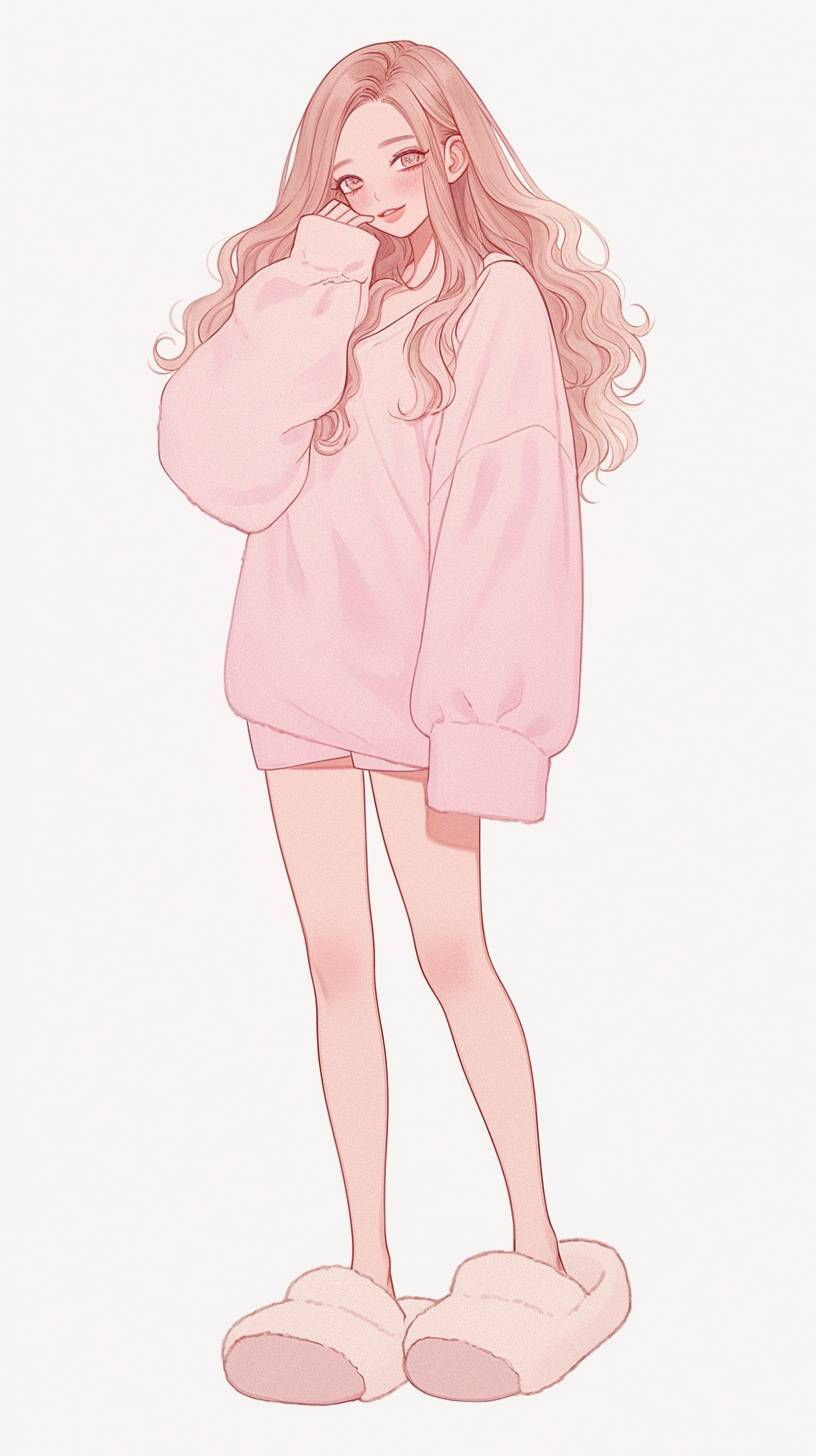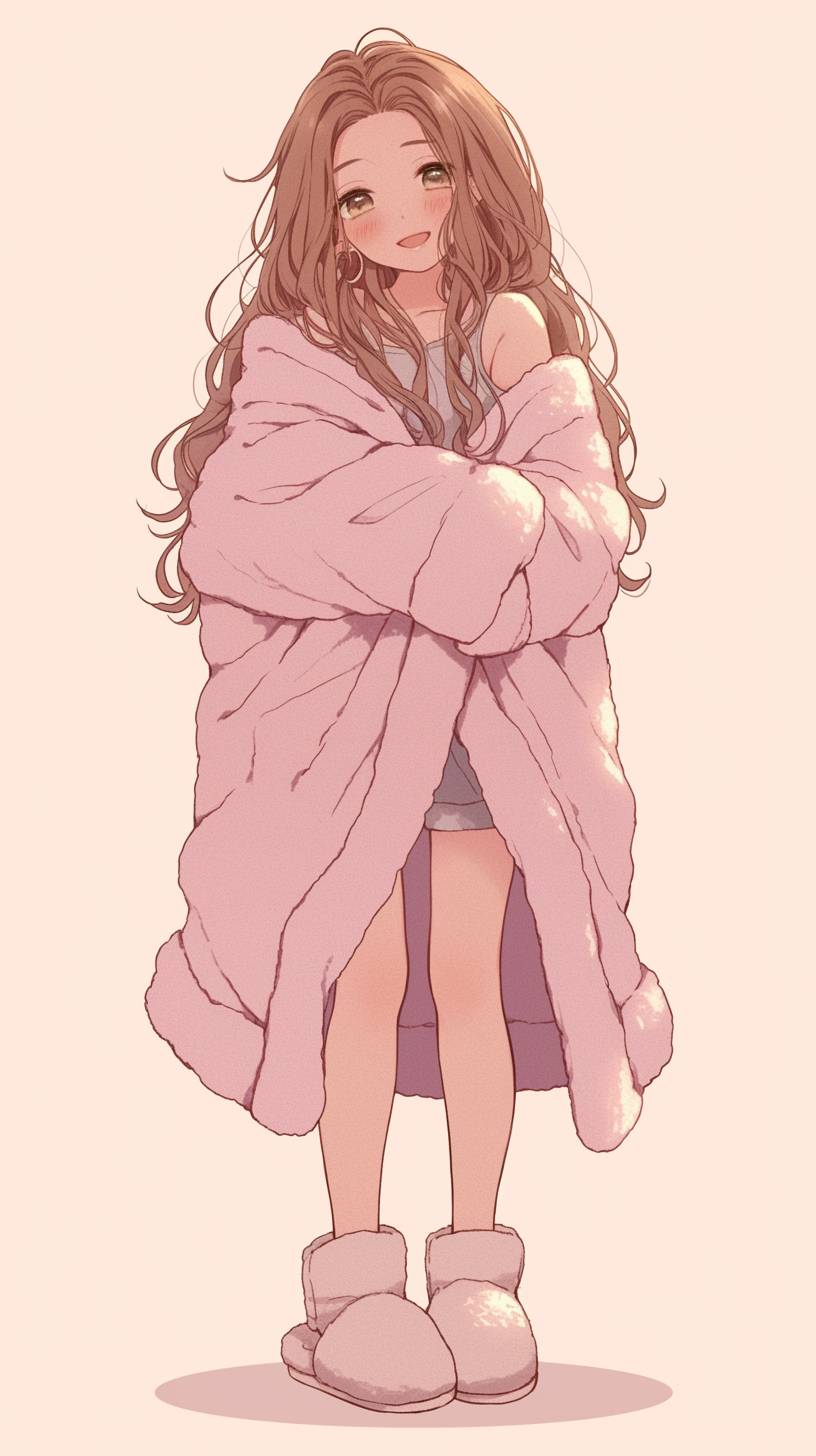 Cozy Night In: A relaxed girl with long flowing hair, wearing a soft pastel pink oversized pajama top, matching fluffy shorts, and plush slippers, wrapped in a warm blanket. --niji 6 --ar 9:16