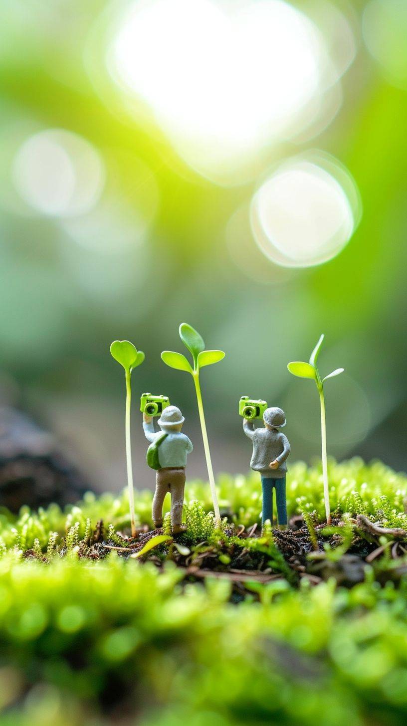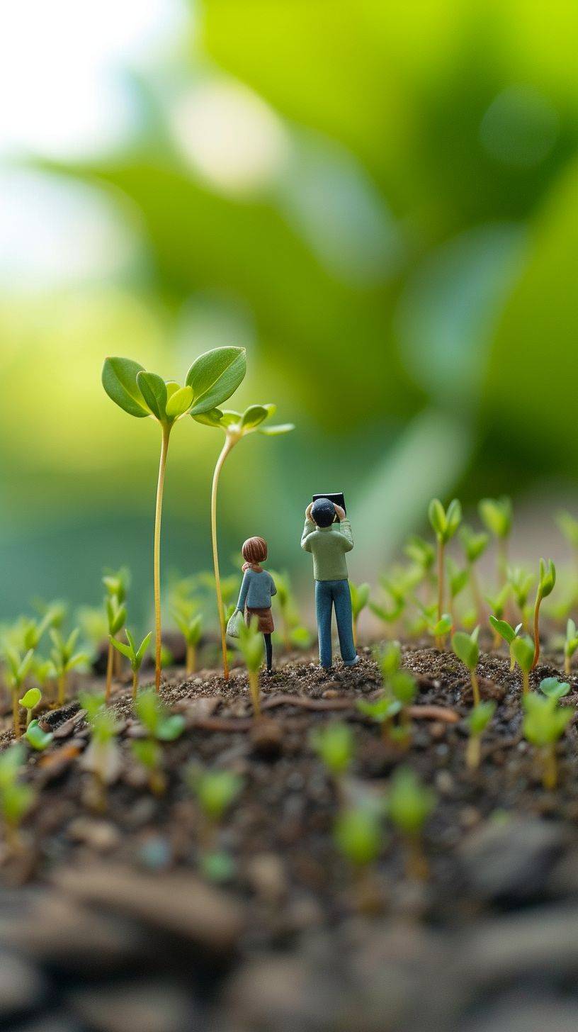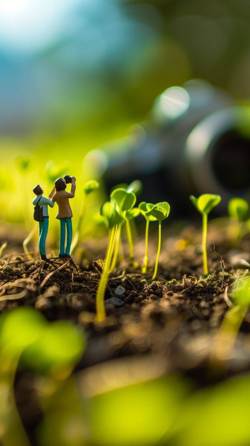 masterpiece,best quality, a couple of miniature people taking photos while standing next to sprouts on the grassland,miniature photography,camera looking up --ar 9:16 --v 6 --stylize 50