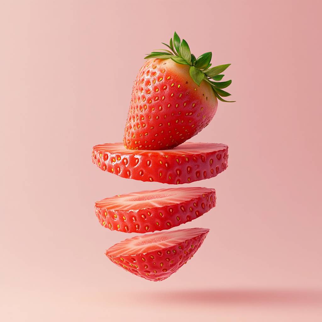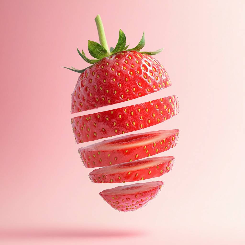 A vibrant strawberry sliced into even layers, with each piece floating vertically in mid-air, on a soft pastel background, hyper realistic, 4K, --v 6.1 --style raw