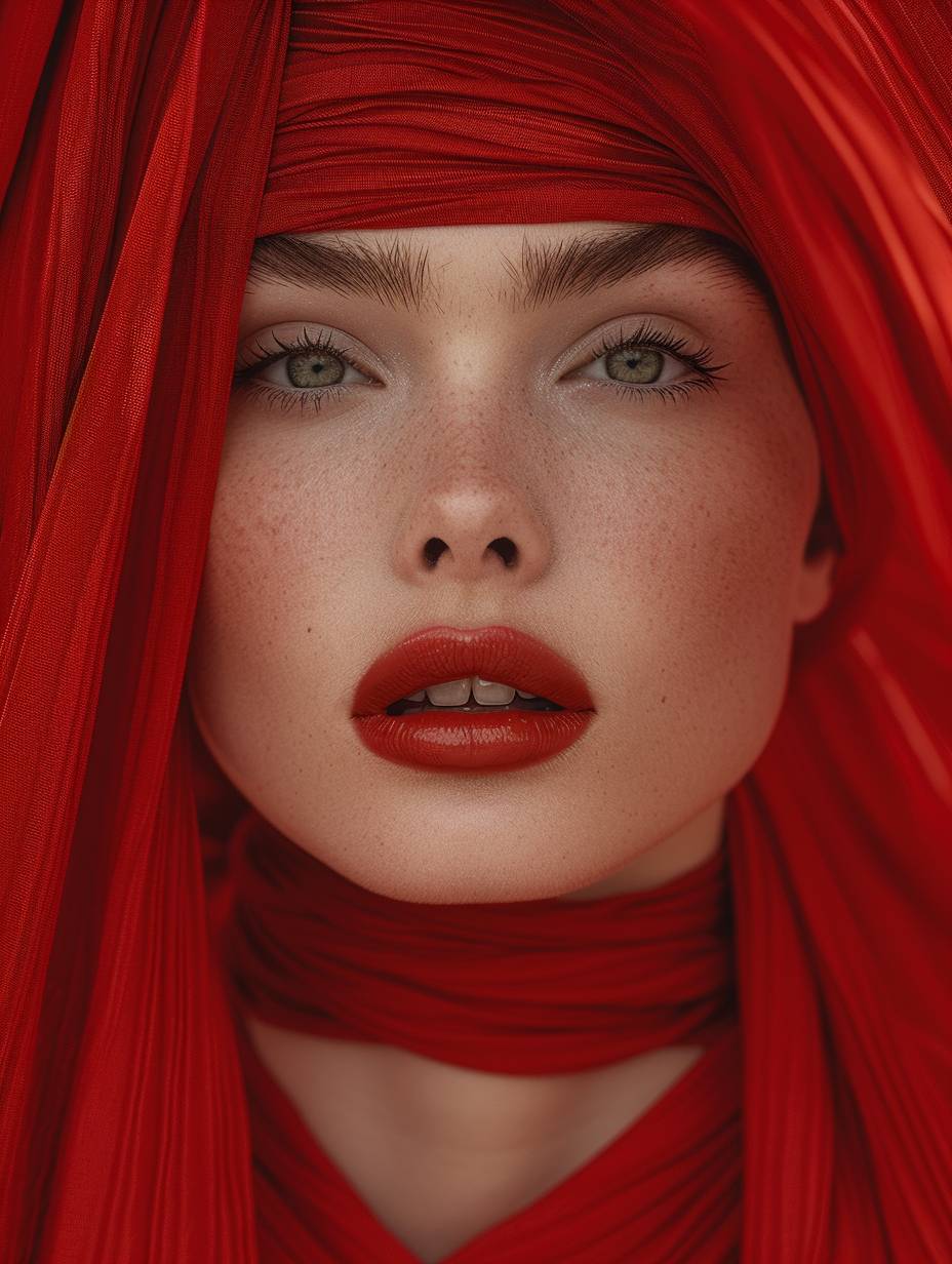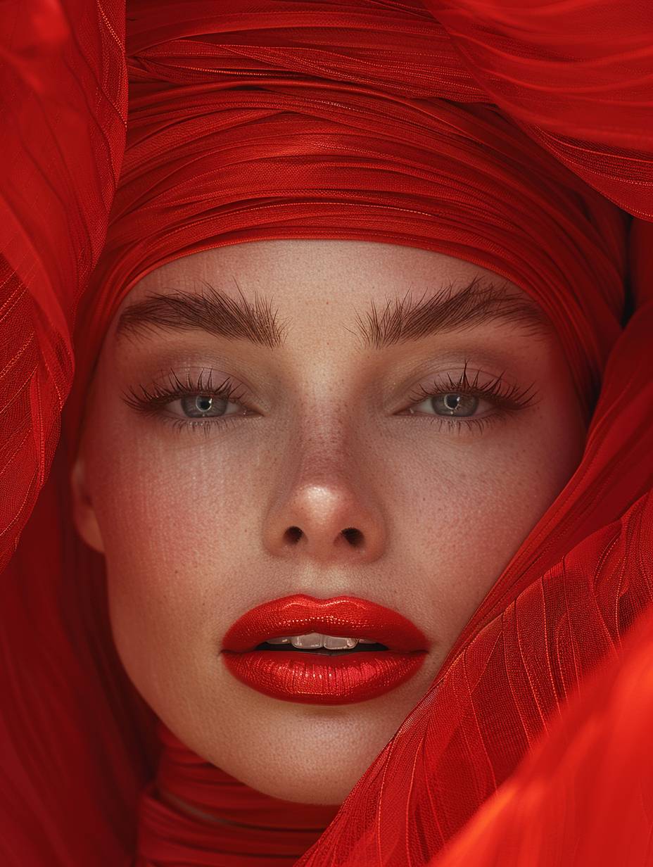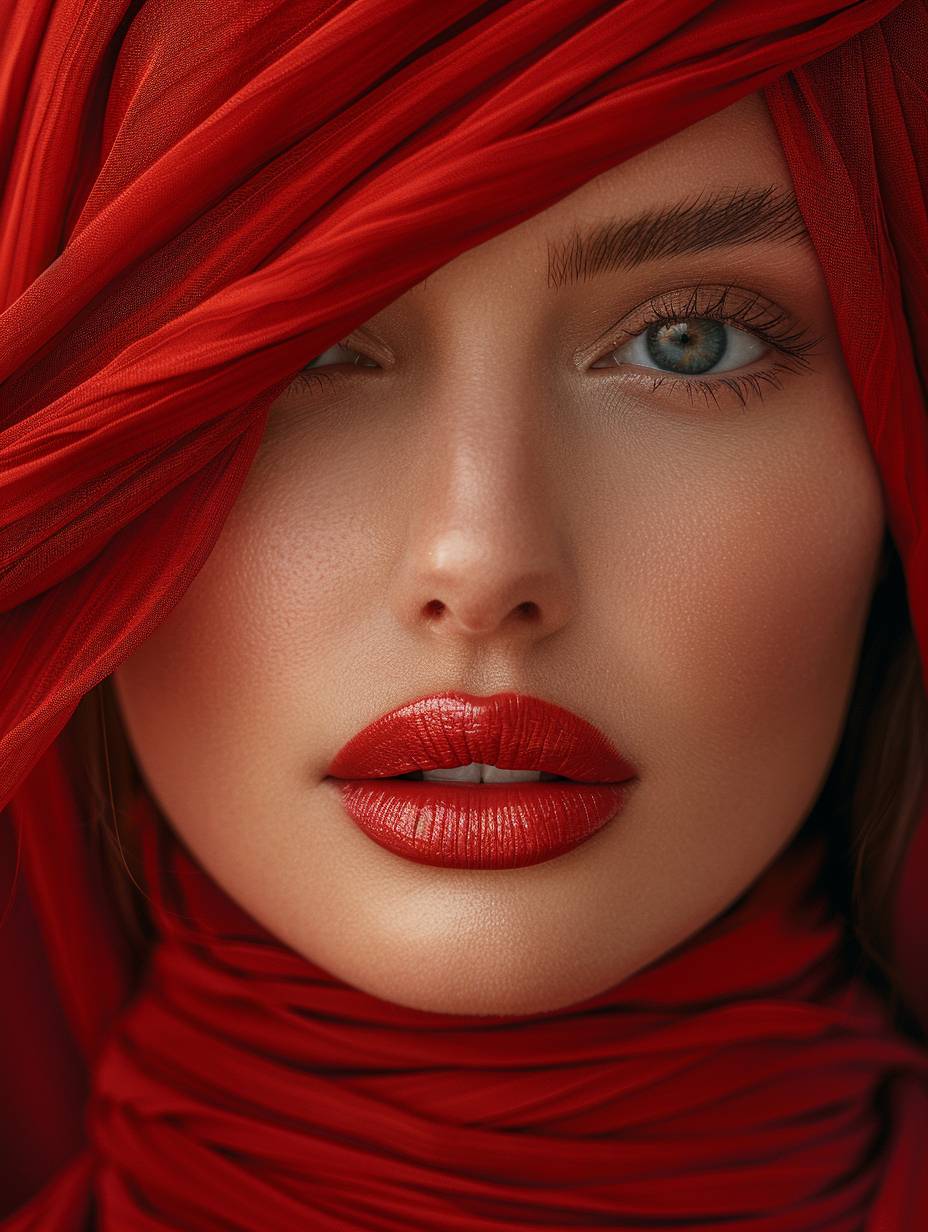 beautiful woman with her eyes covered in red silk, photographed in the style of fashion photographer Hedi Slimane. The background is an abstract composition made entirely of red fabric. She wears a modern outfit in shades of crimson and scarlet. Her lips have glossy lipstick on them. --ar 3:4 --s 1000 --v 6.0