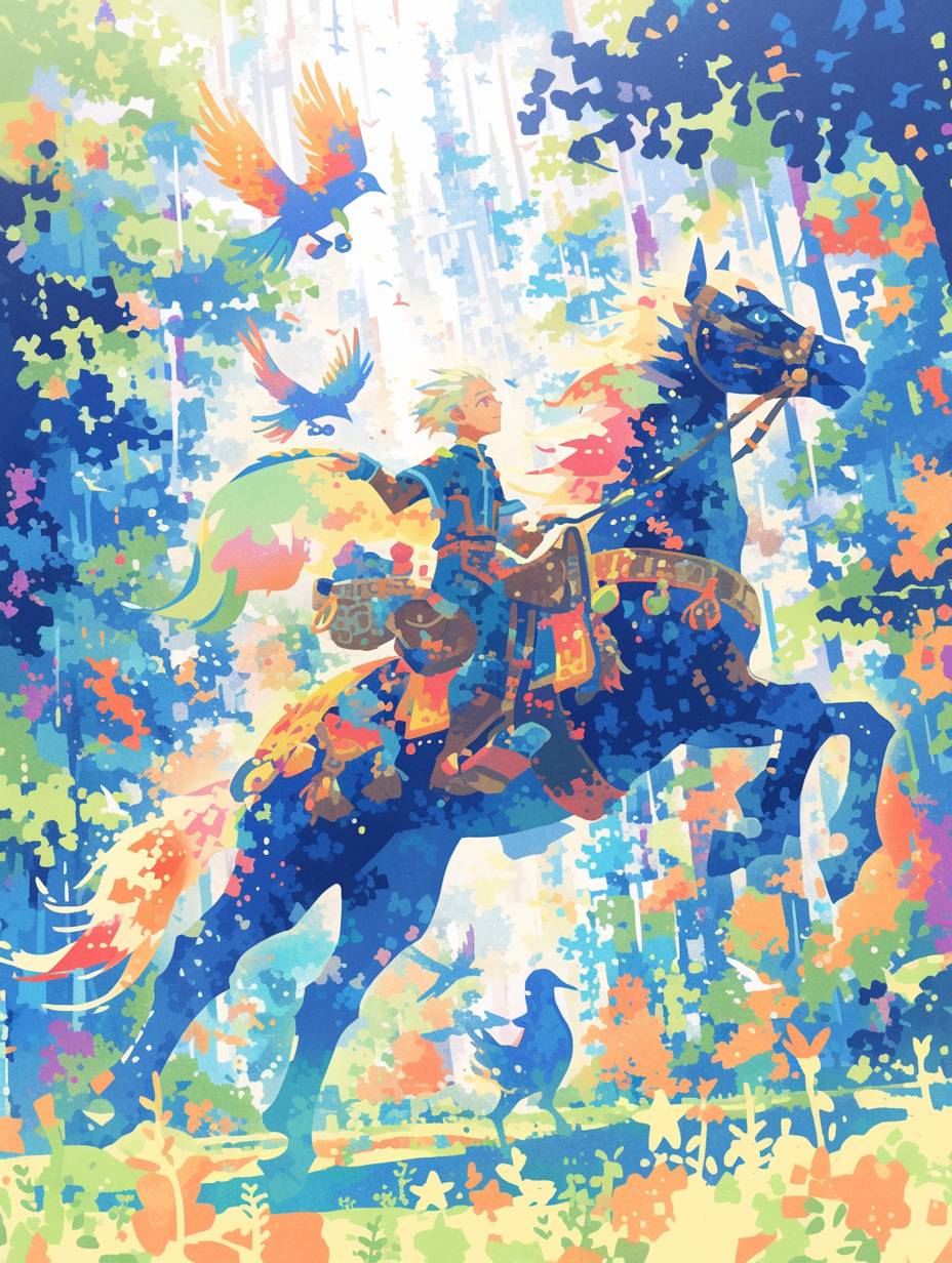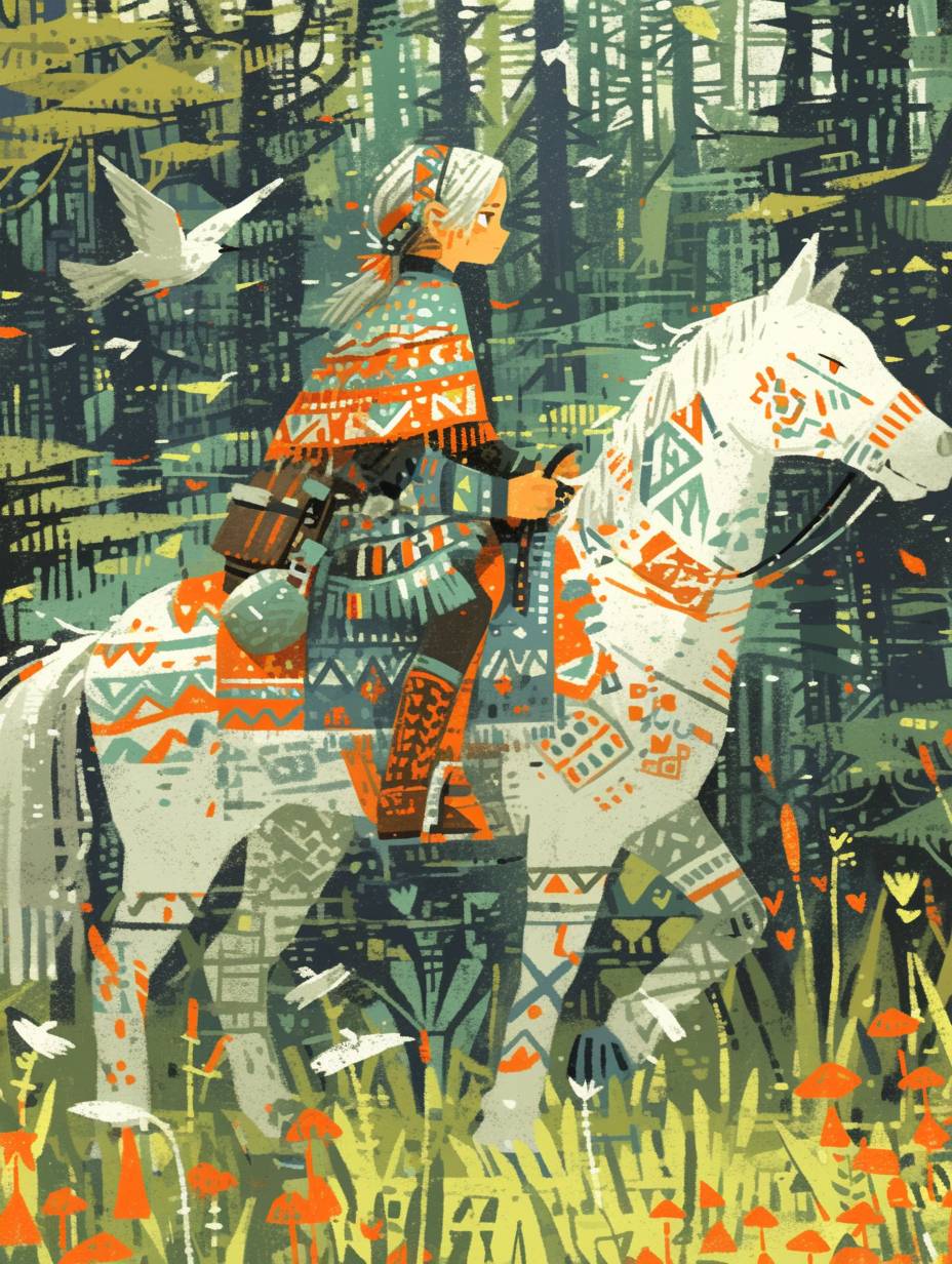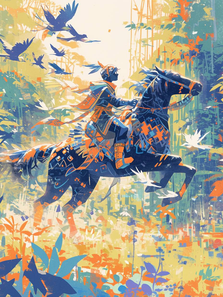 هناك فتى يركب حصاناً ويطارد الطيور في الغابة، محاطاً بغابة خطية مع طيور تطير في السماء. تم رسم الصورة بأسلوب مسطح باستخدام خطوط ملونة، حيث يعتبر اللون الأخضر هو اللون الرئيسي للخلفية، مشهد مصور نابض بالحياة، تأثير عين السمكة، 64K.