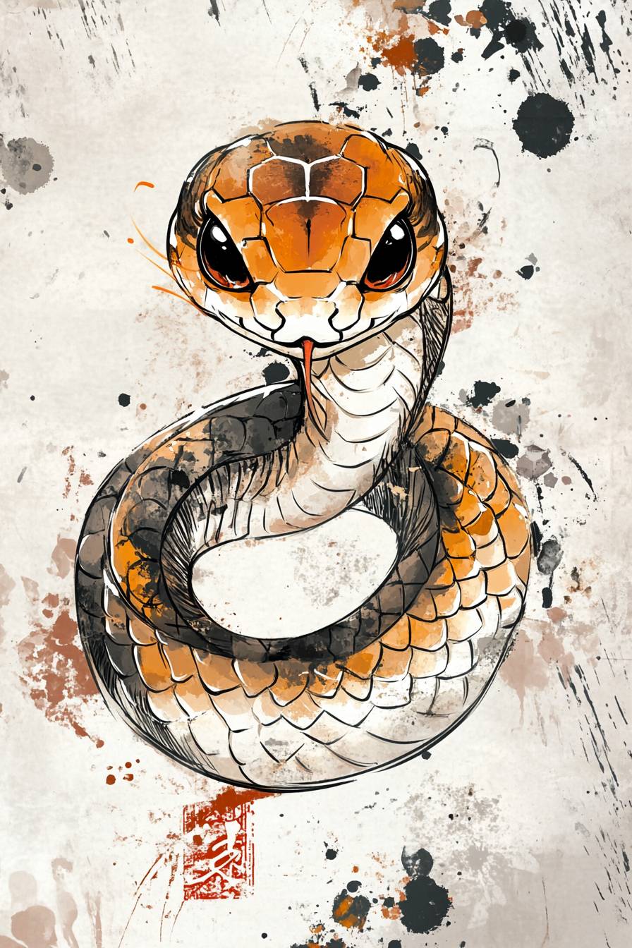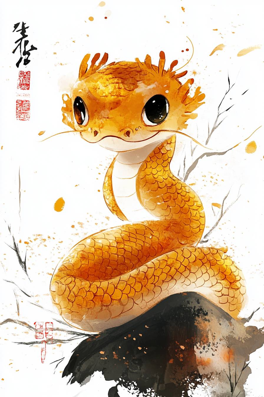 ثعبان لطيف بأسلوب تشيبي بفضل قشور ذهبية، مرسوم بأسلوب الرسم بالحبر الصيني، مع تعبير جريء واستخدام كبير للفراغ الأبيض، يتميز بمزج الحبر وإصدار Q لطيف.