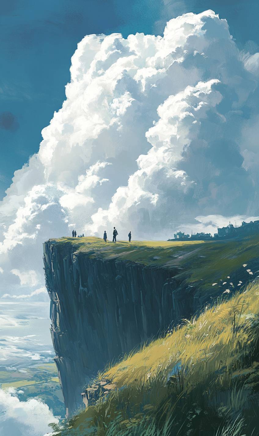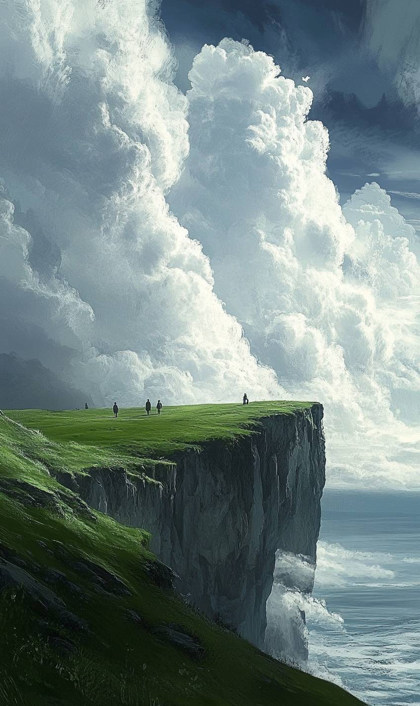 A vast expanse of grassy land, people strolling, a cliff under a sky filled with enormous clouds, a mix of white colors, a sense of heaviness and oppression, a tranquil and mysterious atmosphere. --v 6.1 --ar 3:5