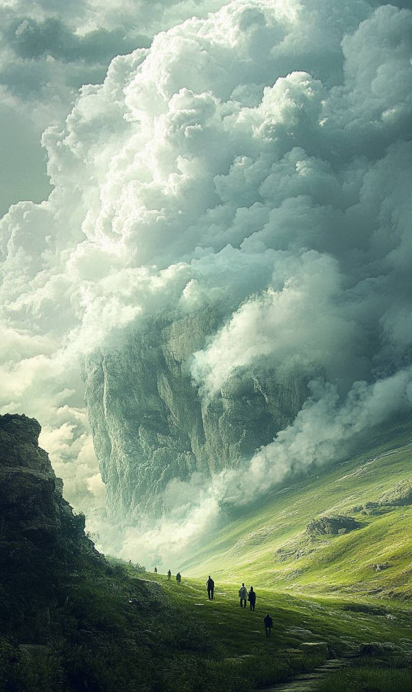 امتداد شاسع من الأراضي العشبية، الناس يتجولون، منحدر تحت سماء مليئة بالسحب الضخمة، مزيج من الألوان البيضاء، إحساس بالثقل والضغط، أجواء هادئة وغامضة.