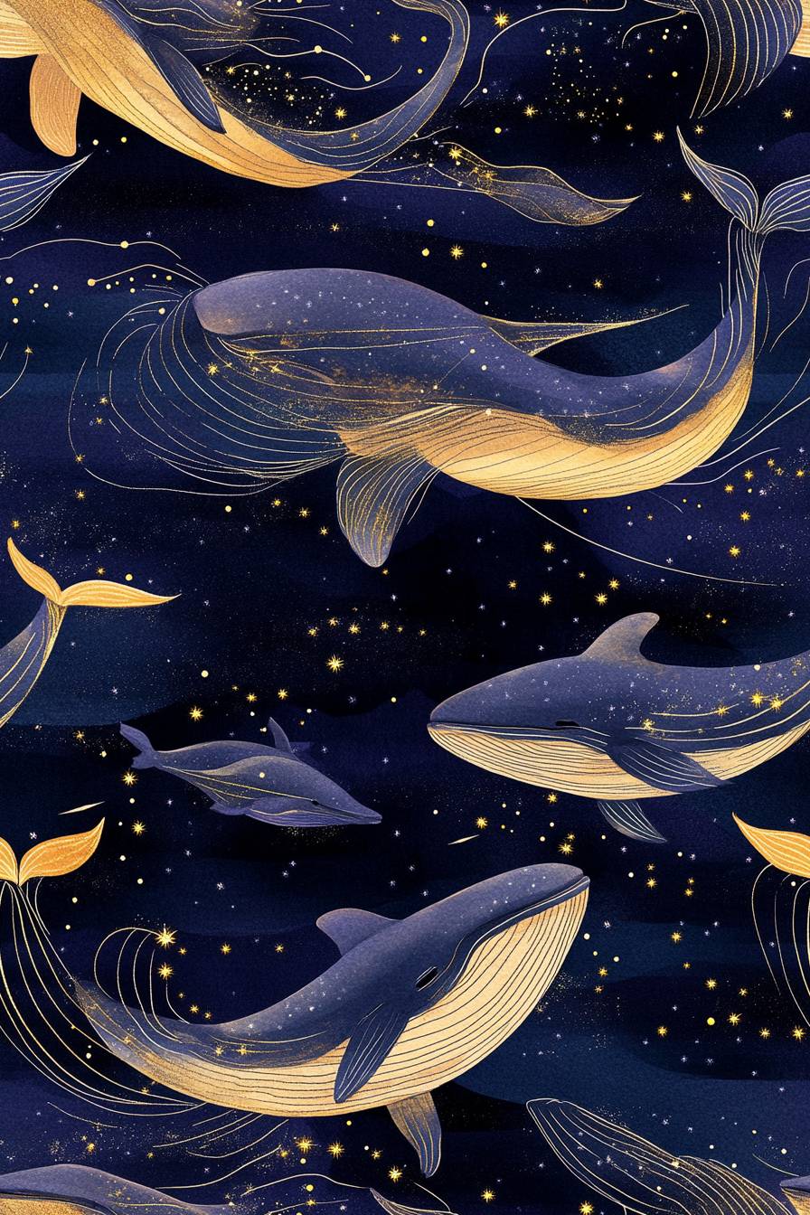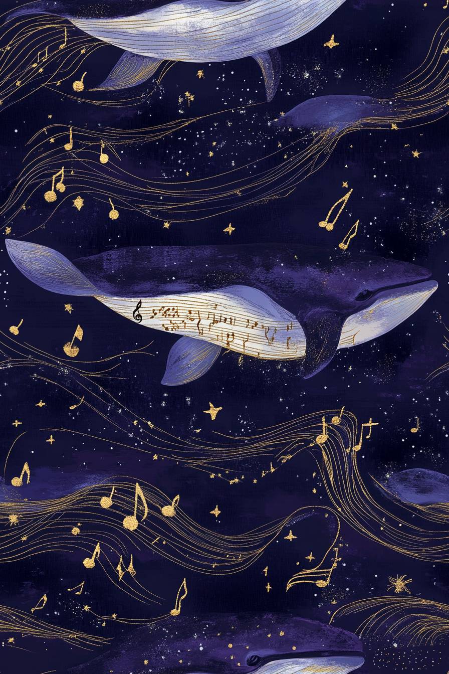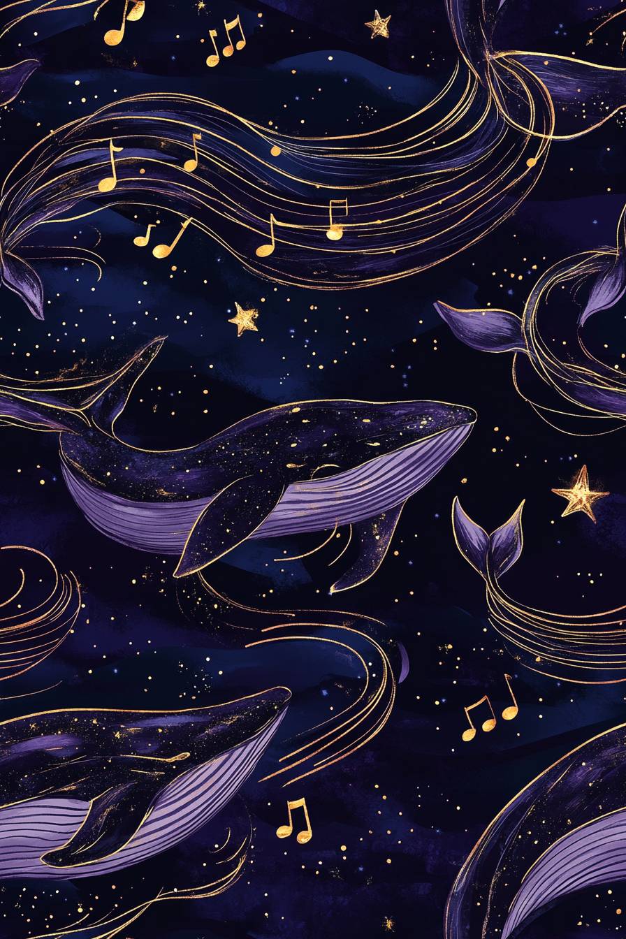 An artistic seamless pattern where celestial whales sing glowing musical notes that turn into twinkling stars. The whales have elegant, elongated forms with flowing tails that resemble sheet music in the night sky. Ethereal waves intertwine with the melody, creating a visual harmony. The color scheme blends deep navy, twilight purples, and shimmering gold highlights. A whimsical and dreamlike aesthetic with a soft, painterly style. --tile --v 6.1 --ar 2:3
