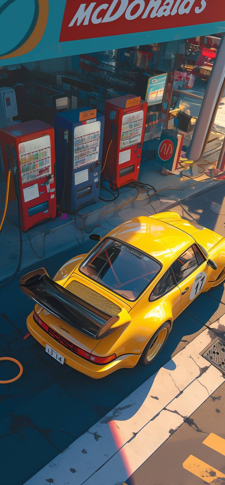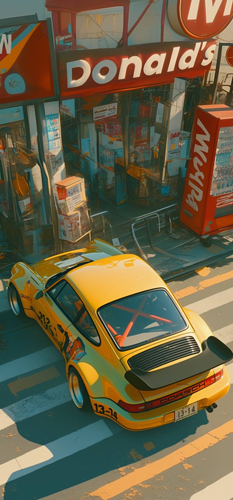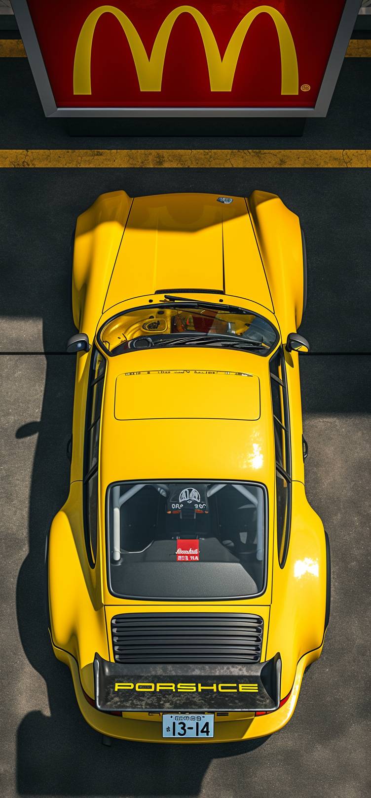 A light yellow Metallic Porsche 964 Carrera RS Equipped with a large black rear wing parked near the McDonald's store(A clear McDonald's Illuminated logo, McDonald's store exterior,A clear white San Francisco Rounded font "McDonald's" English red background Signboard.) in the gas station at the Tokyo,a yellow car number plate reading "13-14",The scene is captured from directly above, with a frontal side perspective,Day time,with ambient lighting,shot with a Hasselblad H6D-100c camera and Portra film. --ar 43:93 --niji 6