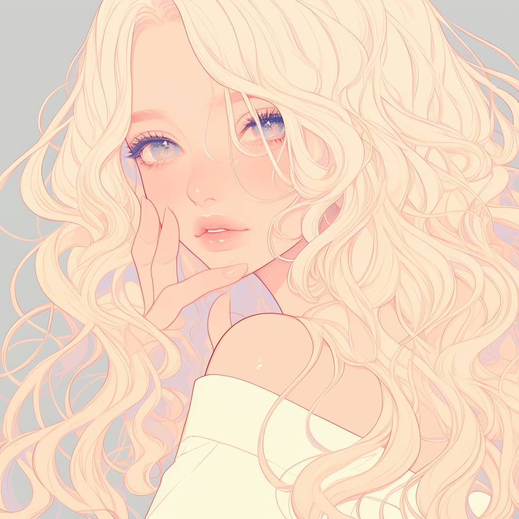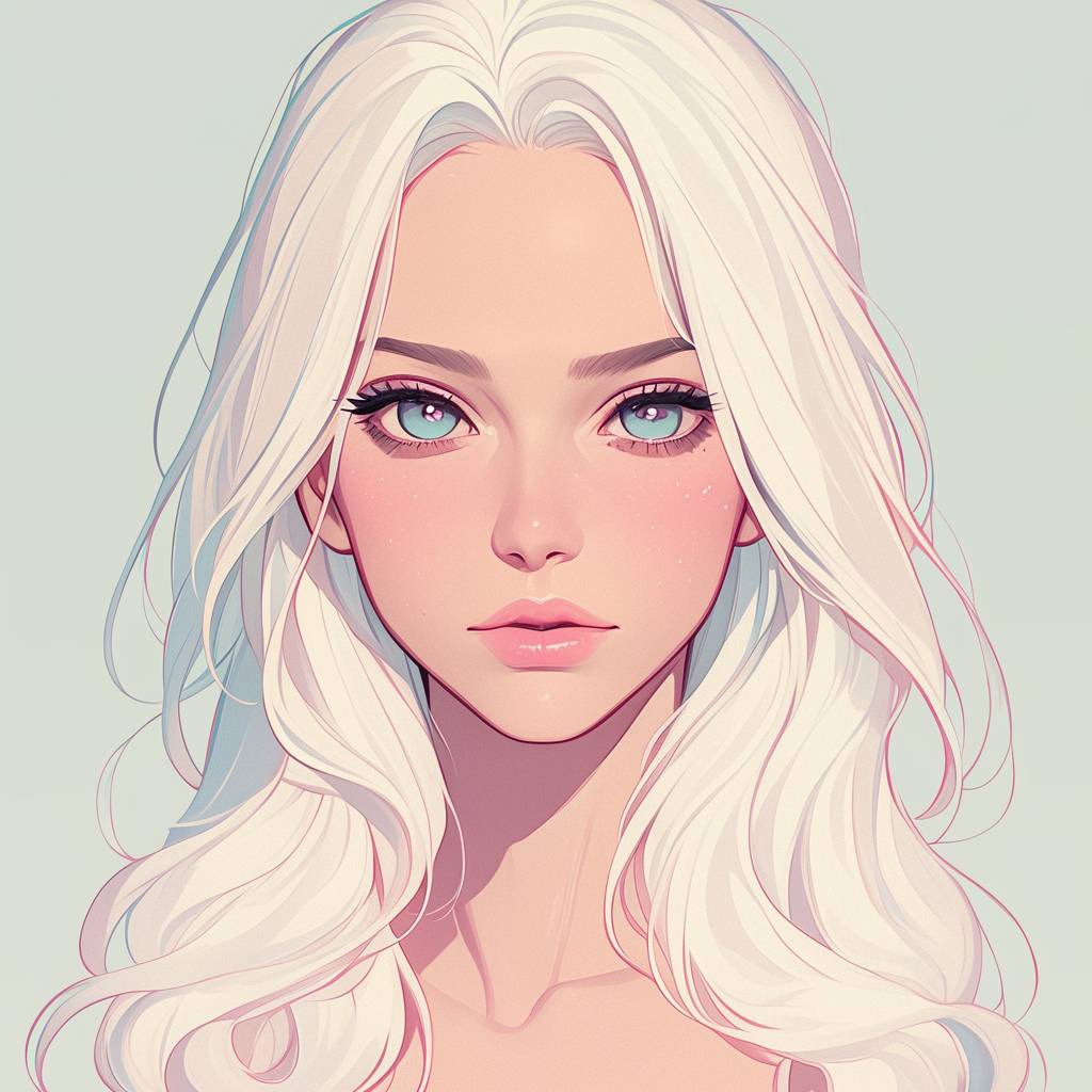 امرأة شابة تبلغ من العمر 16 عامًا ، تمتلك شعرًا مزدوج اللون طويل ومجعد: بني فاتح مع خصلتين كبيرتين باللون الأبيض فوق جبهتها، وعينين زرقاوين عميقتين، وشفاه وردية.