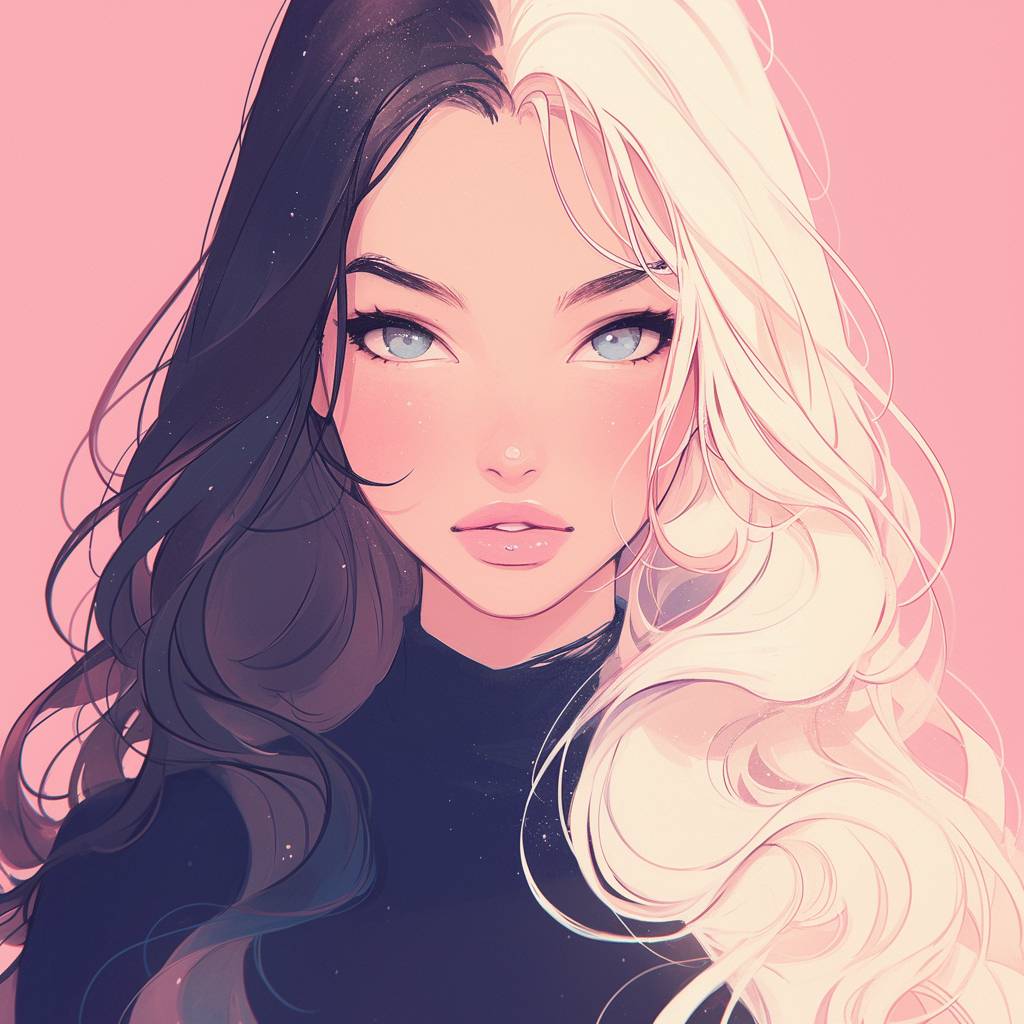 Young woman of 16 years old. Long, wavy bicolor hair : light brown hair with two big white locks above her forehead parting to the side of her face, towards her ears. Light beige skin. Dark, deep blue eyes. Pink lips. --niji 6