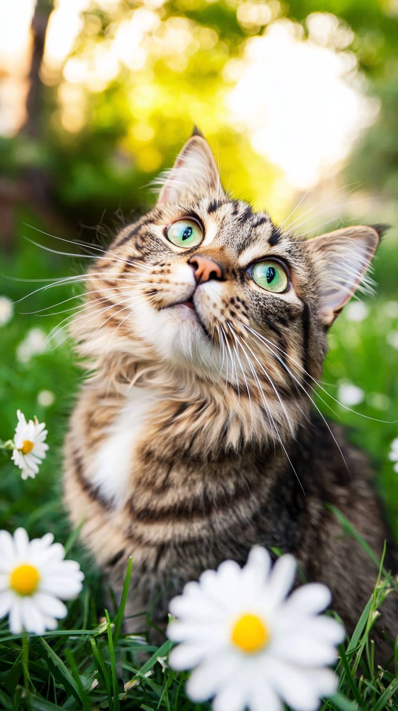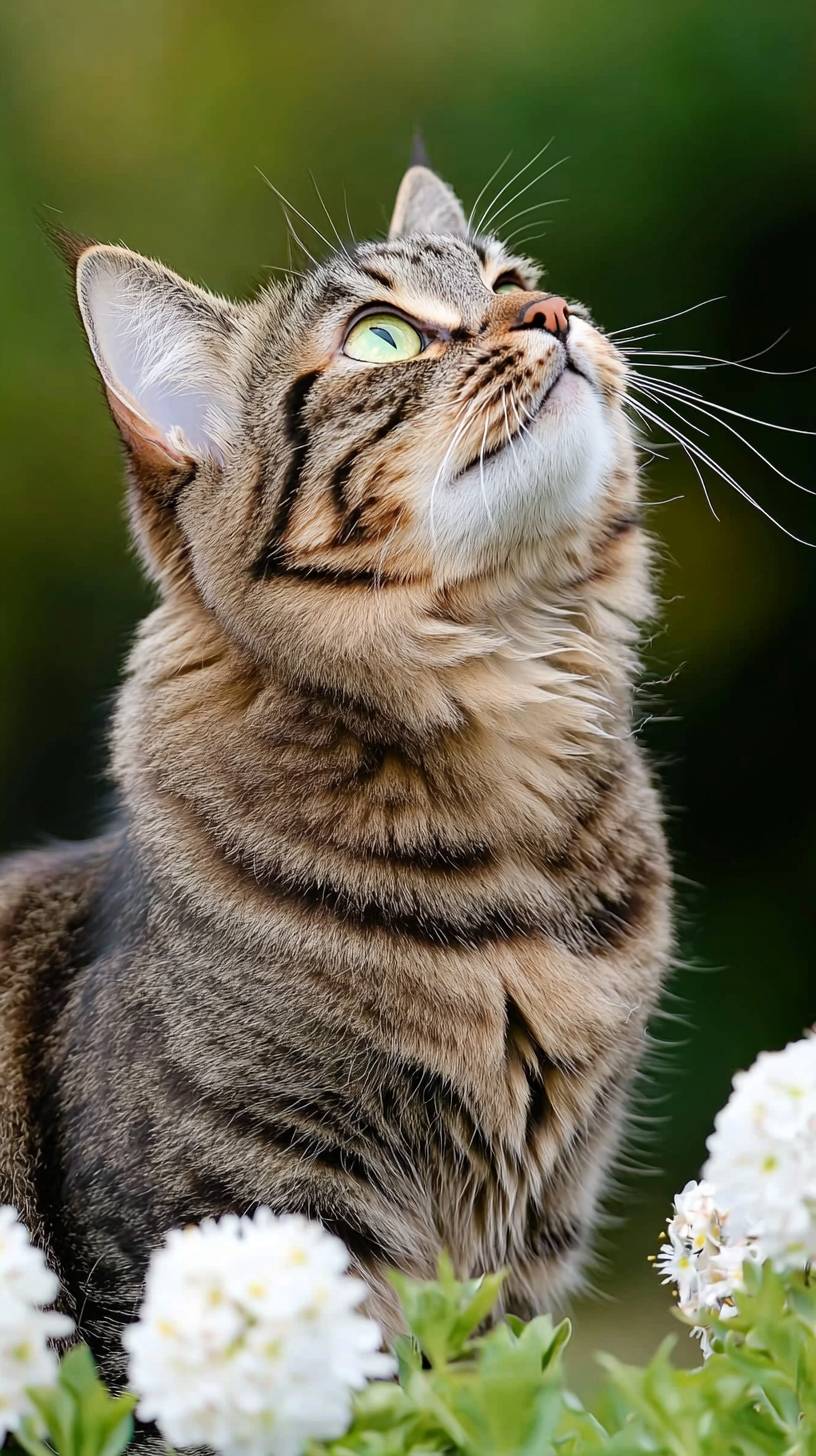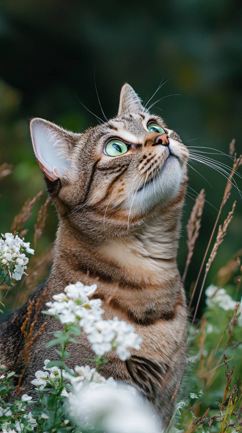 Tabby Cat with Green Eyes in a Grassy Setting: Professional high-quality photograph of a tabby cat with striking green eyes, sitting in a grassy area with white flowers. The cat is looking upward and to the side while the background is softly blurred to emphasize the subject. The image is captured with flash lighting using a softbox for soft, even illumination with no harsh shadows and a crisp focus on the cat, ensuring clear, light colors ideal for commercial animal stock imagery. --no blur, blurred object, bokeh, blurry, pixel, hdr effect, illustration, painting, warped, unreal --chaos 30 --ar 9:16 --quality 2 --style raw --profile rxh1tey --v 6.1