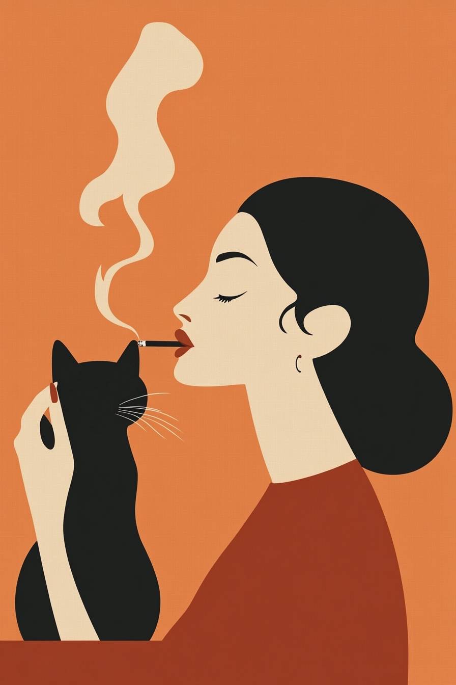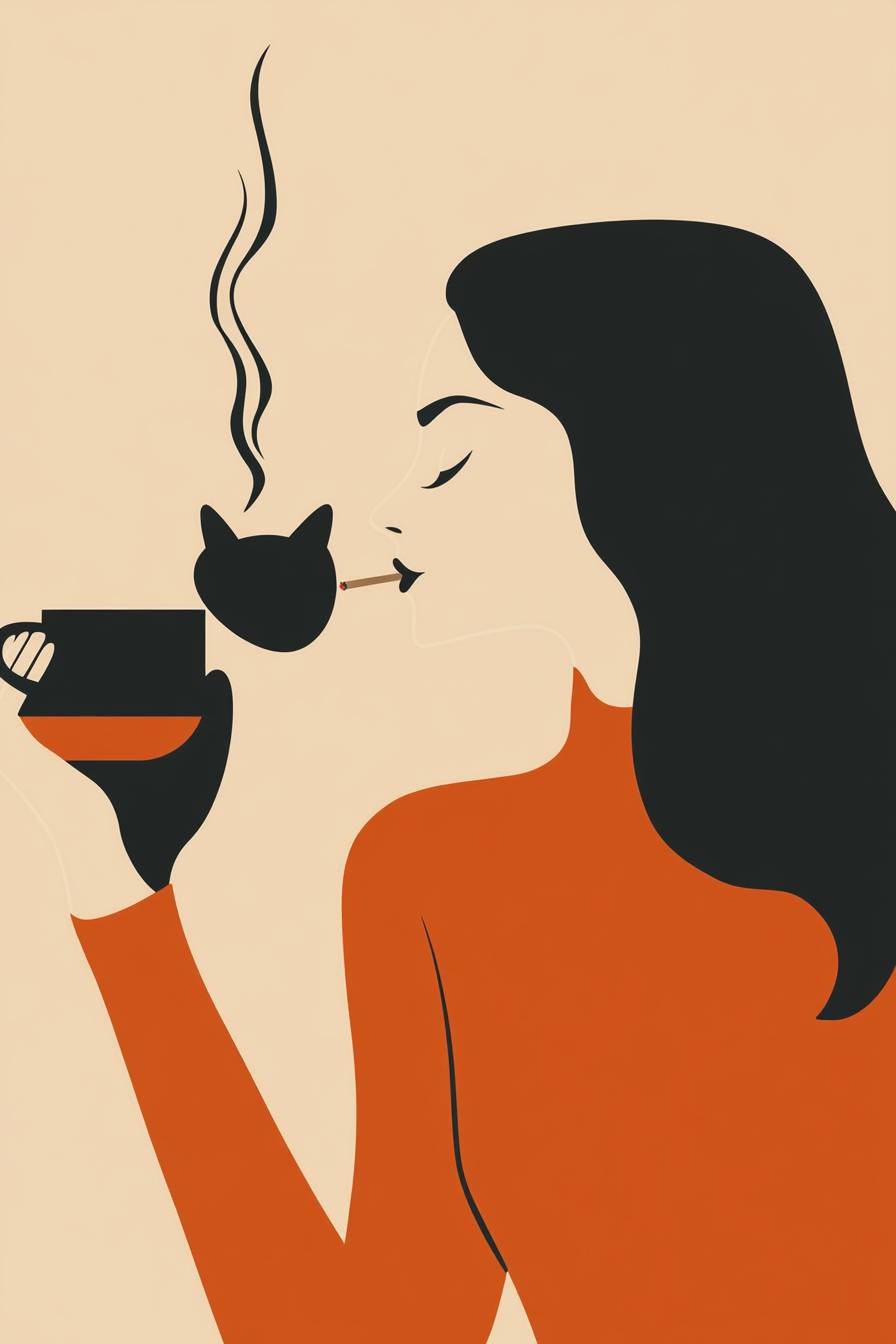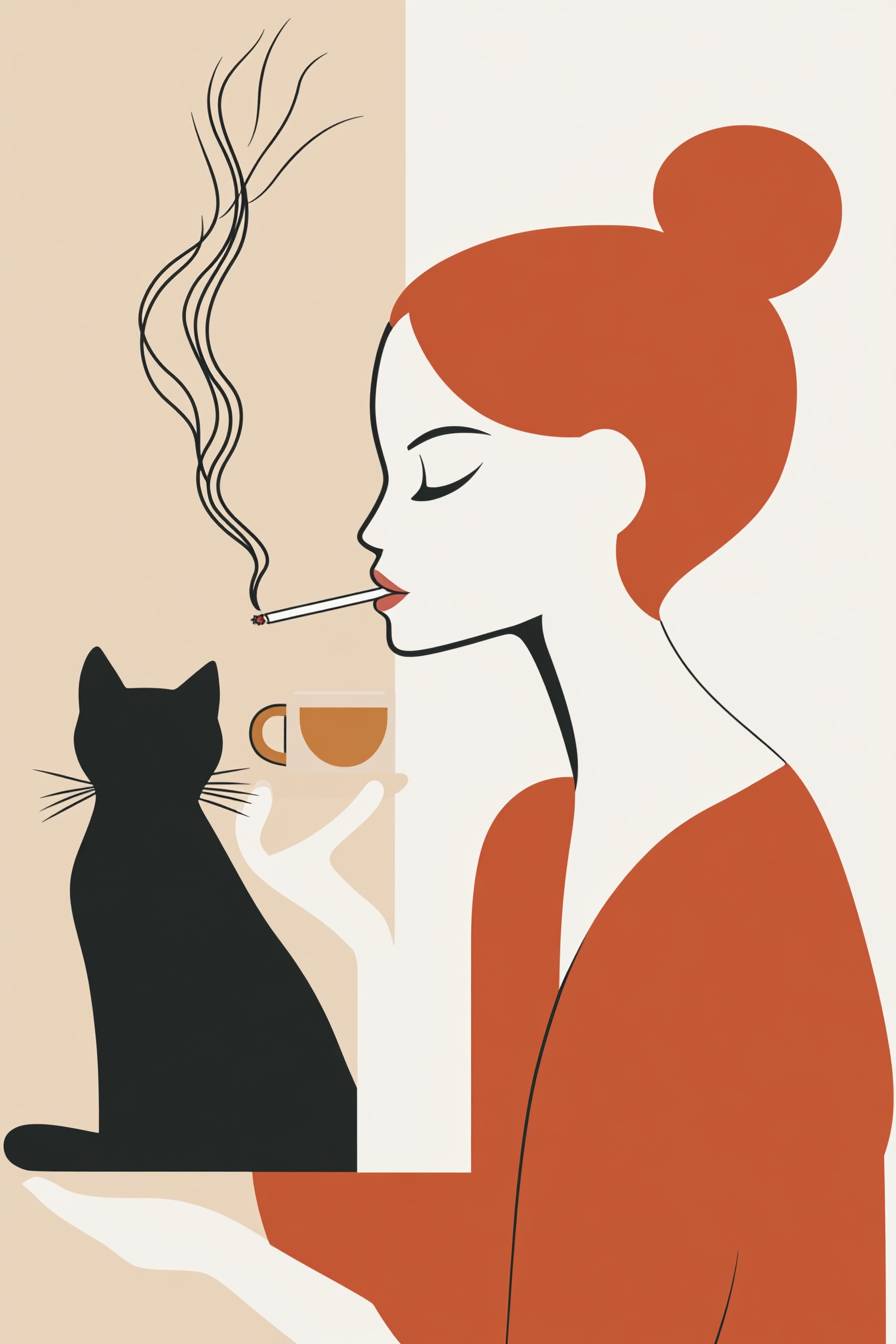 رسم توضيحي بتصميم مسطح بسيط لامرأة تحمل سيجارة وإسبرسو وبمرافقة قط أسود.