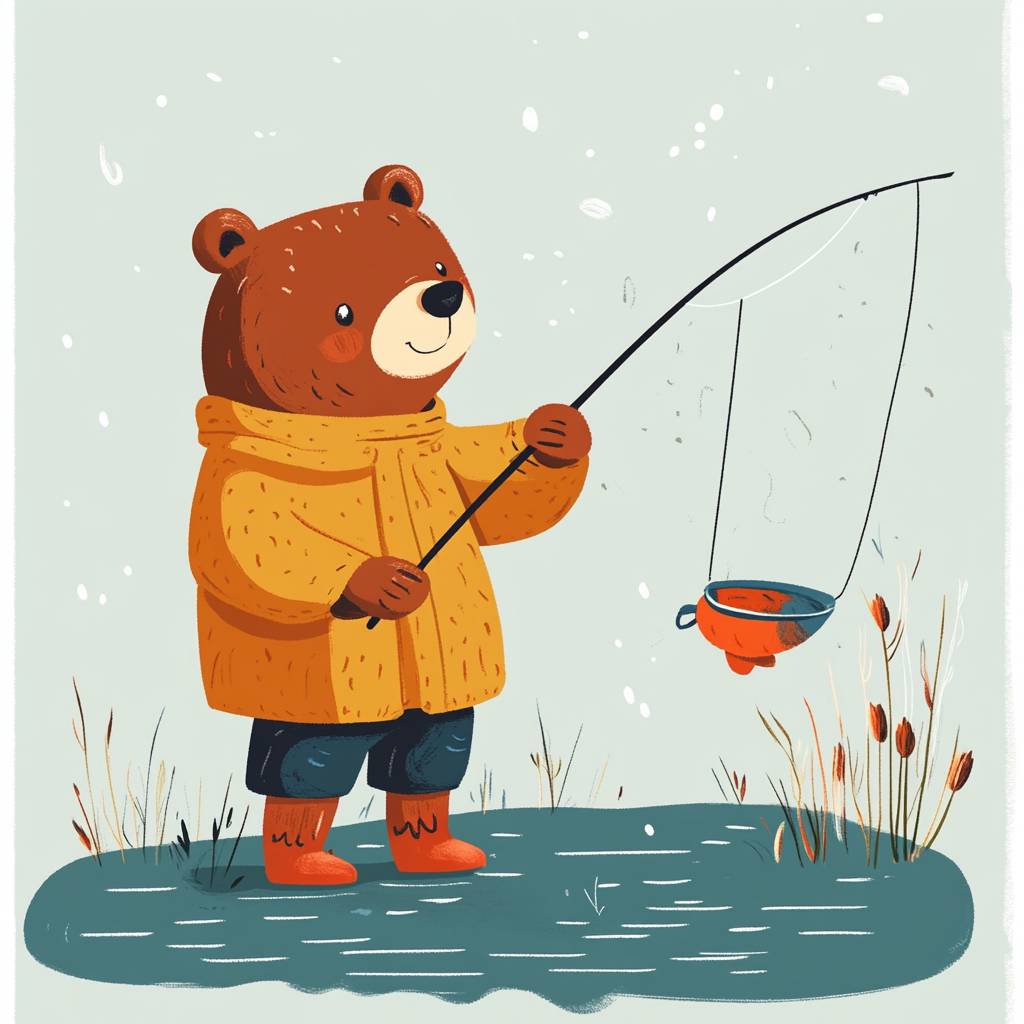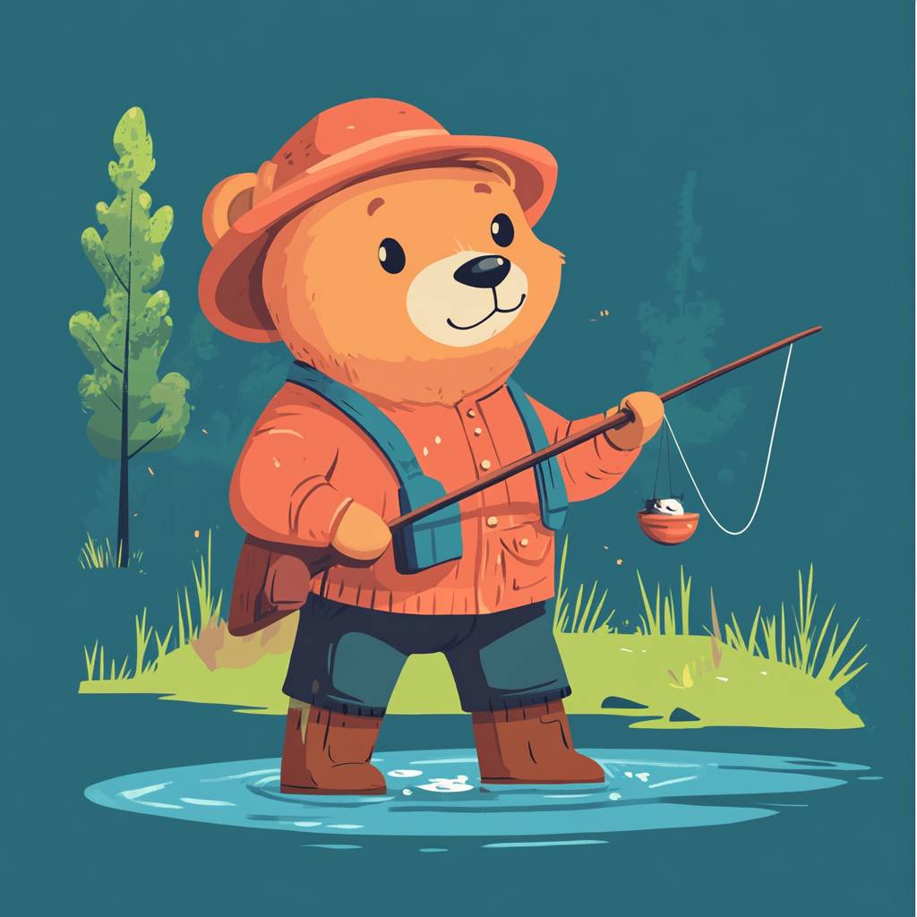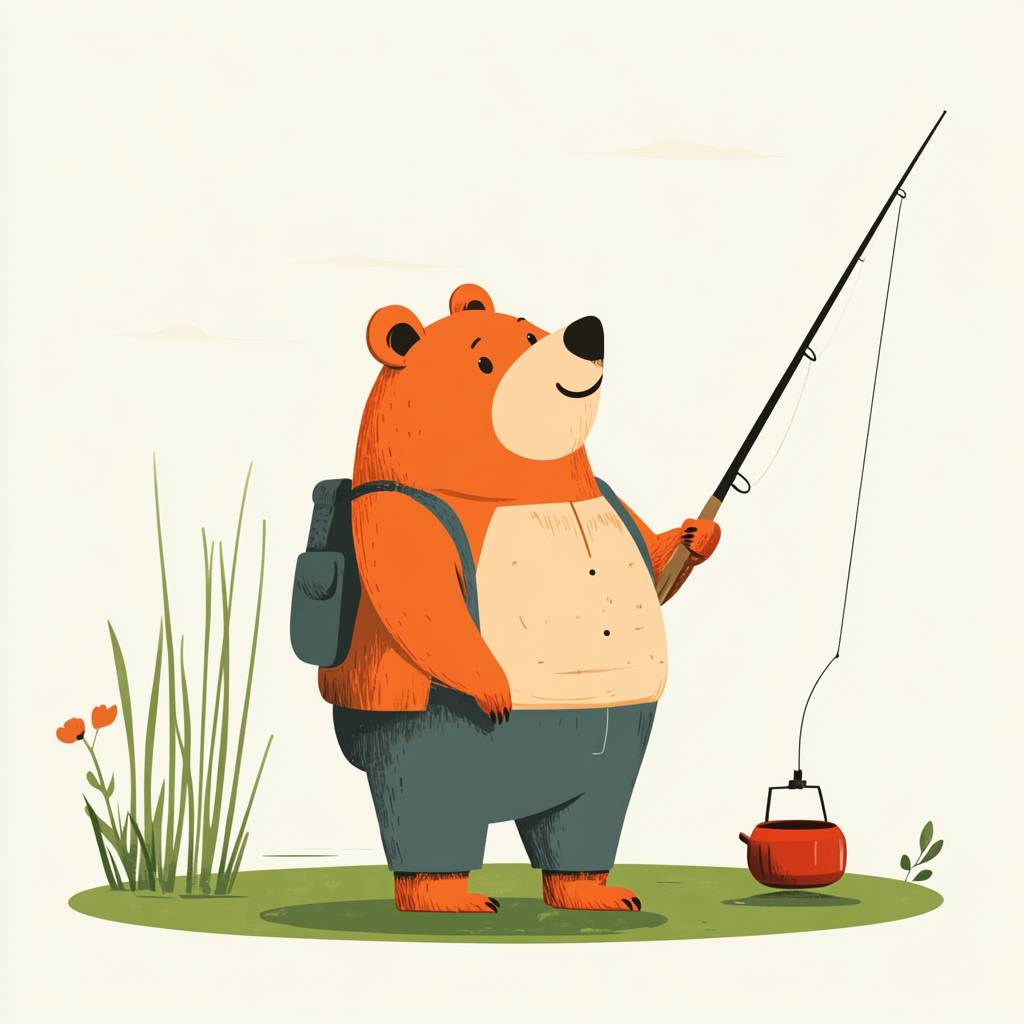 شخصية دب تشبه الإنسان تصطاد في أسلوب بسيط للأطفال.