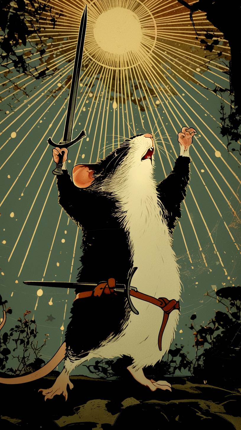 طبعة خشبية من العصور الوسطى تصور فأراً كفارس من العصور الوسطى يحمل سيفاً عالياً في الهواء، رسم بسيط بالألوان مع خطوط سوداء، طباعة مسطحة.