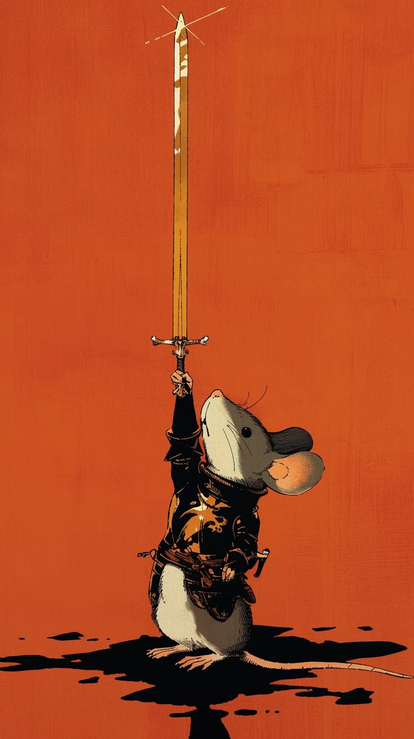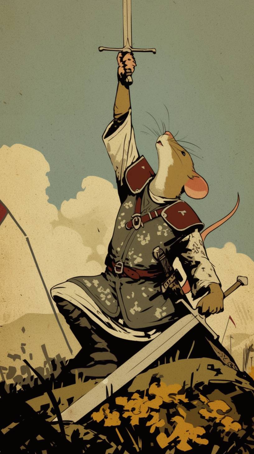 A medieval woodcut of a mouse as a medieval knight raising a sword high in the air, a simple color illustration with black lines, a flat print. --ar 9:16 --stylize 250 --niji 6 --style raw