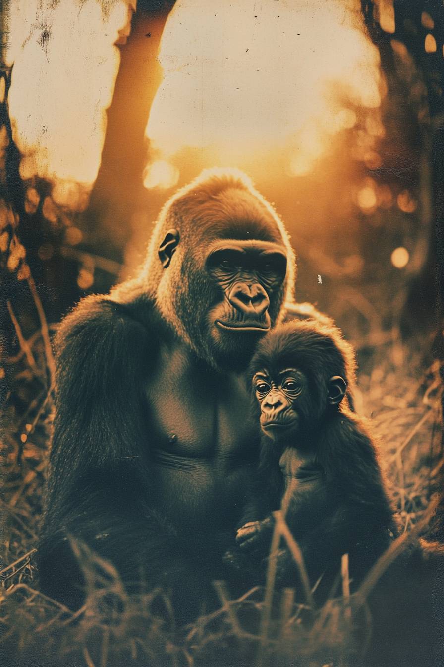 بورتريه عفوي تم التقاطه بواسطة بولارويد، صورة بالأبيض والأسود، إضاءة سينمائية، تباين قوي، غوريلا صديقة مع غوريلا صغيرة، شعاع دافئ من الضوء البرتقالي-الذي يسلط الضوء على الاثنين، جمالية فيلم أنالوج تالف.