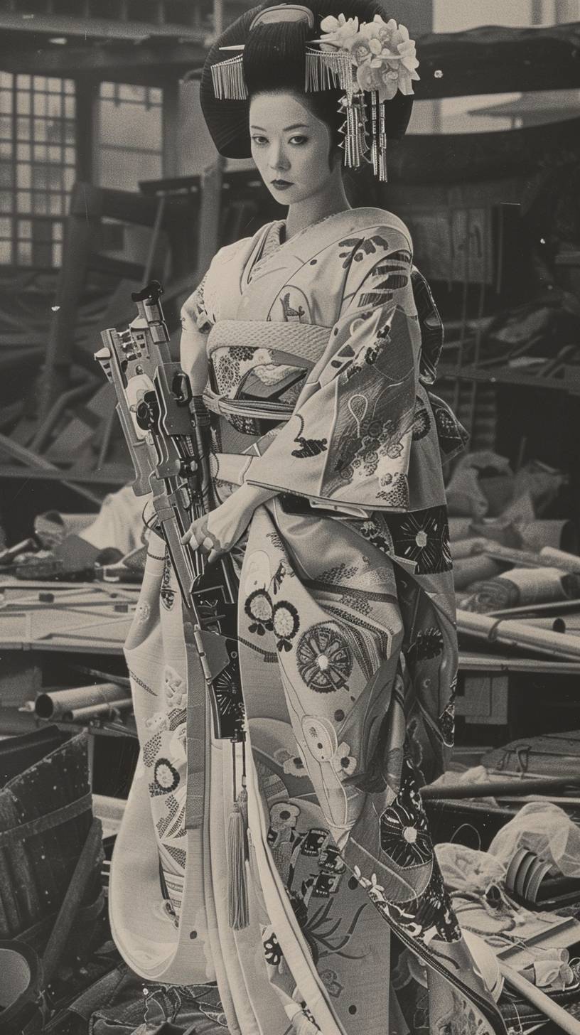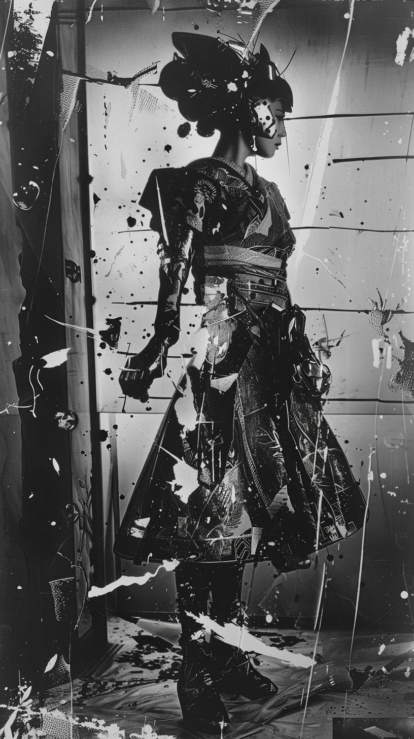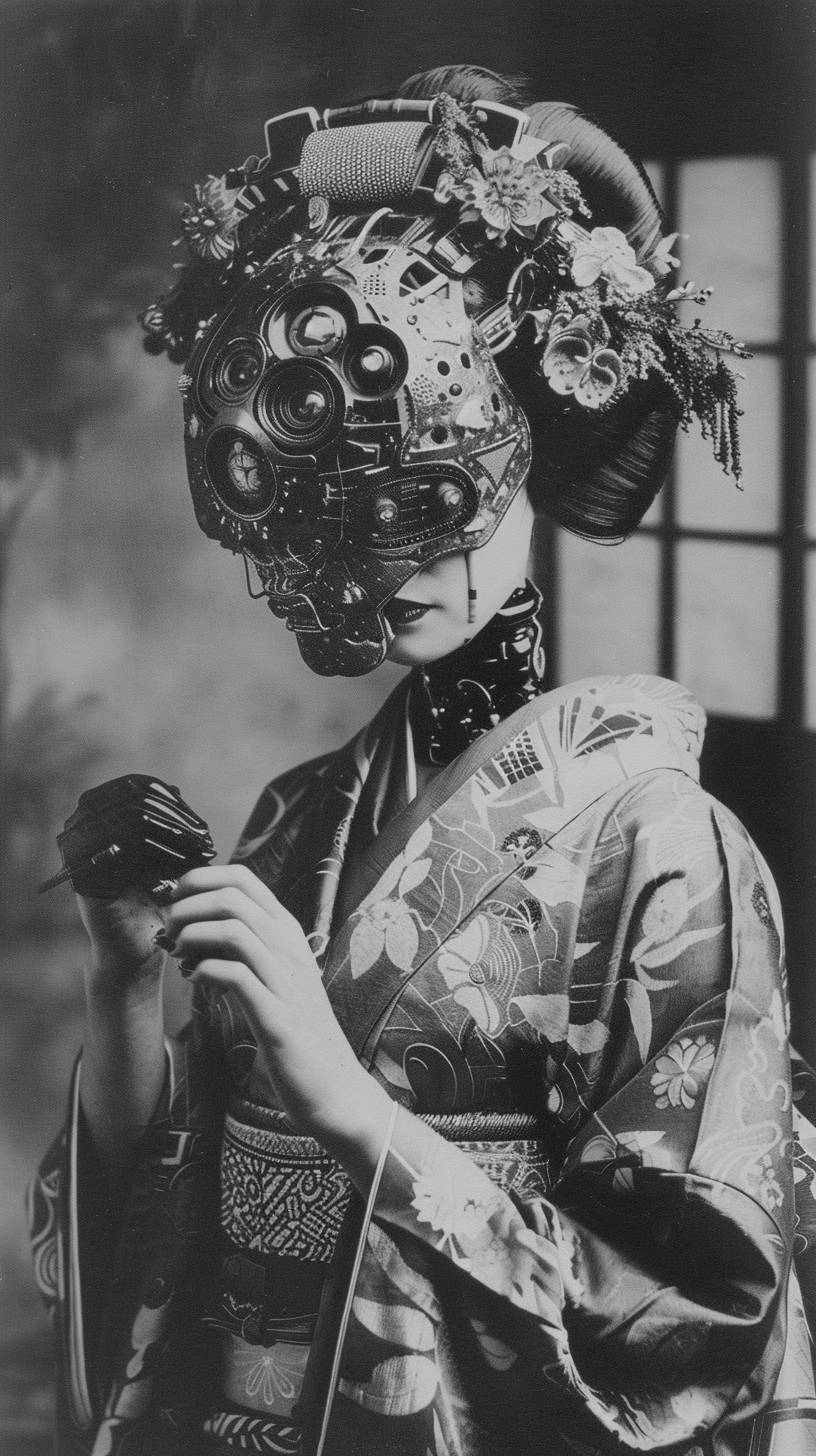 تصوير فيليتش بياتو الأسود والأبيض يصور الجيشا-روبوت السايبربانك من فيلم 'شبح في الدرع'.