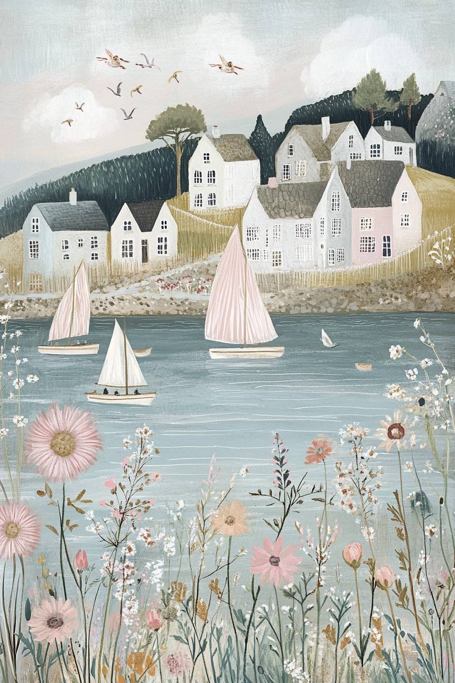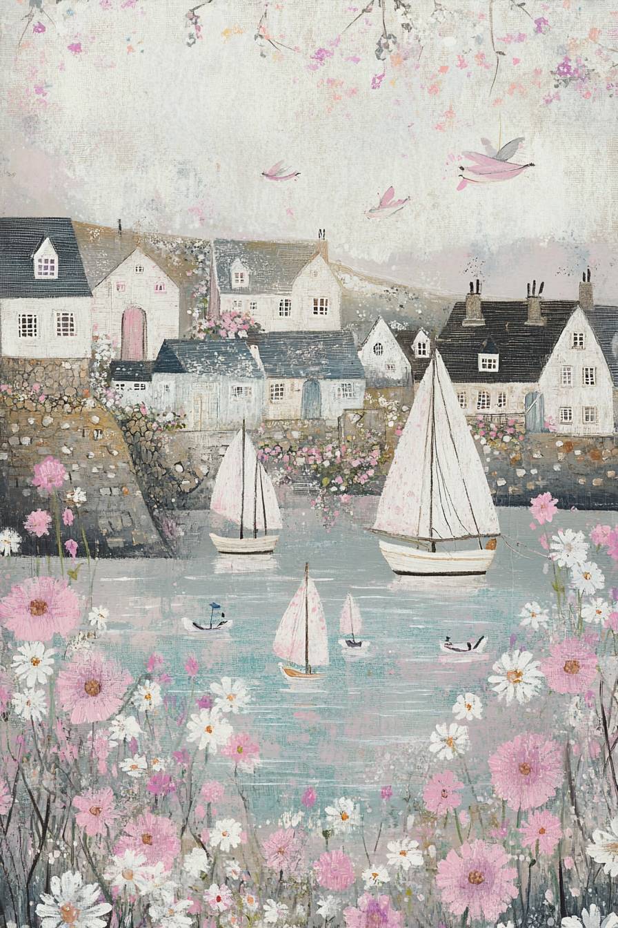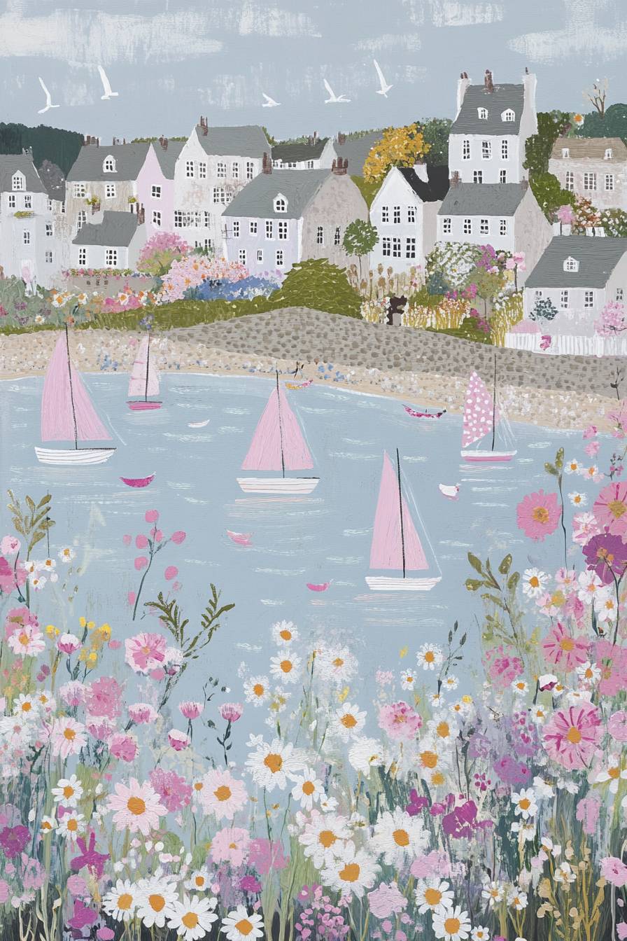 لوحة depicting القوارب على الماء مع منازل وزهور في المقدمة، بأسلوب لوسي جروسميث. توضح الرسوم التوضيحية تفاصيل مطلية يدويًا، مع الشخصيات التي ترتدي اللون الوردي. تمثل المشهد إطلالة بحرية هادئة، مصورة بألوان الباستيل. اللوحة محاطة بإطار أبيض، موضوعة على خلفية رمادية ناعمة.