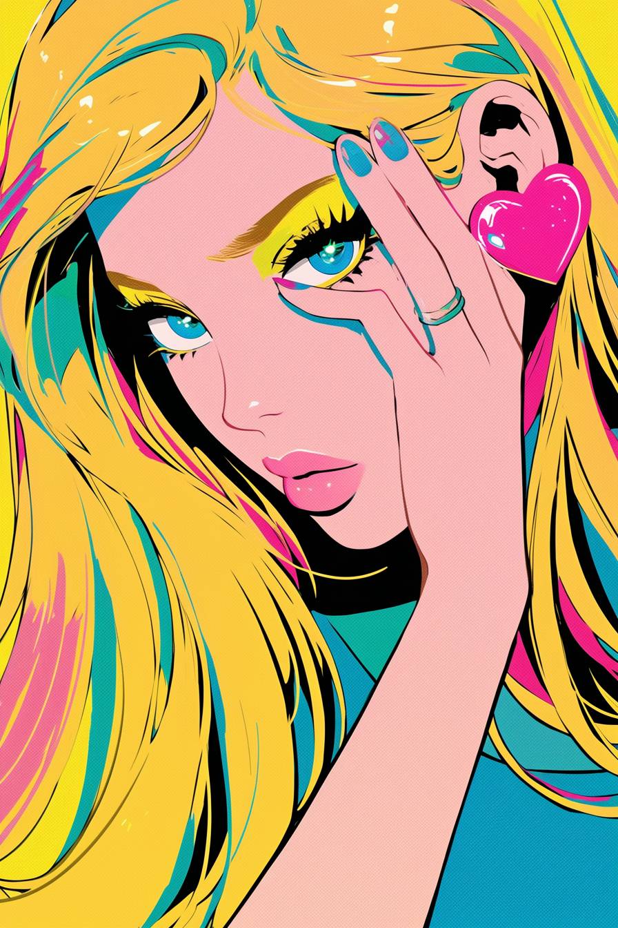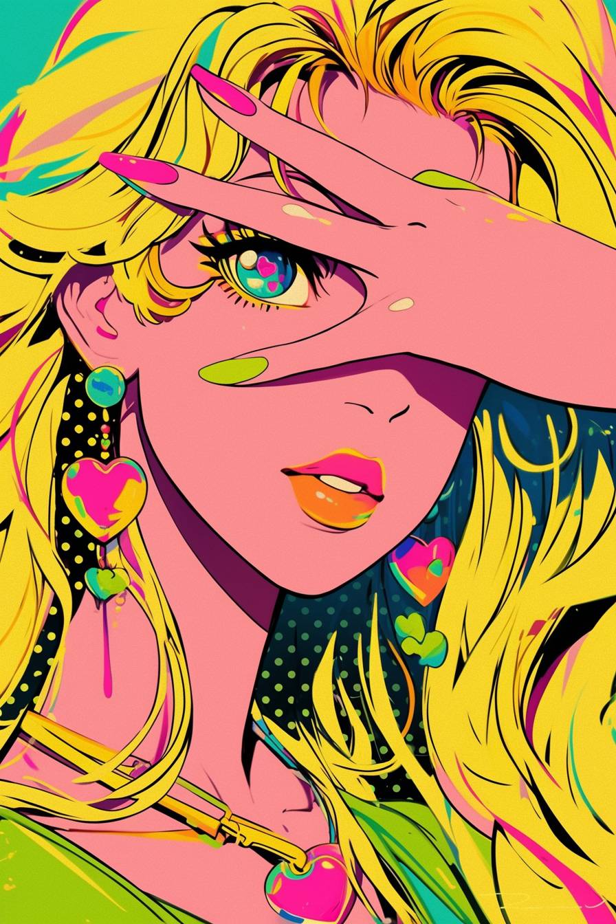 فن البوب المرسوم بأسلوب مانغا عتيقة من الثمانينيات لامرأة جذابة ذات شعر أشقر طويل، وحلقات على شكل قلب، وأحمر شفاه زاهي، تحمل وجهها أمام عينها بيد واحدة، بألوان زاهية من الوردي والأصفر والأخضر والأزرق.
