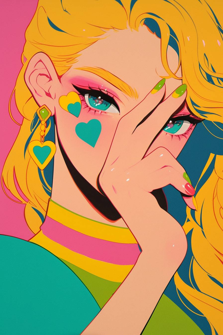 80s vintage manga-inspired cartoon pop art of an attractive woman with long blonde hair, heart-shaped earrings, and bright lipstick holding her face in front of her eye with one hand, vibrant colors of pink, yellow, green, and blue. --ar 2:3 --niji 6