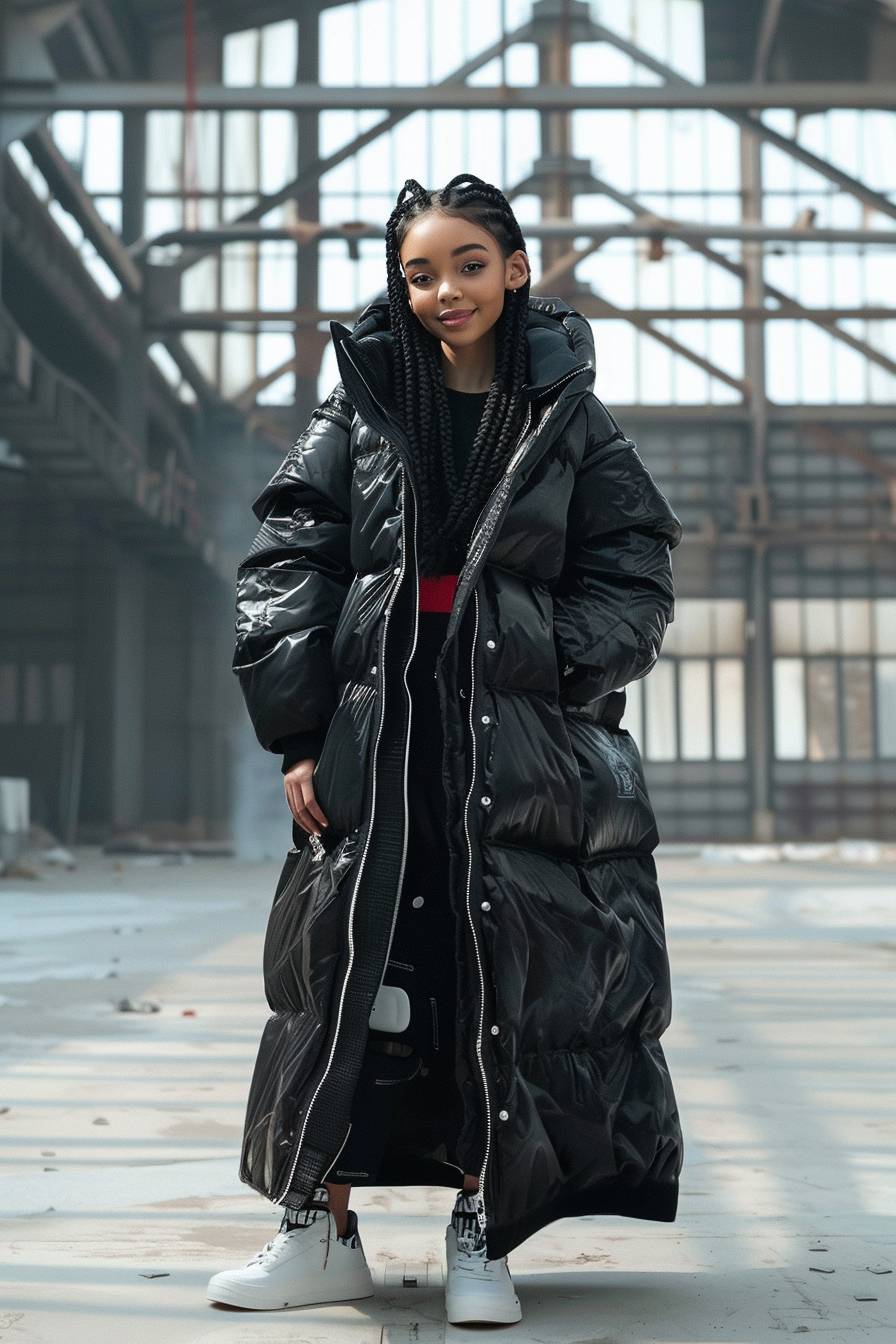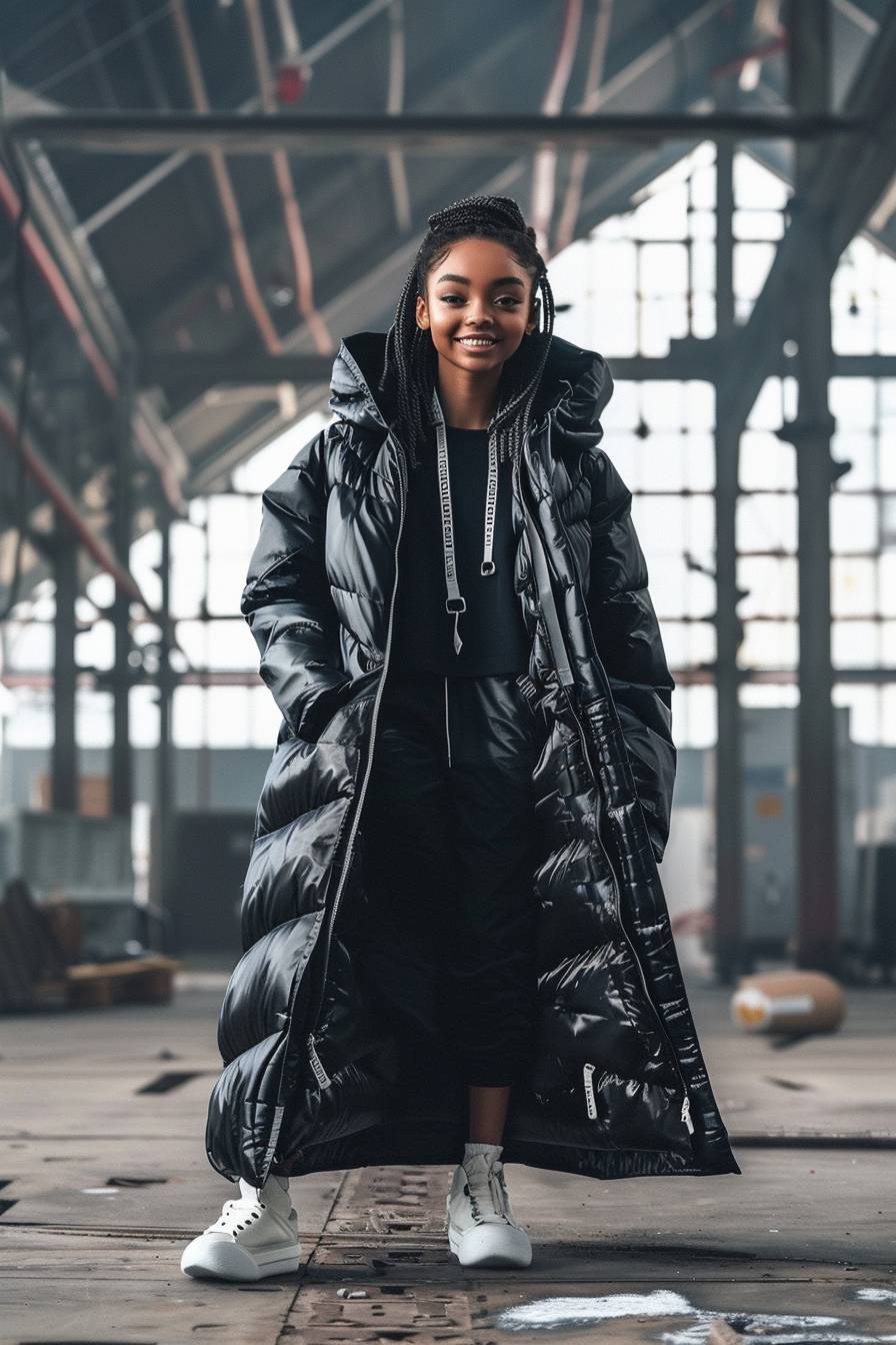 A model wearing an extremely long black puffer coat with hood, full body shot, oversized and boxy style for the jacket design, material exciting pattern in a style of stone island and white sneakers, She is smiling at the camera, background a wide open industrial futuristic interior, Sunny Daylight, editorial picture, hyper realistic, --ar 2:3 --cref <https://s.mj.run/TXQnkfdoLjM> --cw 0 --v 6.0