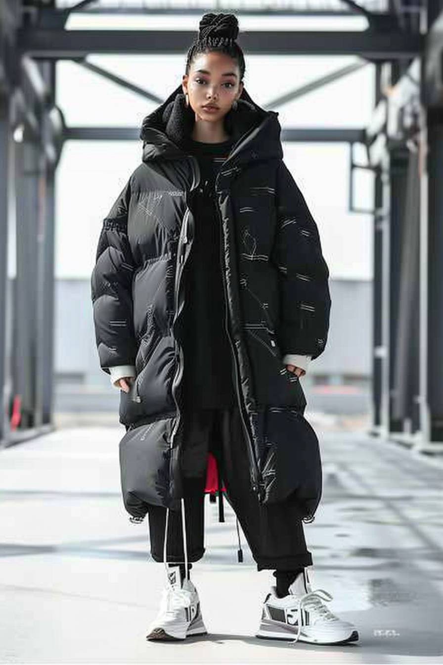 عارضة ترتدي معطف من down أسود طويل للغاية مع غطاء رأس، لقطة كاملة للجسم، أسلوب كبير وصندوقي لتصميم المعطف، مادة تتميز بنمط مثير على طراز ستون أيلاند وأحذية رياضية بيضاء. إنها تبتسم للكاميرا، مع خلفية من داخل صناعي مستقبلي مفتوح على مصراعيه، في يوم مشمس، صورة تحريرية، فائقة الواقعية.