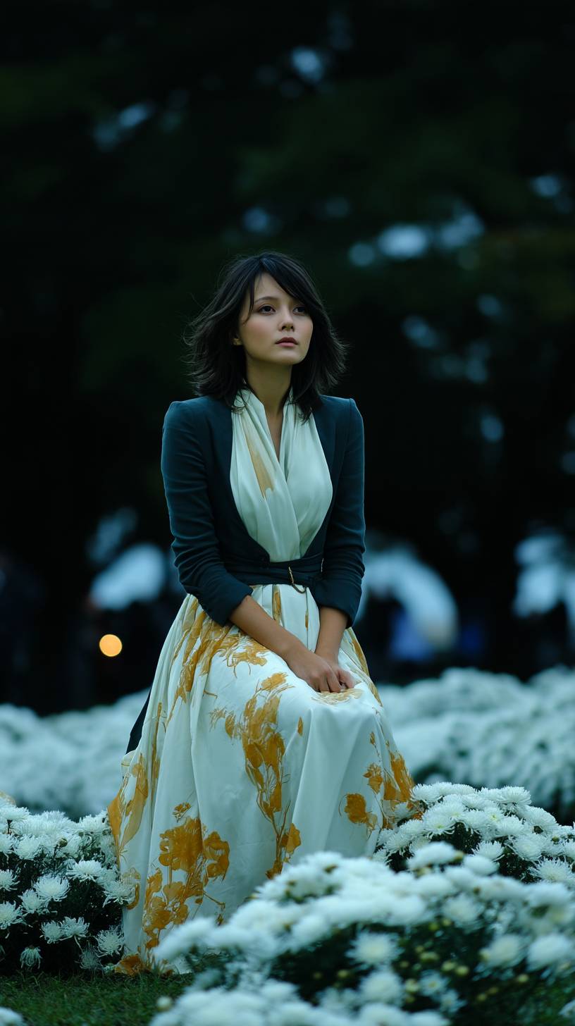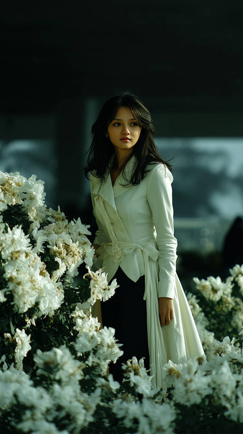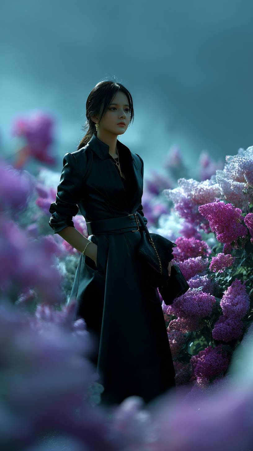 صورة سينمائية شعرية لعارضة كورية في الطبيعة بين الأزهار.