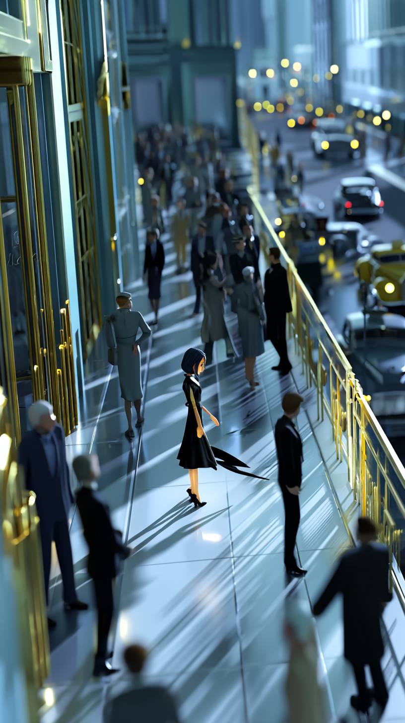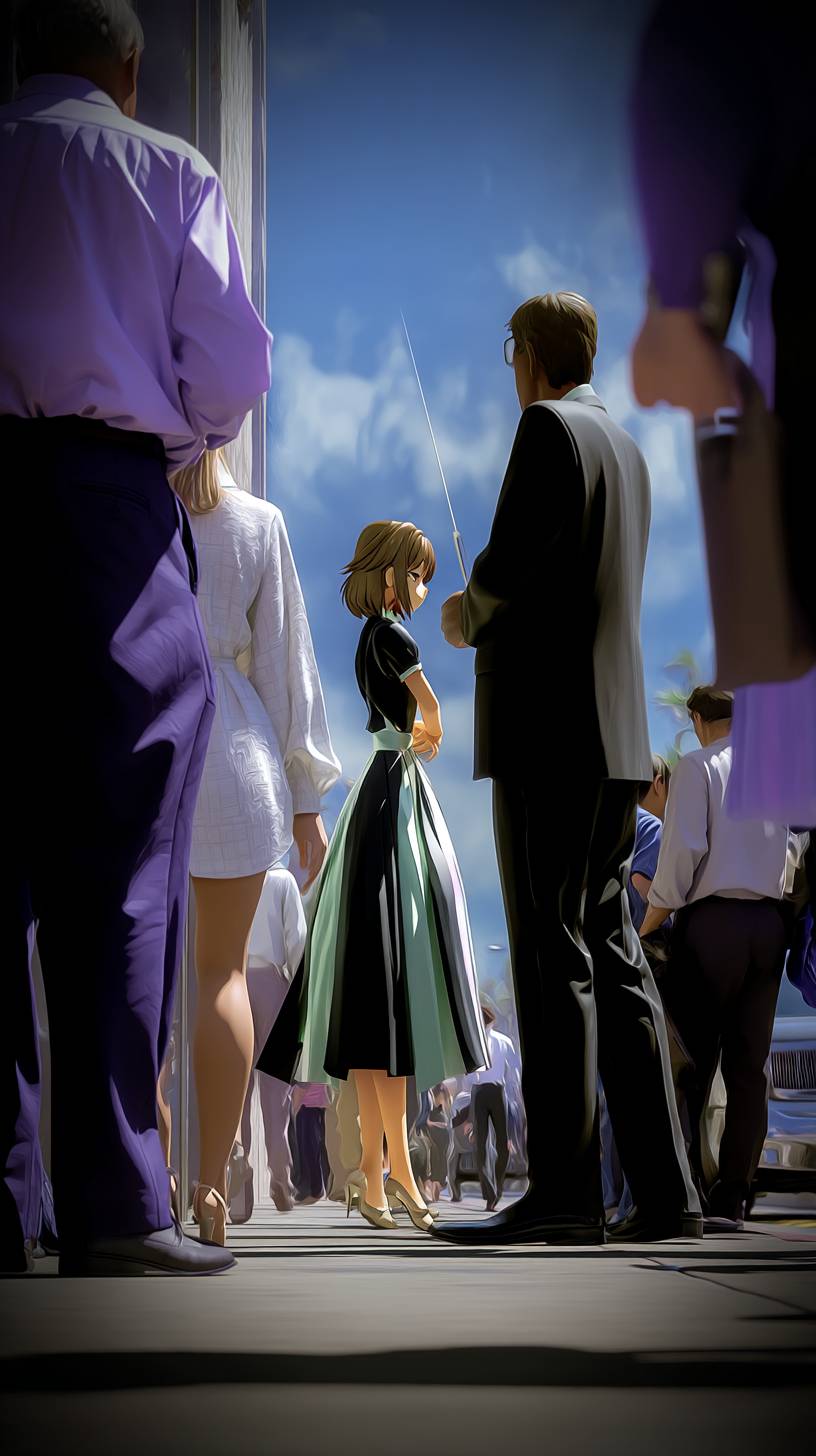 A tiny Pixar-style girl, super small and cartoonish with big expressive eyes, stands nervously on a busy sidewalk. Around her, gigantic hyper-realistic pedestrians walk by, their detailed clothing, wrinkles, and textures rendered in cinematic ultra-realism. The contrast between the small stylized girl and the massive photorealistic humans creates a surreal, dramatic scene. Movie-quality lighting, depth of field, and atmospheric perspective. Ultra HD, 8K, photorealistic details, cinematic composition --chaos 40 --ar 9:16 --raw --v 7.0 --s 750 --p semv7u6